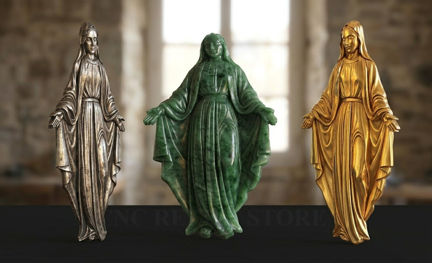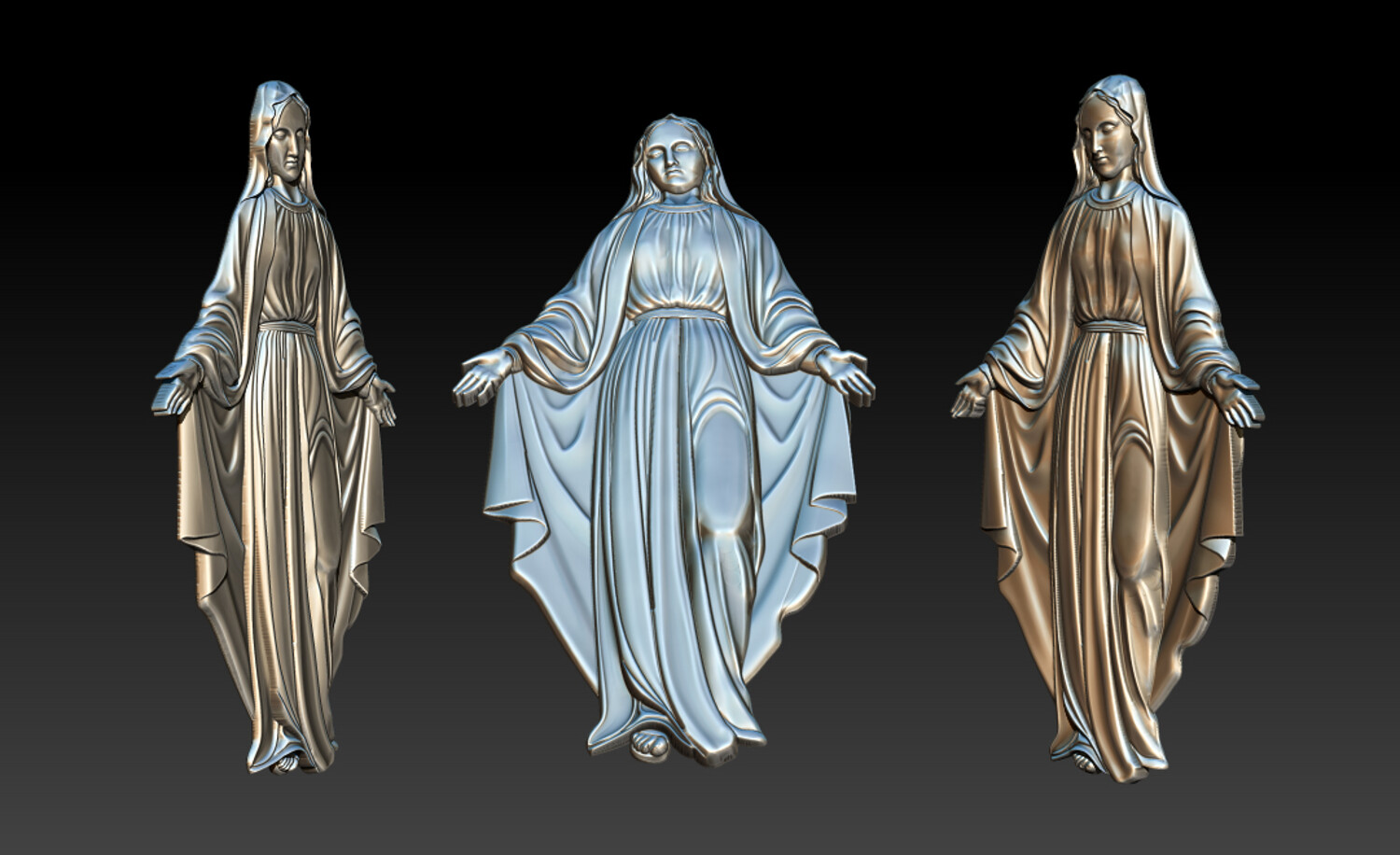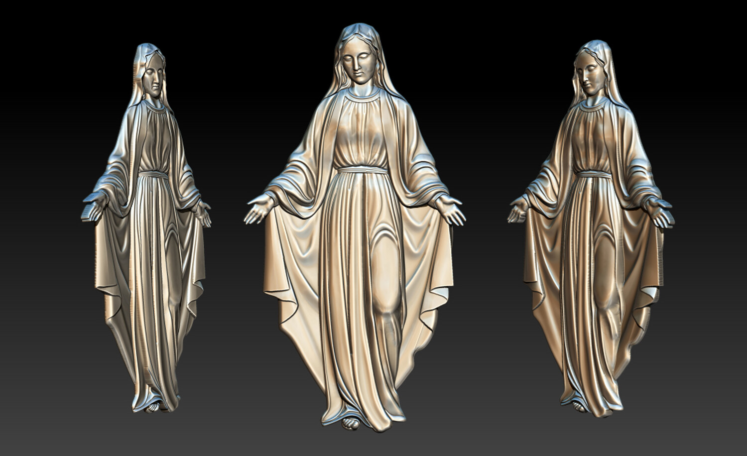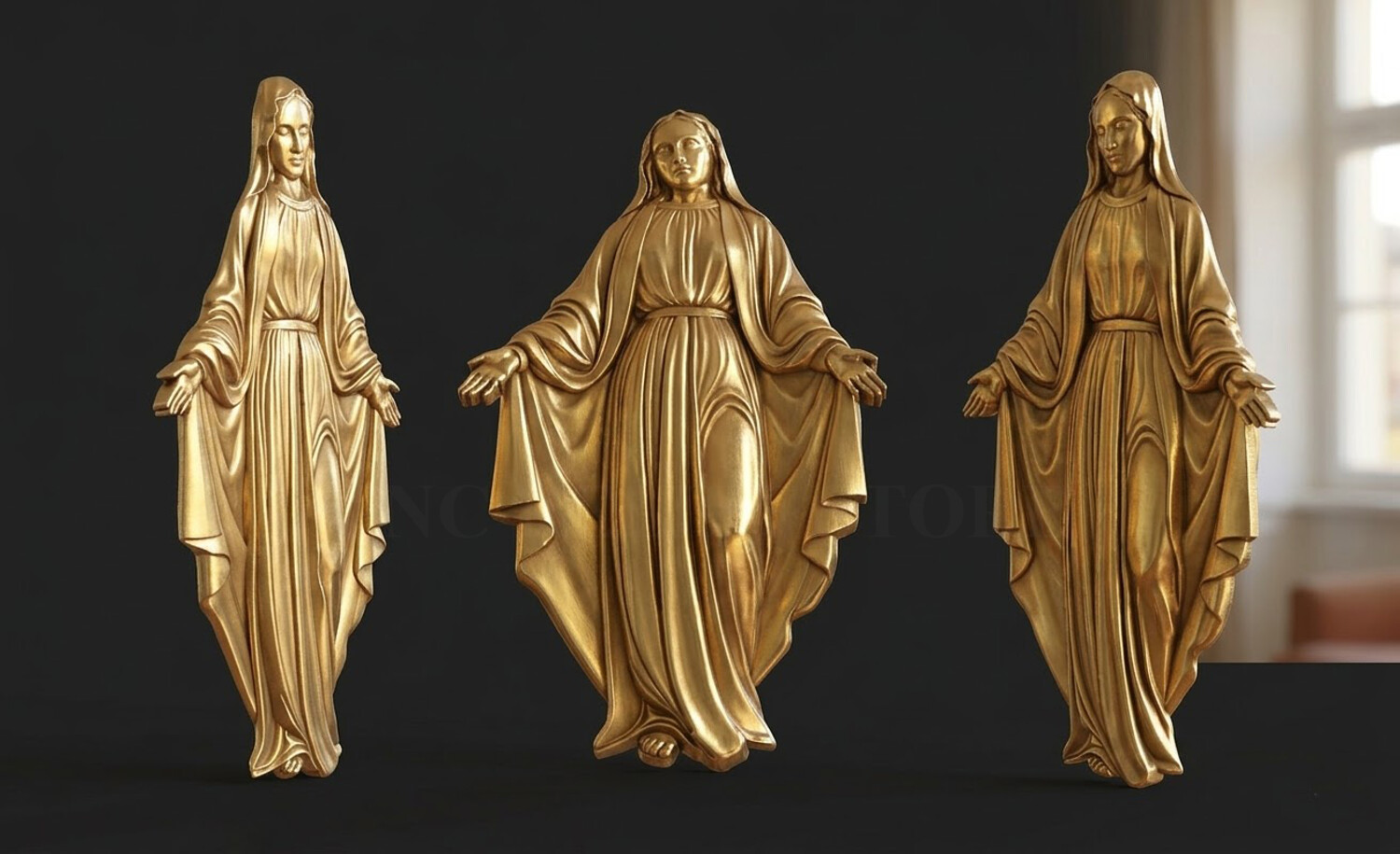 Virgin Mary Relief – 3D Model for CNC Carving and Religious Art This Virgin Mary 3D Relief Model presents a graceful and serene representation of the Blessed Mother with open arms, symbolizing love, compassion, and divine protection. The sculpture features beautifully flowing robes with soft natural folds, carefully sculpted to create depth and elegance in the relief. The gentle expression and balanced posture convey peace and spiritual comfort, making this design perfect for religious artworks and sacred decorations. Every detail has been crafted to ensure clean carving results and smooth surfaces, making the model ideal for both CNC machining and high-resolution 3D printing. This design is perfect for creating religious wall art, church decorations, memorial plaques, and devotional sculptures.