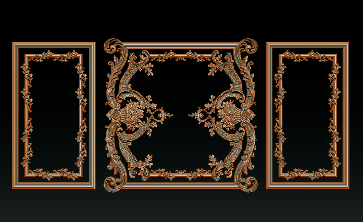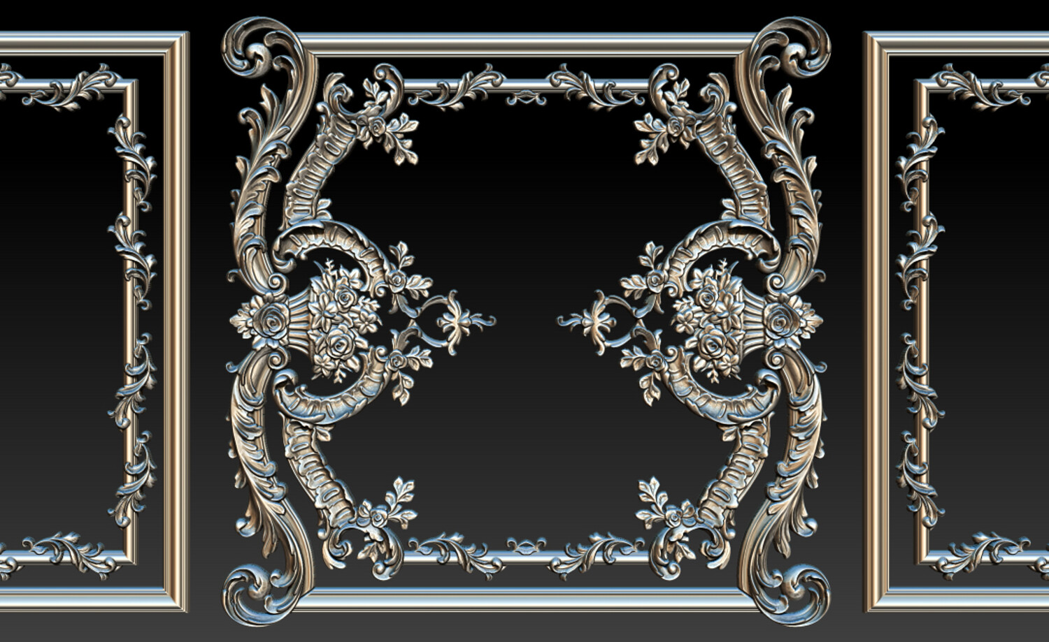 Ornamental Relief CNC Model for Wooden Doors and Wall Panels This Ornamental Relief features a refined European classic / Baroque design, with a symmetrical layout, flowing scrolls, and richly detailed floral elements. The relief depth is carefully balanced to ensure clean carving results and a strong three-dimensional appearance.