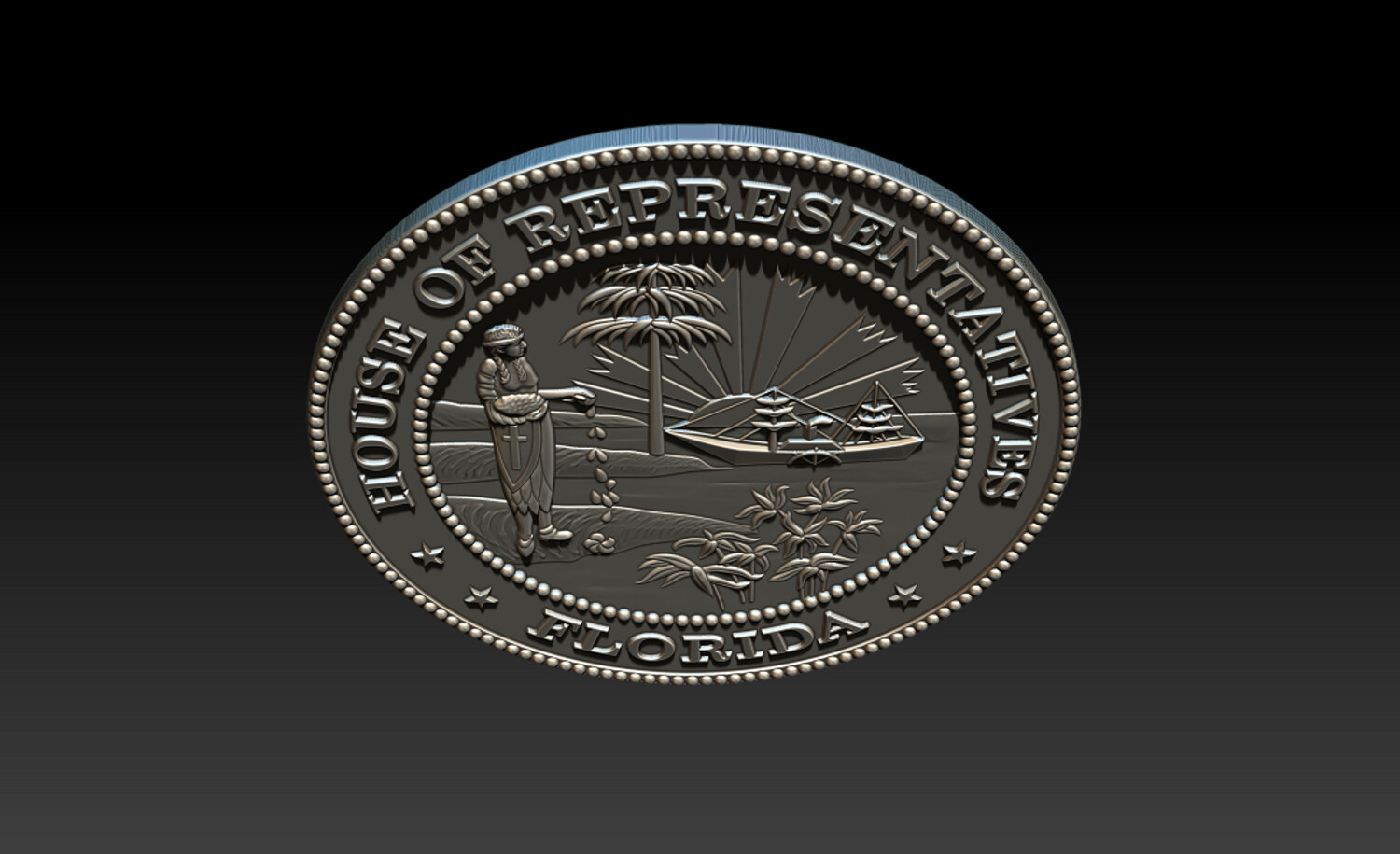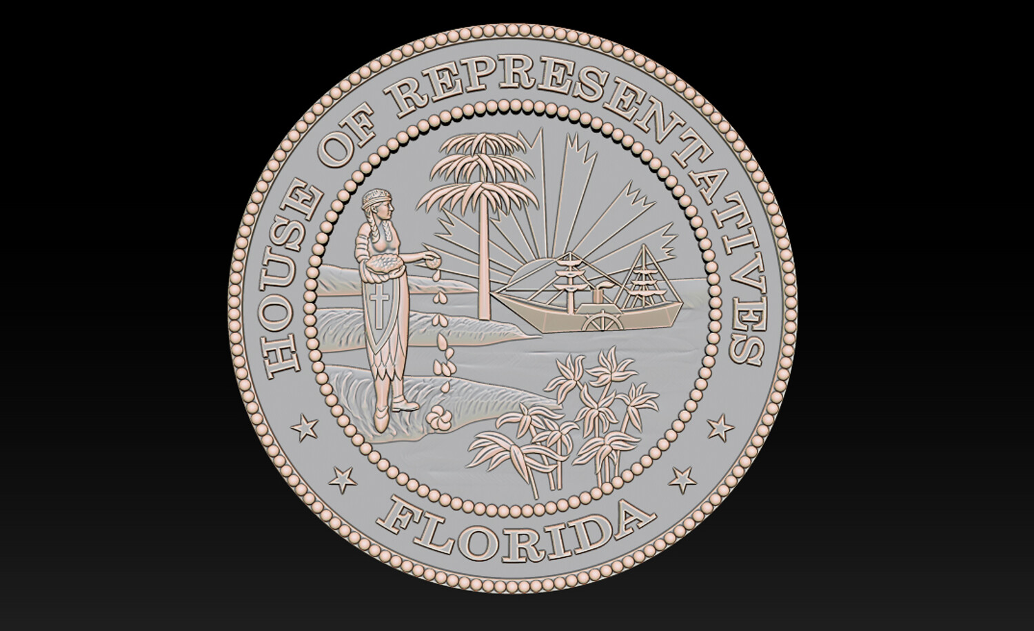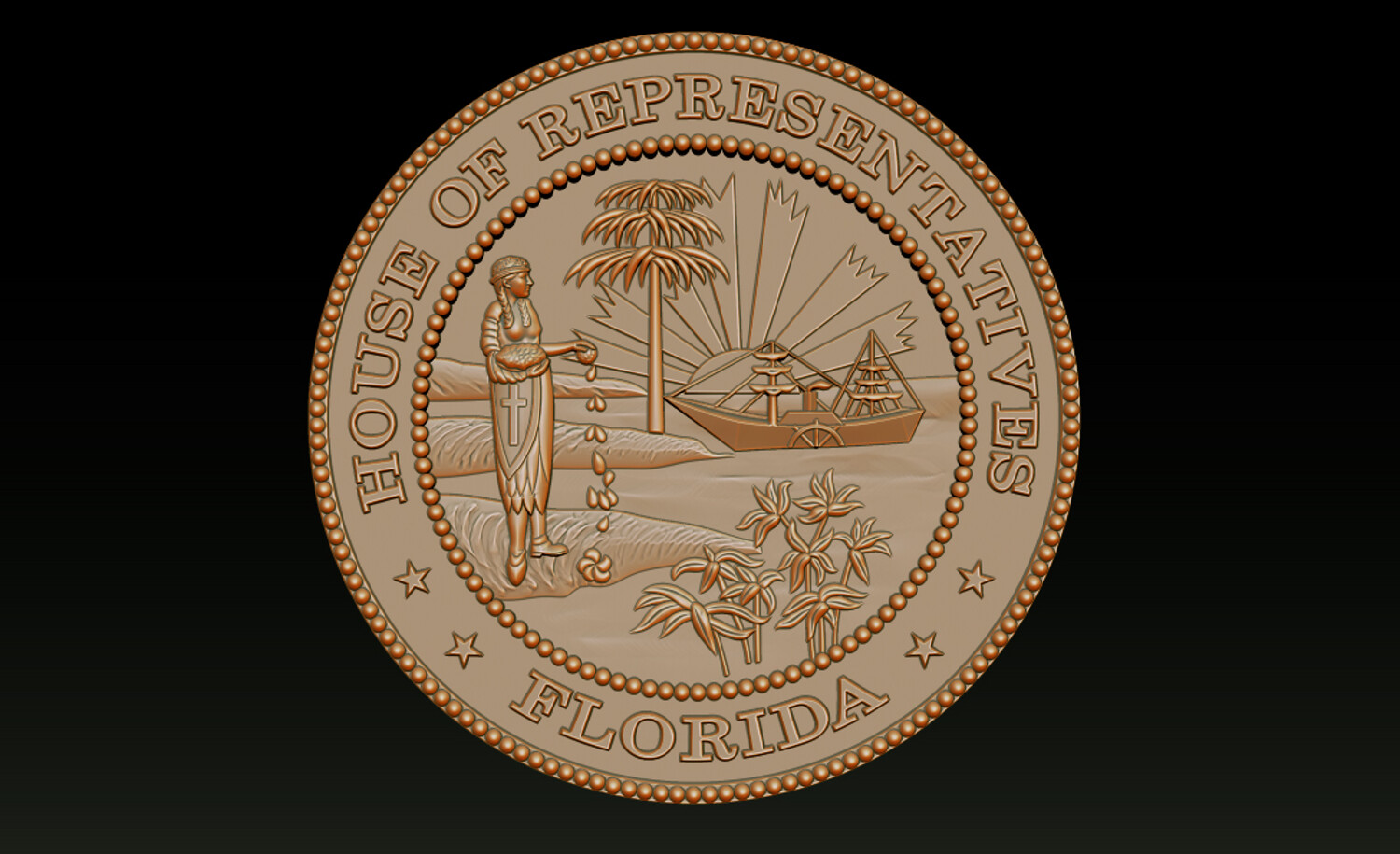 Premium 3D relief model of the Florida House of Representatives seal, designed for CNC carving, engraving, and jewelry applications. High detail, production-ready, and optimized for professional use.
