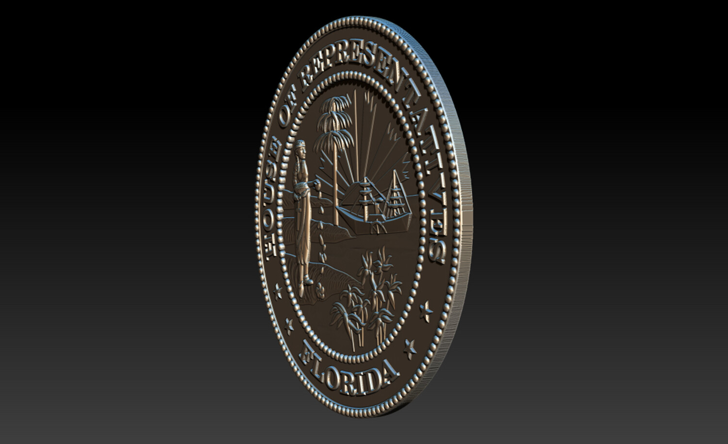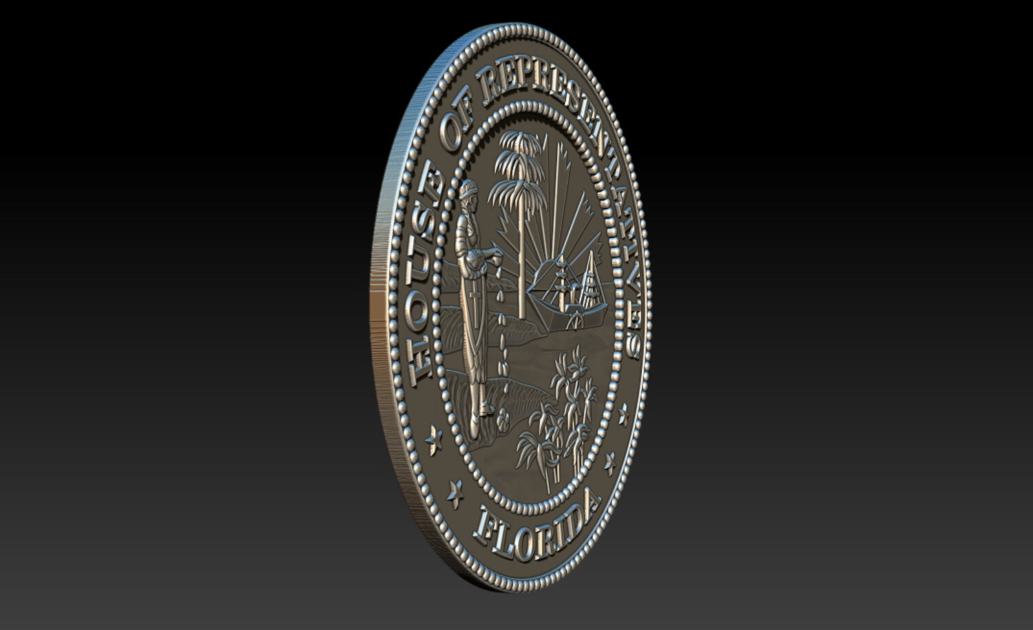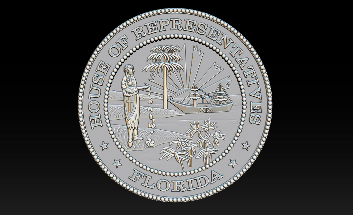 Premium 3D relief model of the Florida House of Representatives seal, designed for CNC carving, engraving, and jewelry applications. High detail, production-ready, and optimized for professional use.