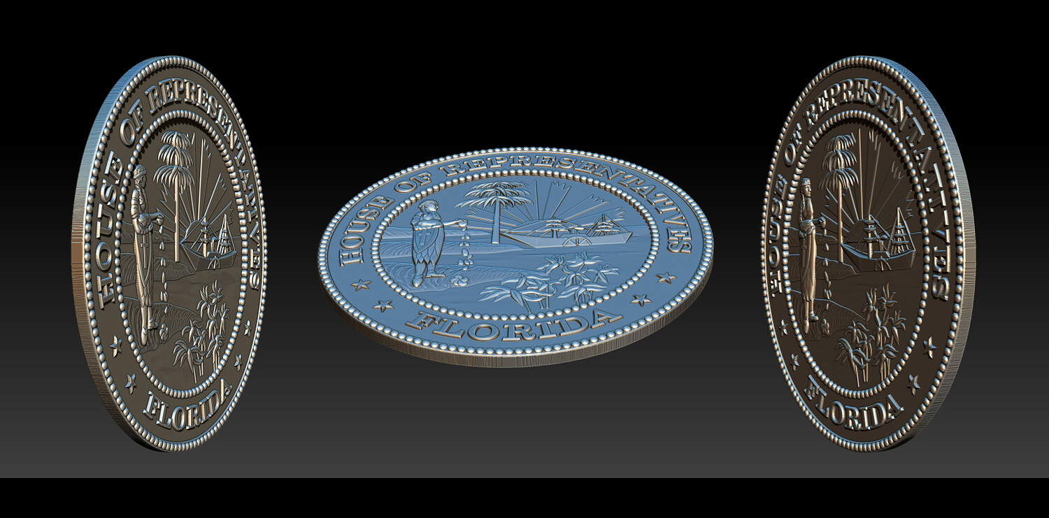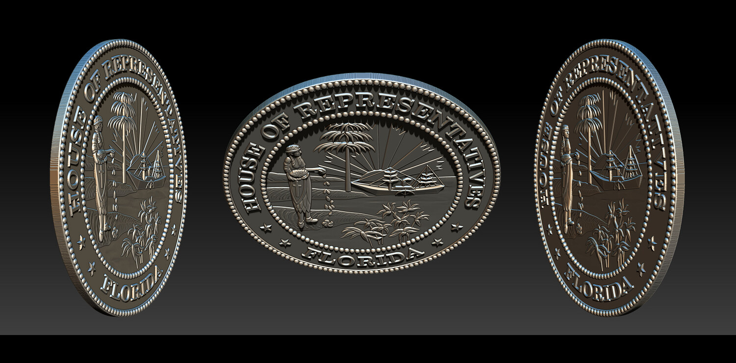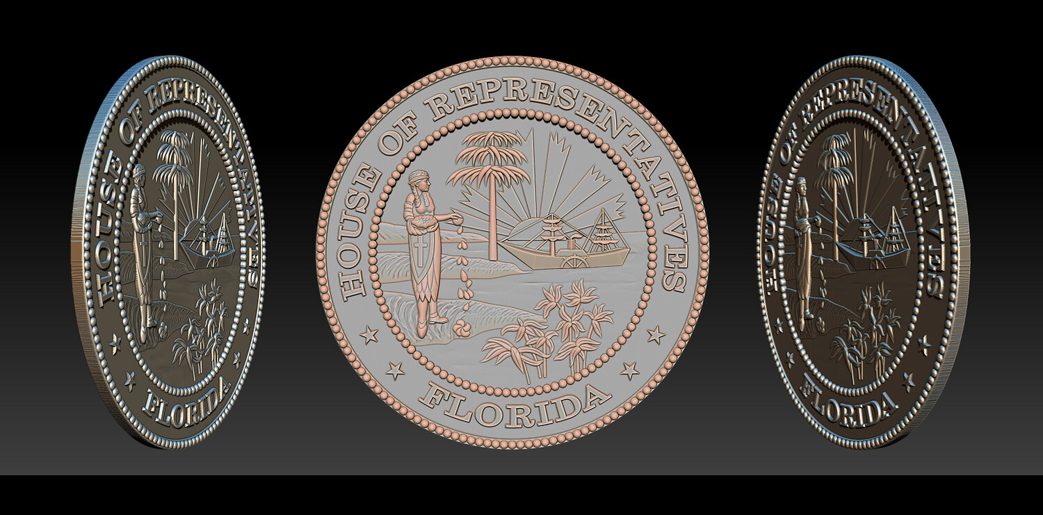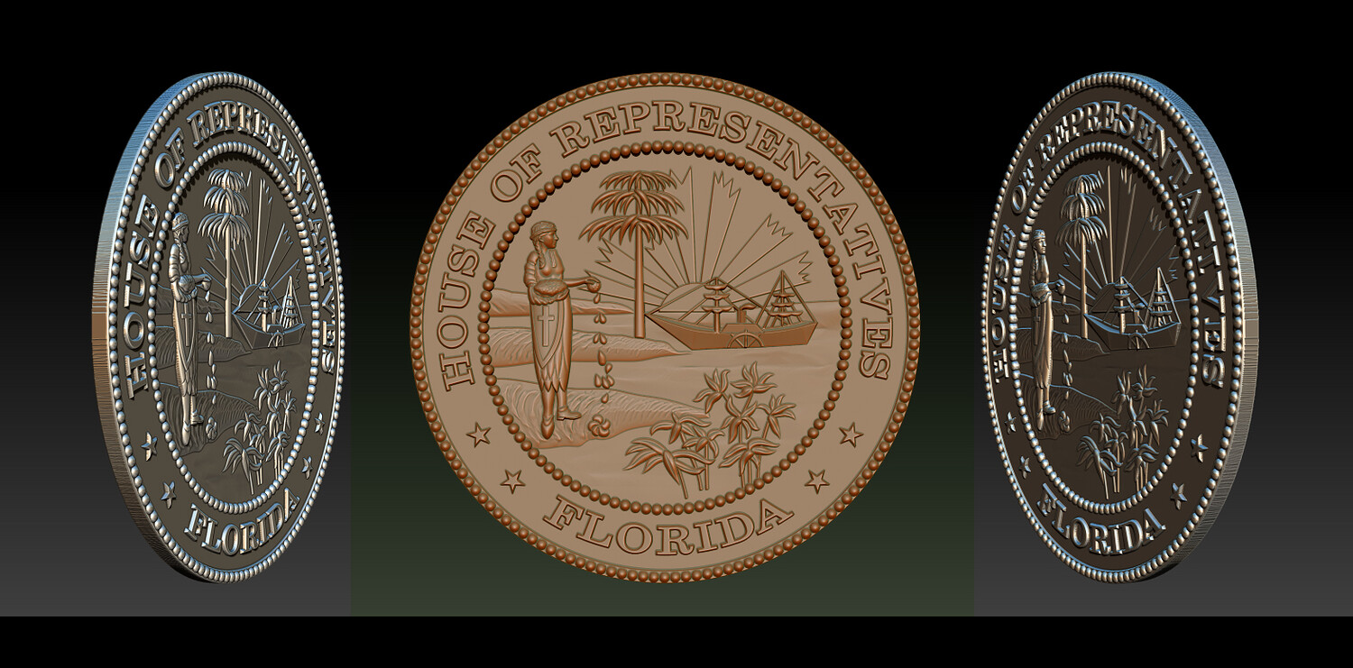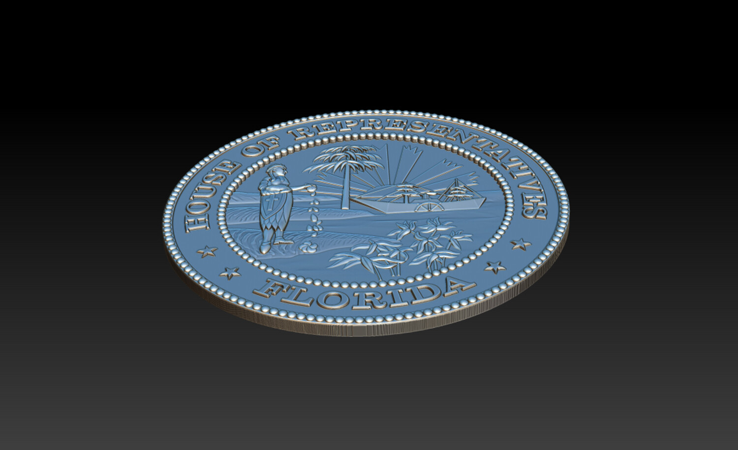 Florida House of Representatives Seal – High Detail 3D Relief Model for CNC & Jewelry This is a high-detail 3D relief model inspired by the official Florida House of Representatives seal, carefully designed for CNC routing, relief carving, and metal or wood engraving. The model features classic American emblem elements, including a standing figure, palm trees, sailing vessel, radiant sun, and ornamental bead borders — all optimized for clean toolpaths and sharp relief depth.