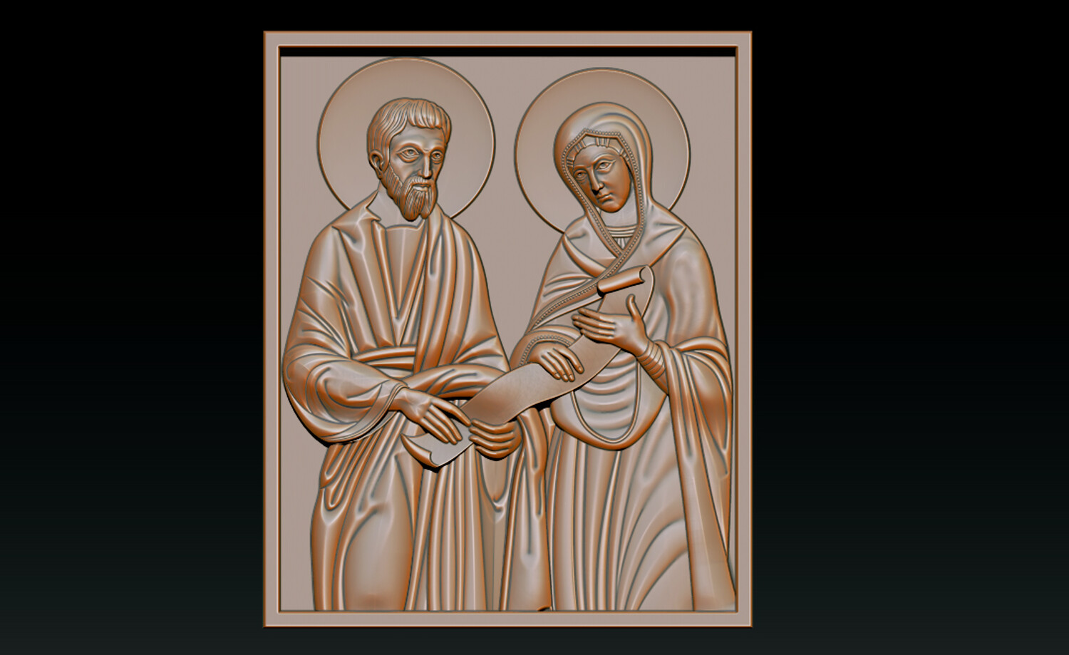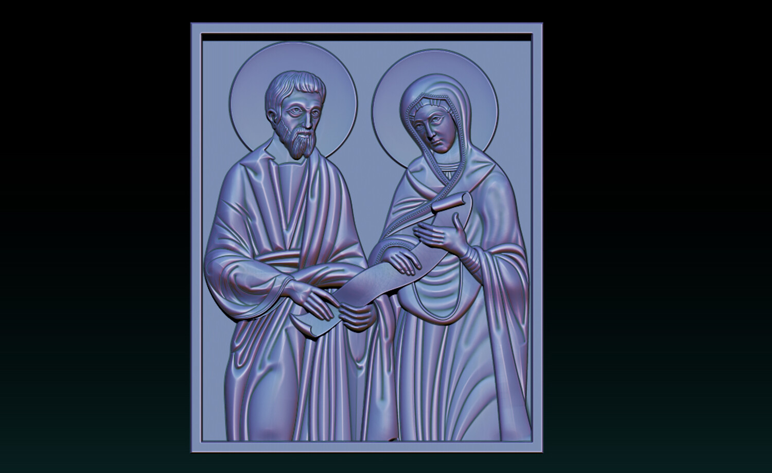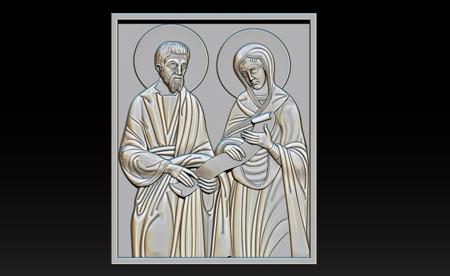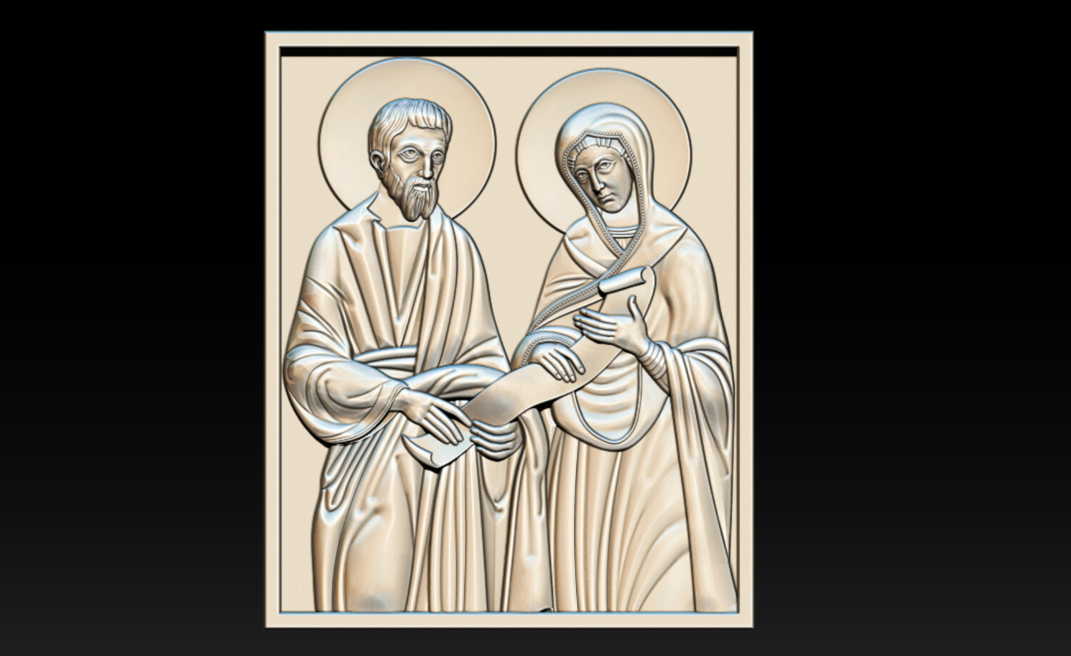 Joachim and Ana Changings – Sacred Christian Relief 2.5D Model (CNC & 3D Print Ready) This refined “Joachim and Ana Changings” relief model presents a sacred Christian scene inspired by traditional iconography, symbolizing faith, devotion, and divine guidance. The composition features: Two haloed holy figures in classical biblical attire A sacred scroll representing wisdom and spiritual teaching Harmonious square panel layout Soft, flowing drapery sculpted with balanced depth Clean background for precise CNC carving and printing The relief is carefully designed with smooth transitions and crisp detailing, ensuring excellent results in wood carving, resin printing, or decorative production.