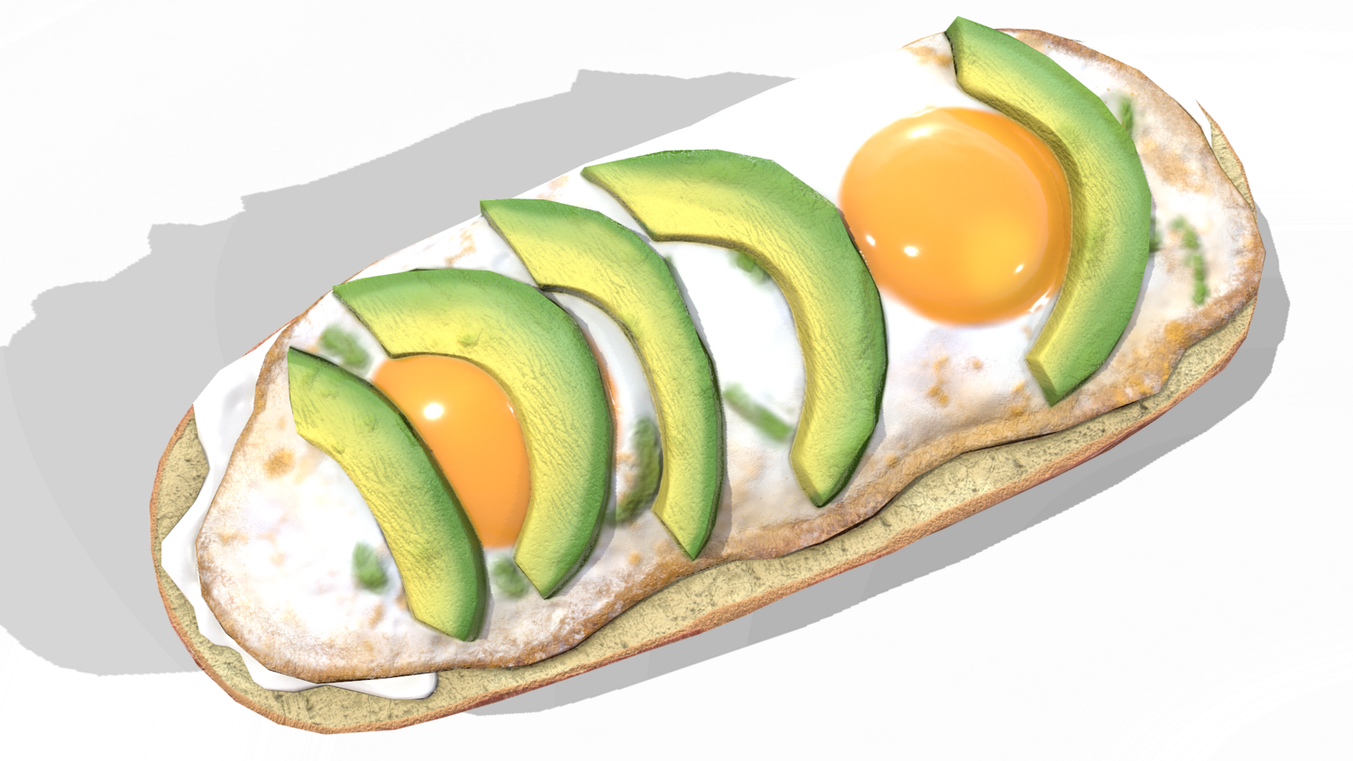 PBR Food Asset: Avocado Mollete Polycount: 1870 Vertex count: 995 Texture Size: 2048px x 2048px Normal: OpenGL