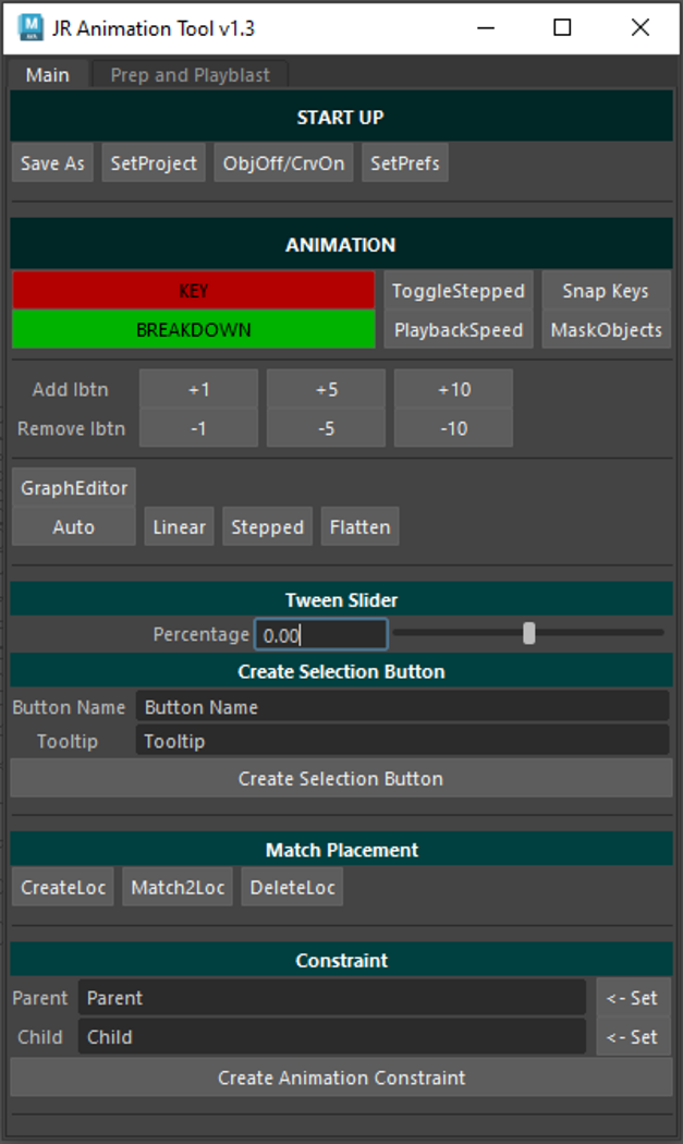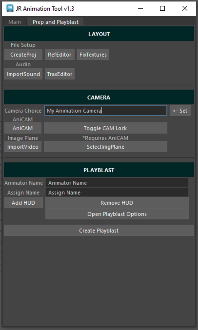 Update v 1.1 UI - Added Tabs to organize systems - Main tab contains commonly used functions (Start Up and Animation sections) - Prep and Playblast contains less common functions (Layout and Playblasting) Layout - Removed Flat Lighting button - Organized rows with common functions Playblast - Removed Playblast Encoding - Added Playblast Options button to open Options UI.