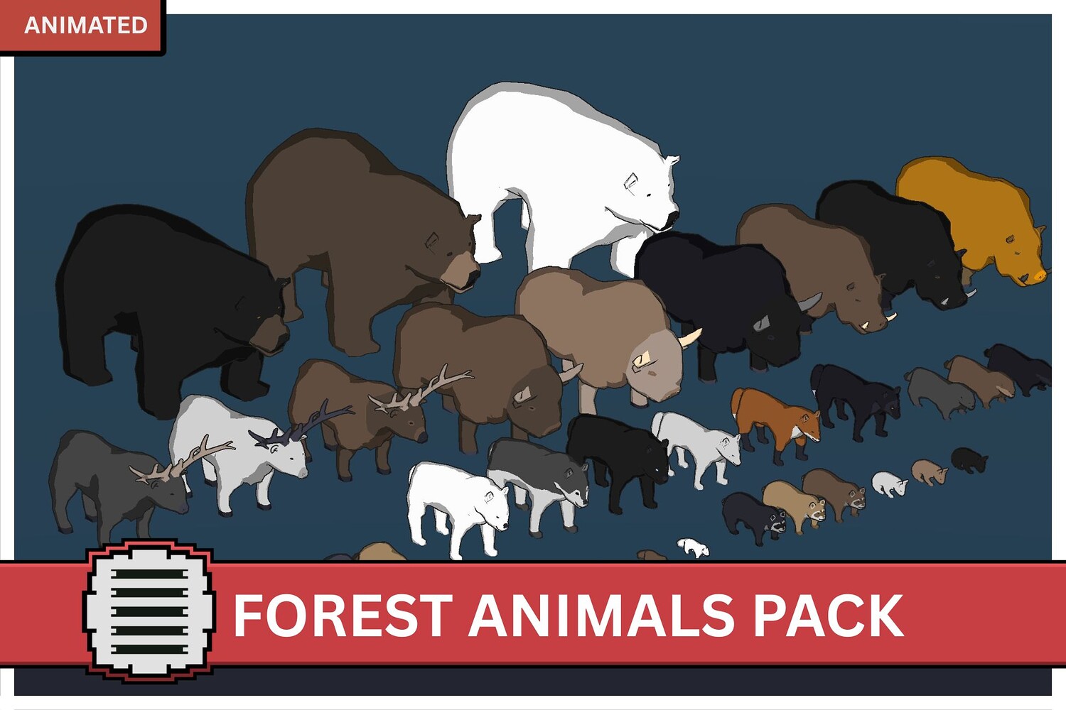 ◼ - Pack Content - ◼ Models use a simple palette for coloring, easily customizable using FBX file. Optimized and ready to be used. ◼ - Models- ◼ Animals: Bear x3 ~2050 tris Beaver x3 ~1750 tris Bison x3 ~2850 tris Boar x3 ~2450 tris Deer x3 ~3550 tris Fox x3 ~2250 tris Hedgehog x3 ~1400 tris Otter x3 ~1800 tris Rabbit x3 ~1800 tris Racoon x3 ~1900 tris Squirrel x3 ~1900 tris Wolf x3 ~2250 tris