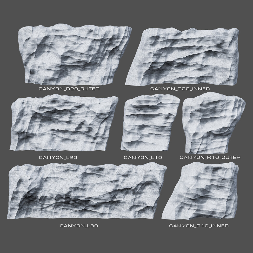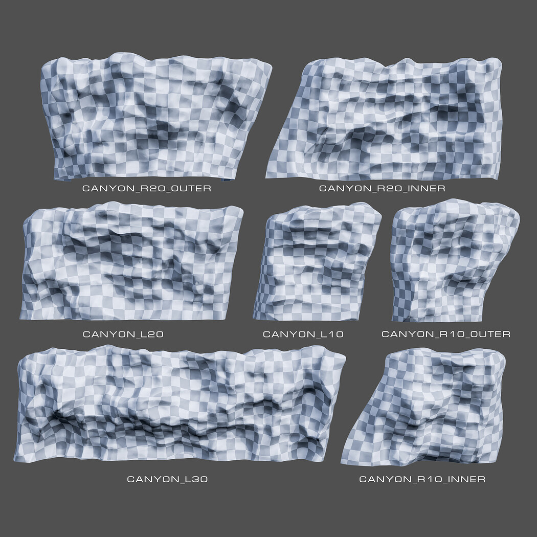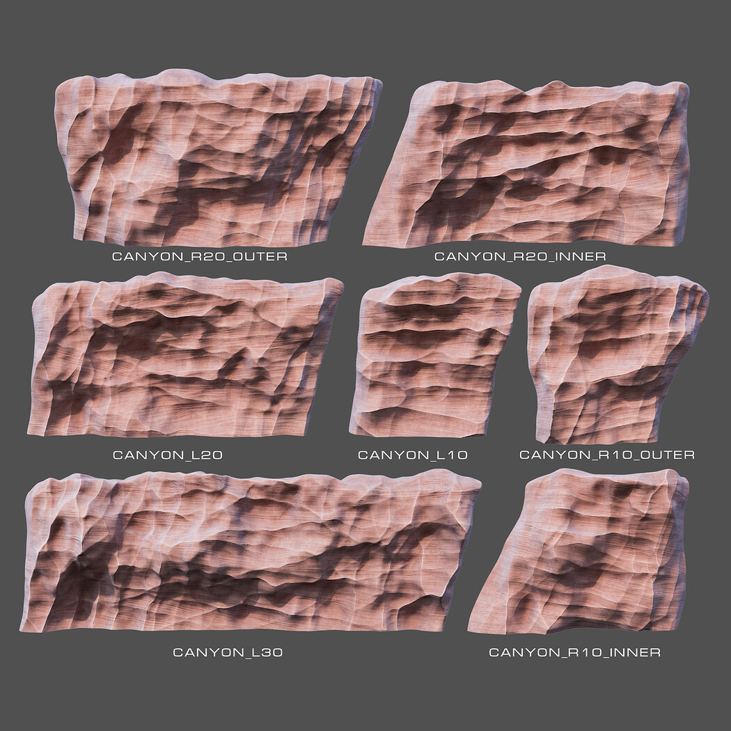 The canyon consists of seven elements that can be assembled into various configurations. These elements can be used as a backdrop for your creations or camera movements. Large canyon elements have two textures joined in the middle, which is necessary for greater detail and maintaining the optimal size of all textures. The models have PBR materials in the TGA 4096 texture format. The archive also contains additional formats .FBX and .OBJ