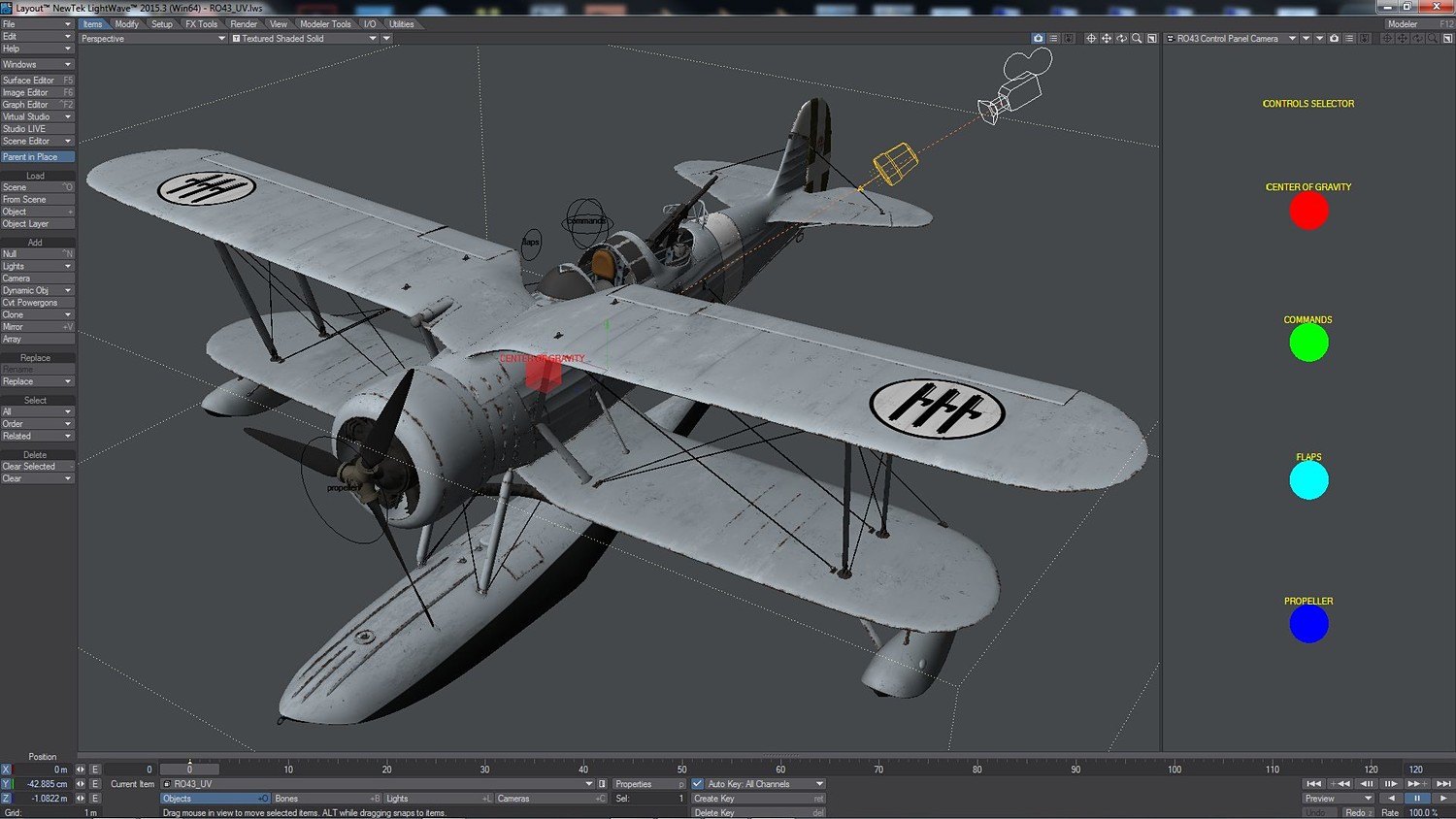 LIGHTWAVE The Lightwave scene includes a basic setup with controls that allows you to animate ailerons, flaps, rudder, elevators and the propeller. You can pick each item using the simple interface framed by the camera named 'Controls Selection Camera'. When you open the scene you will find this interface on the right side of the screen.