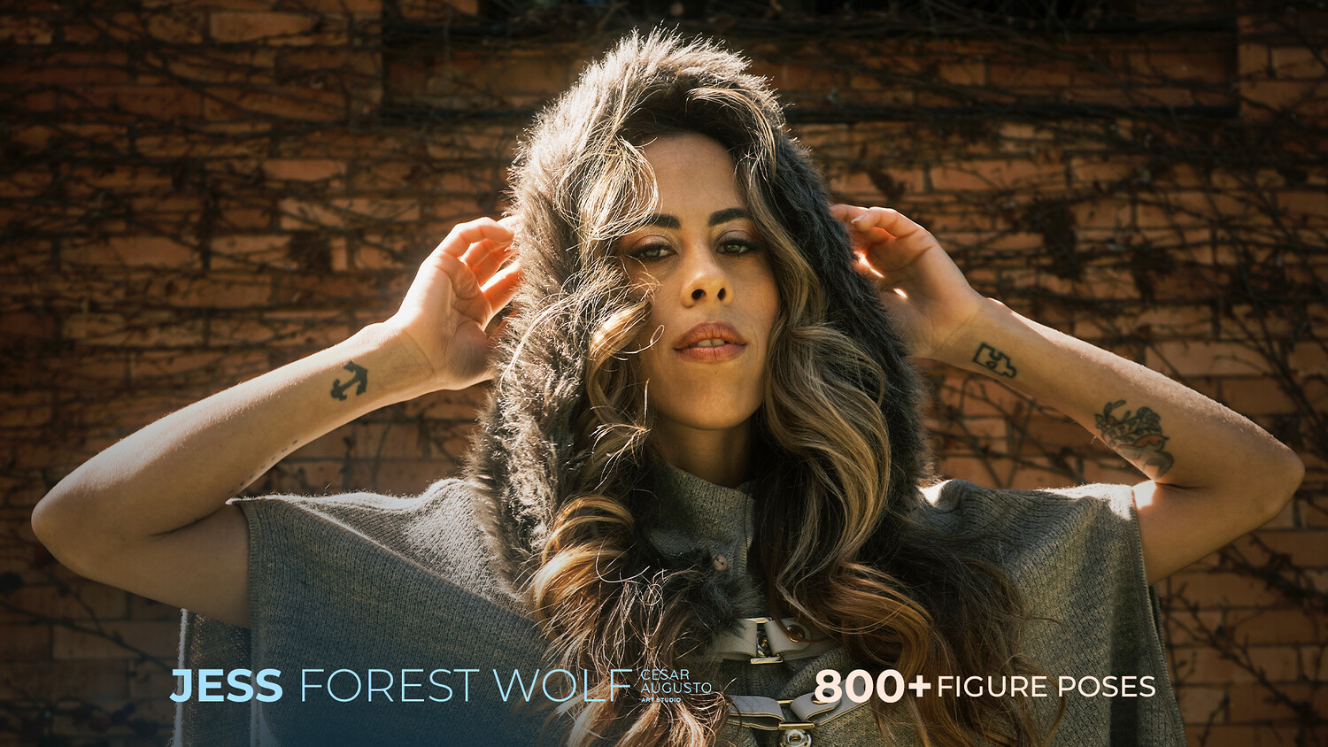 Forest Wolf brings Jess into the heart of nature. Posing around the old stone house and its open mountain clearing, she blends strength with elegance. Her wolf tattoo and natural presence connect her to the wilderness, while the sunlight and views highlight her figure in both outdoor and indoor settings. A set that captures wild grace and serene form.