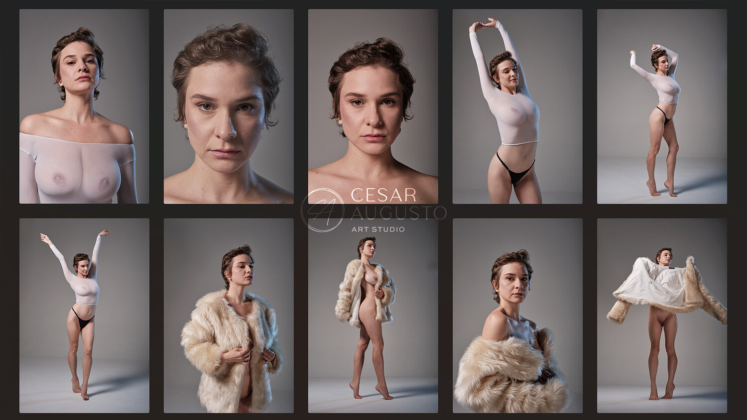 Elle’s Debut, Elle poses for portraits, standing, and sitting on a chair. Her poses start classic and elegant, then shift to a more quirky, unusual model style. The set uses Rembrandt lighting that shapes her face and body with soft shadows, adding depth and mood. At the end, she does a sharp, confident CEO-style shot, showing her range and presence.