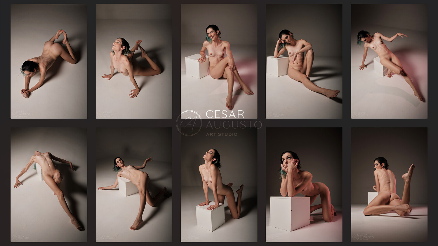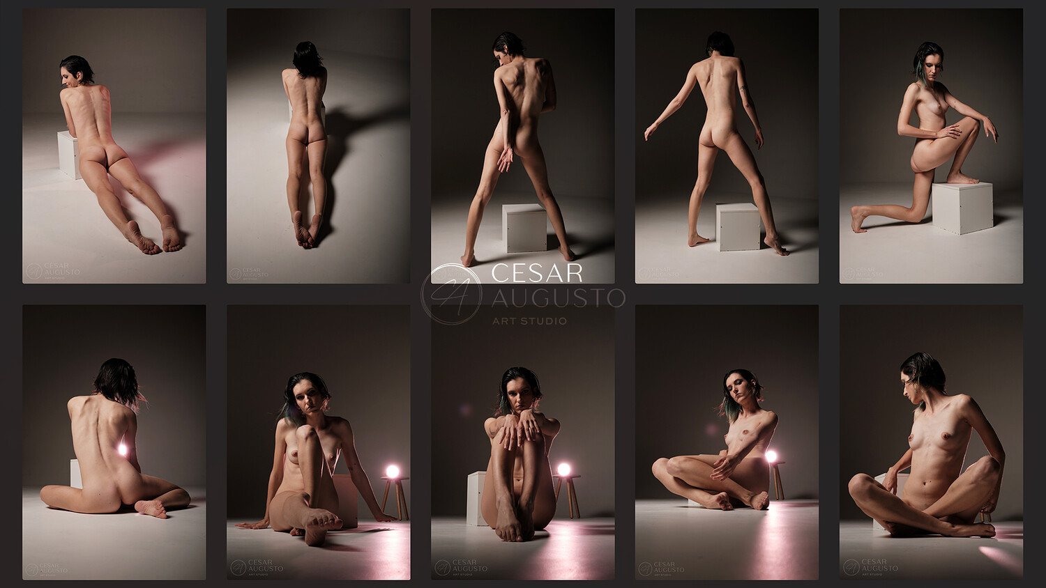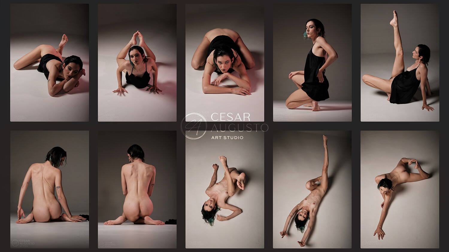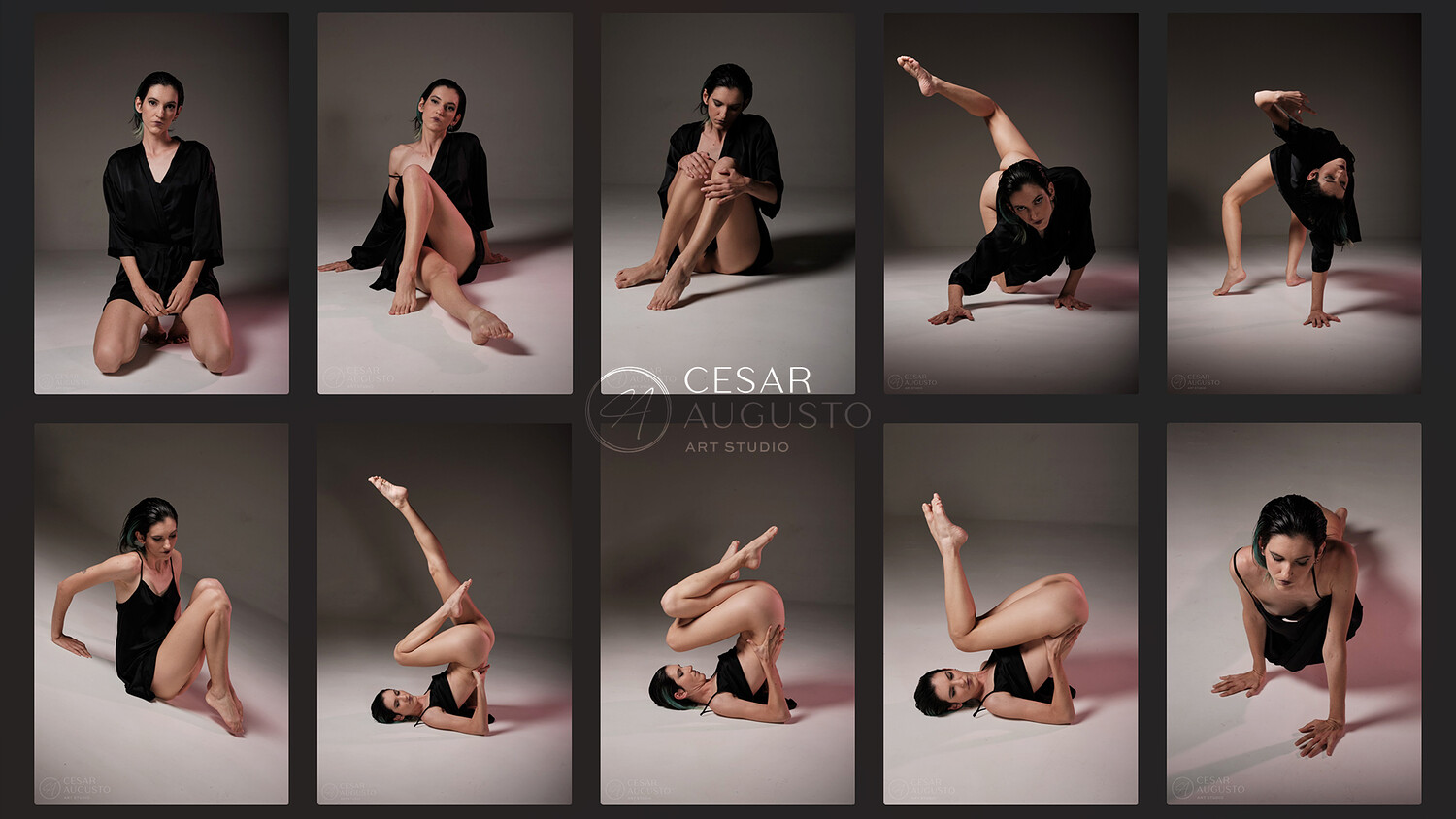 Lighting is a mix of Rembrandt and rim light, giving form and contrast to her body. The shadows help shape each pose, while the rim adds a subtle glow around her edges. It’s a clean and moody setup that brings out both the movement and the structure of her figure.