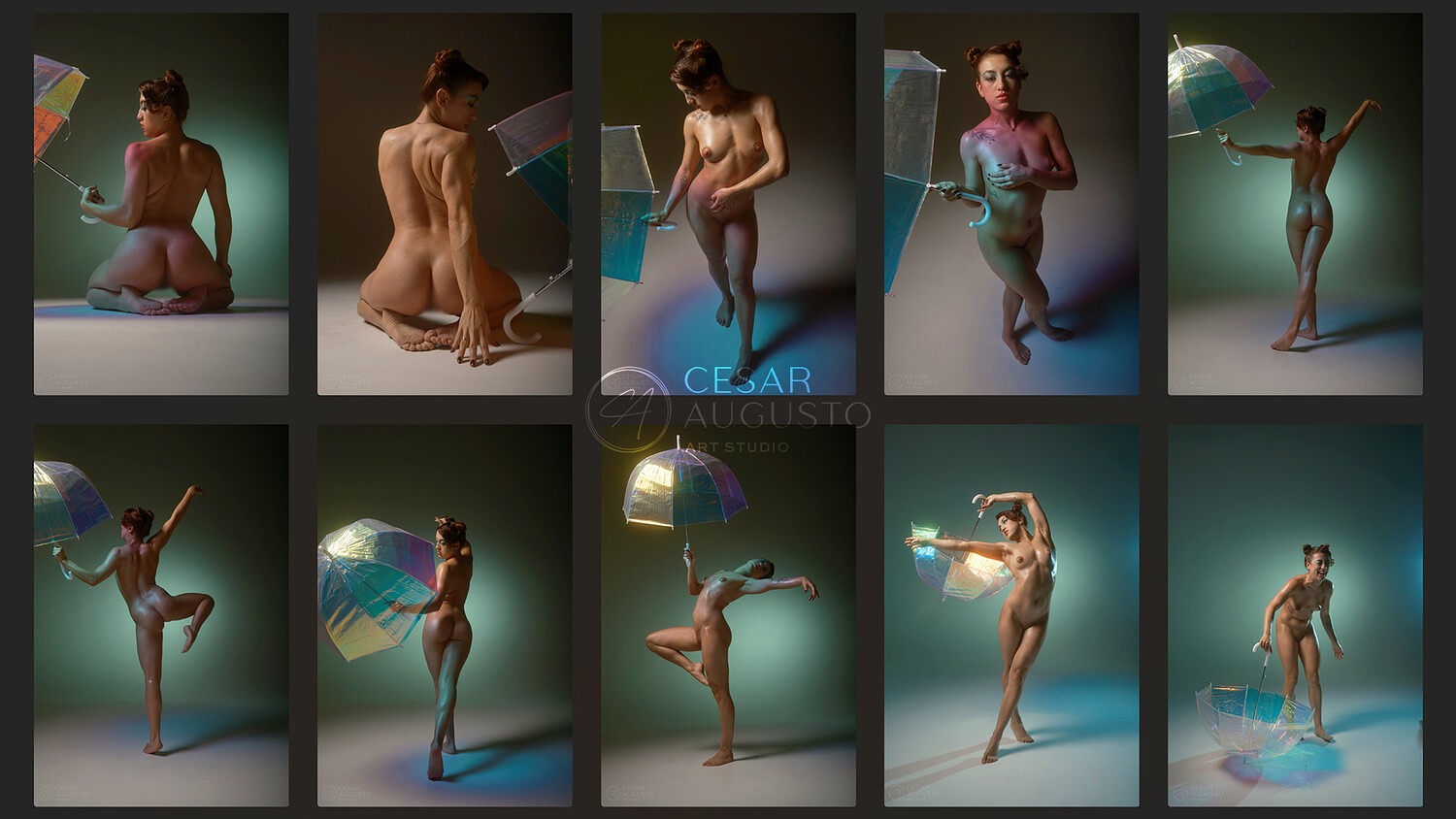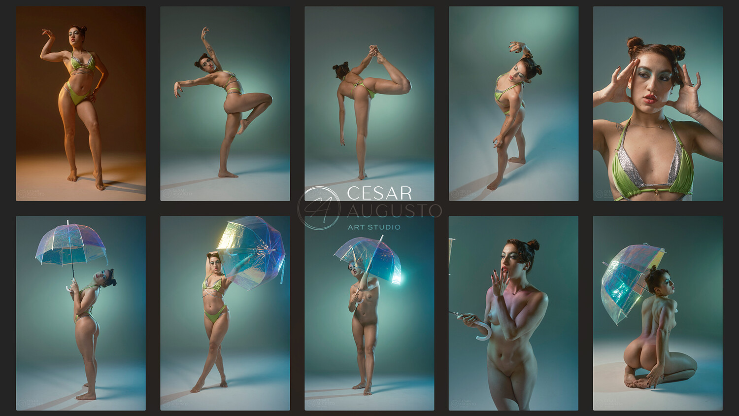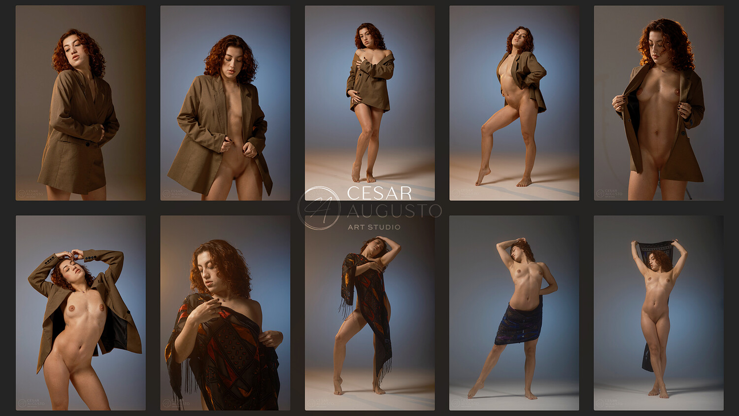 The second part shifts into color, with her hair styled differently and the light creating a stronger mood. The poses here are more dynamic, with a mix of standing, kneeling, and sitting that brings variety and flow.