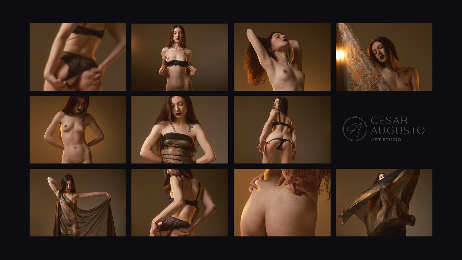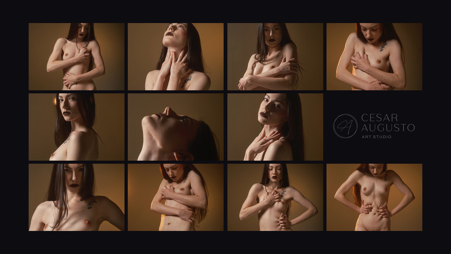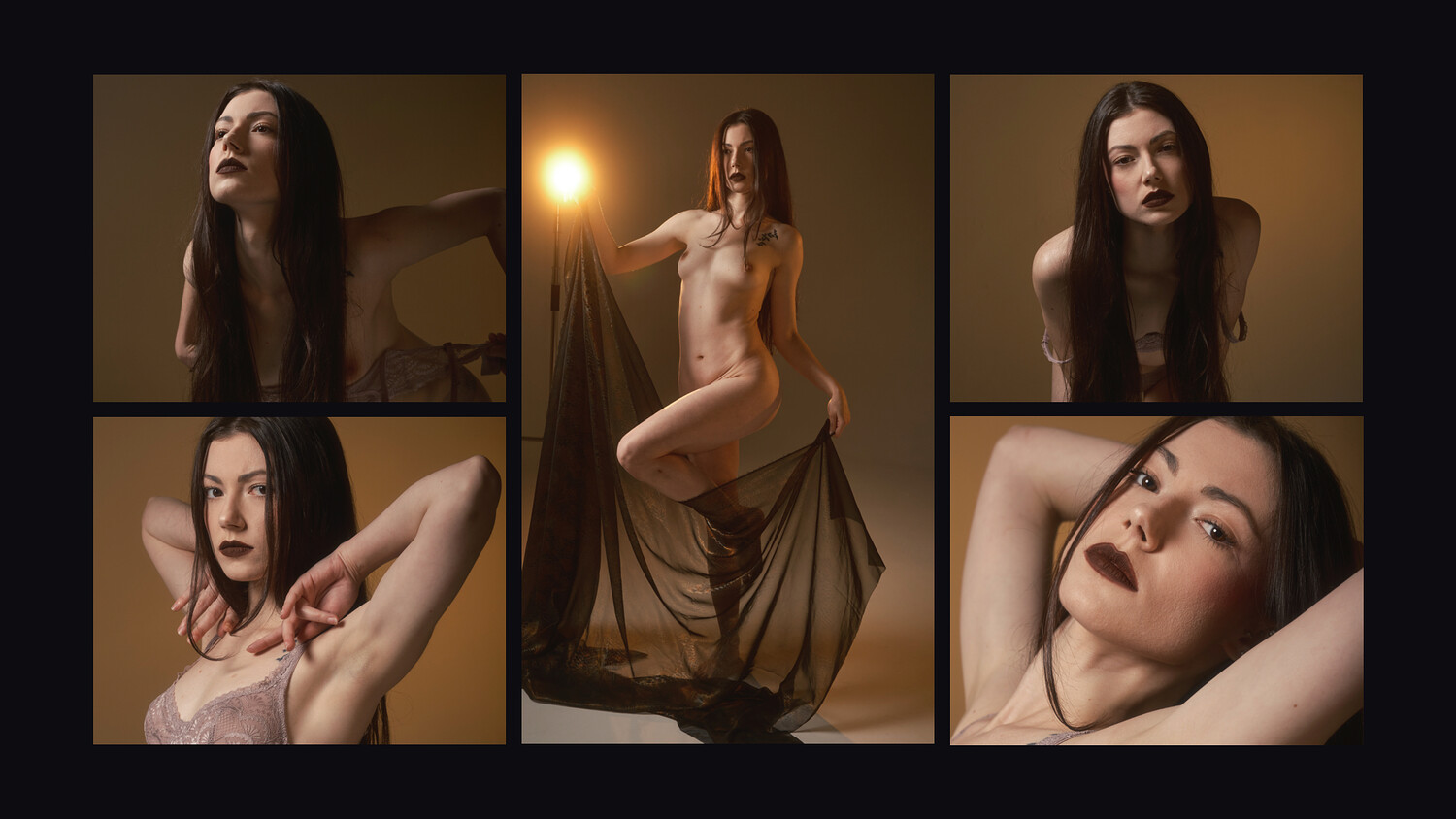 The light is Rembrandt with a soft rim, shaping her body and adding contrast to every pose. Each frame feels personal and moody, showing her natural sense for posing and expression.