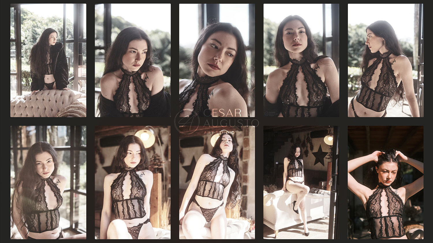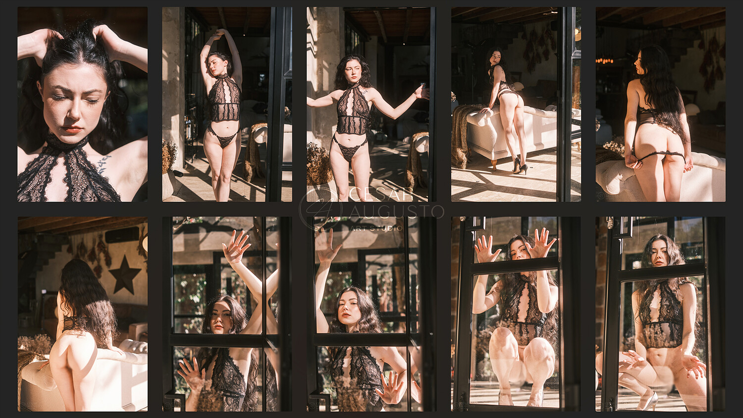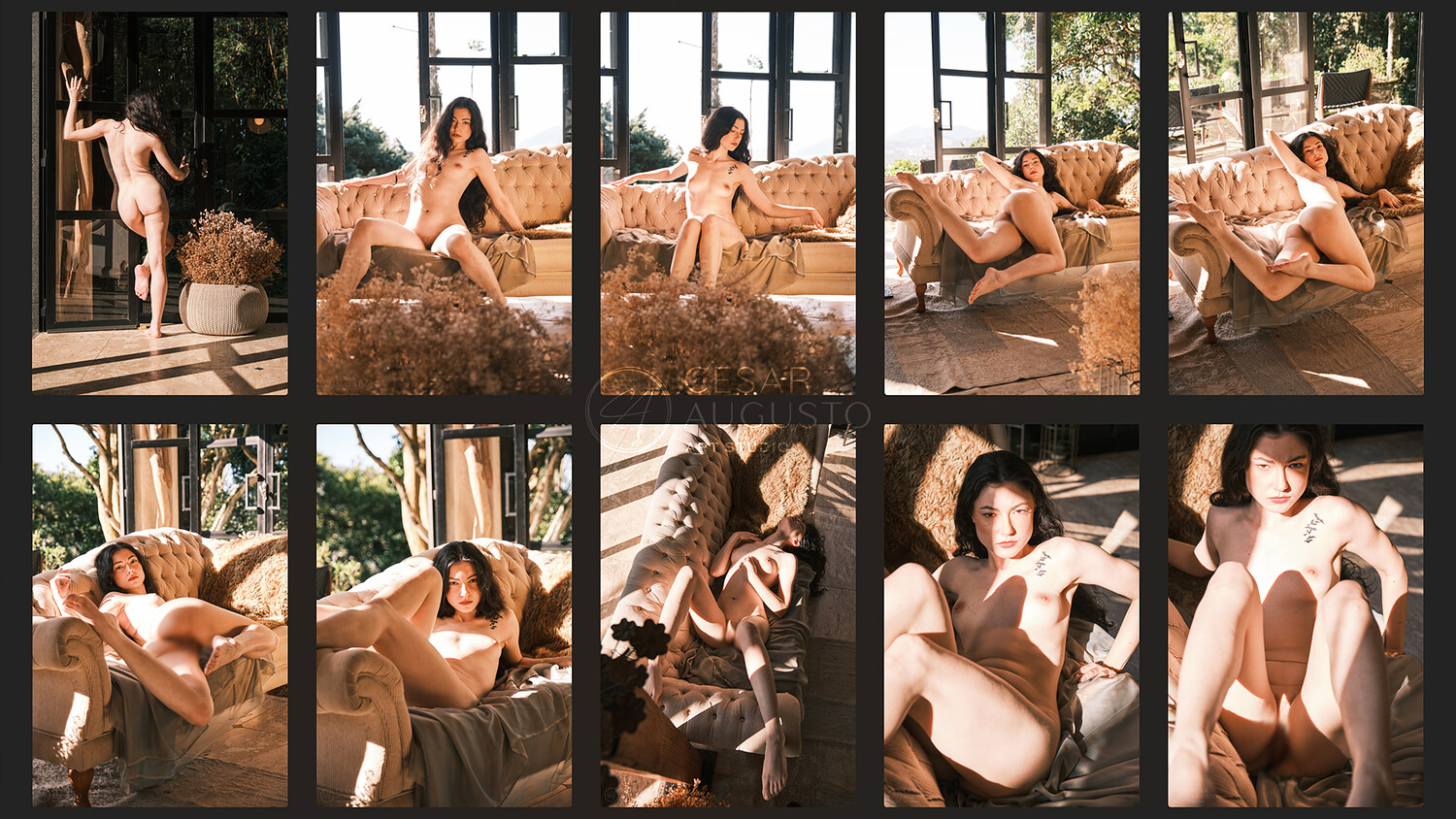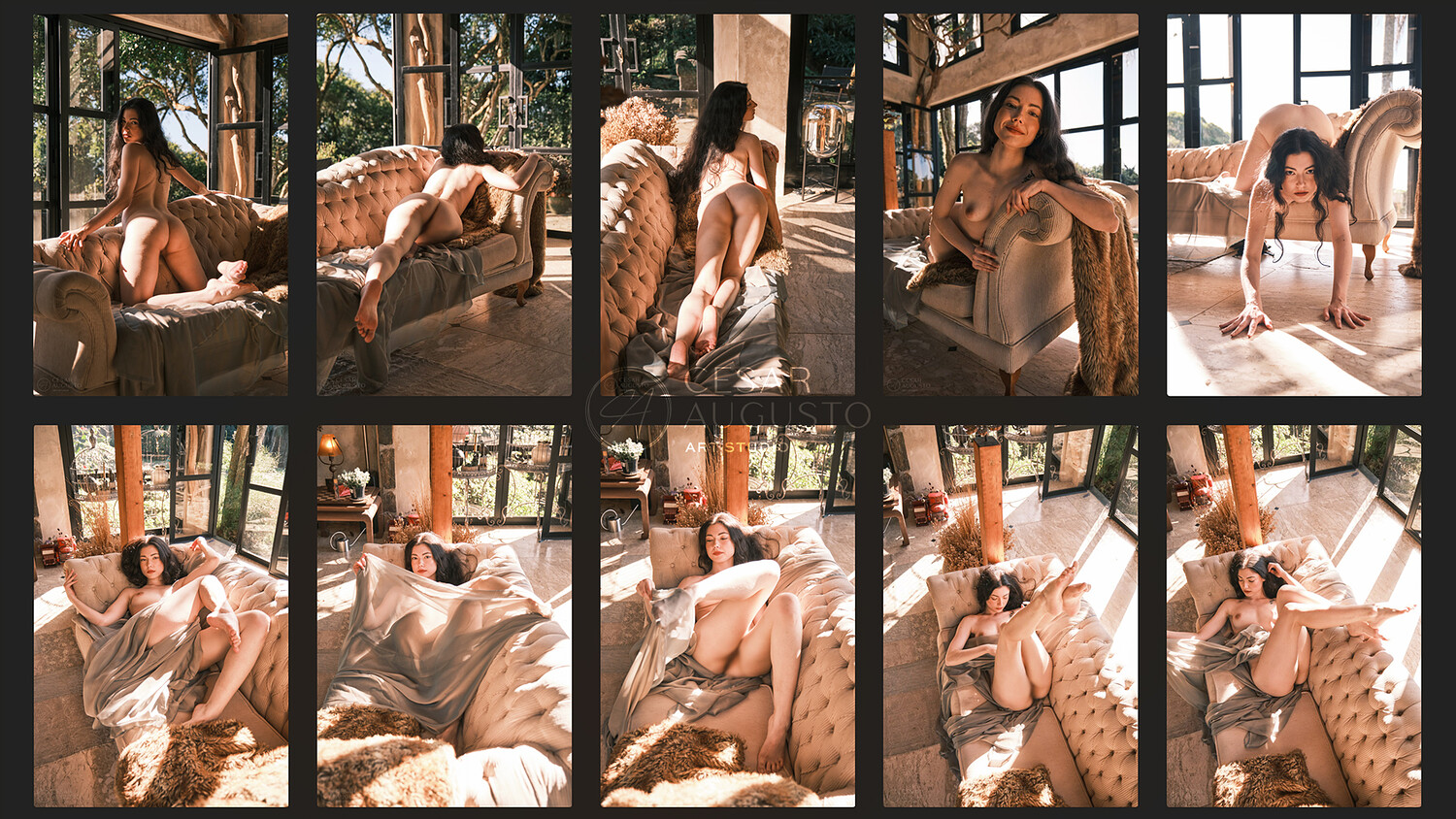 “Gabi Sunroom Muse” brings her into a beautiful house setting, where sunlight fills the living room. She poses on the couch with a mix of elegance and comfort, letting the warm light shape her figure. The natural atmosphere highlights her presence, making this set a calm and inspiring study for artists. It follows her previous collections with the same grace, now seen in a more intimate and warm environment.