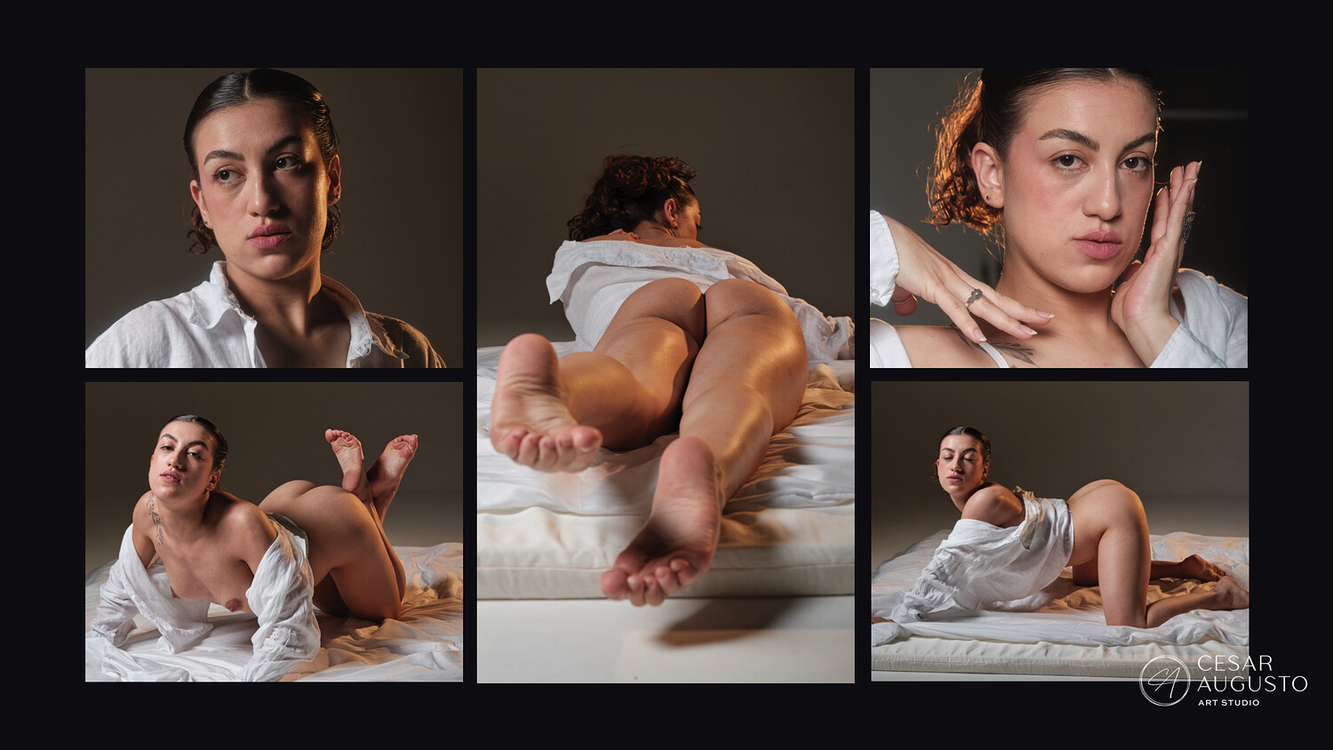 In this shared session, both start individually, exploring their own rhythm and form. Toward the end, they join together kneeling and lying on the ground, blending Anne’s strength with Carol’s fluidity in a natural, harmonious way. The result captures two distinct styles that meet perfectly in one frame.