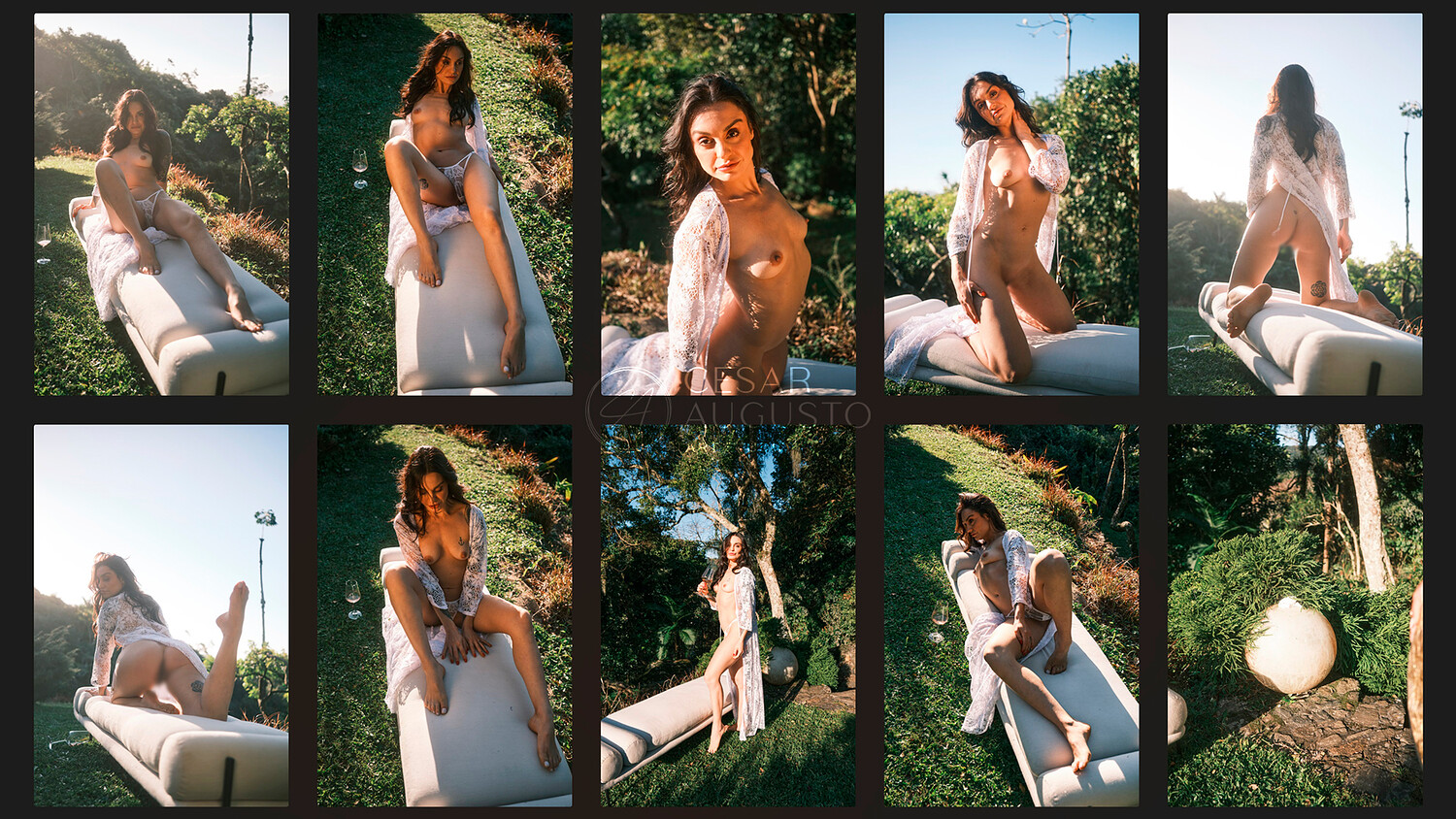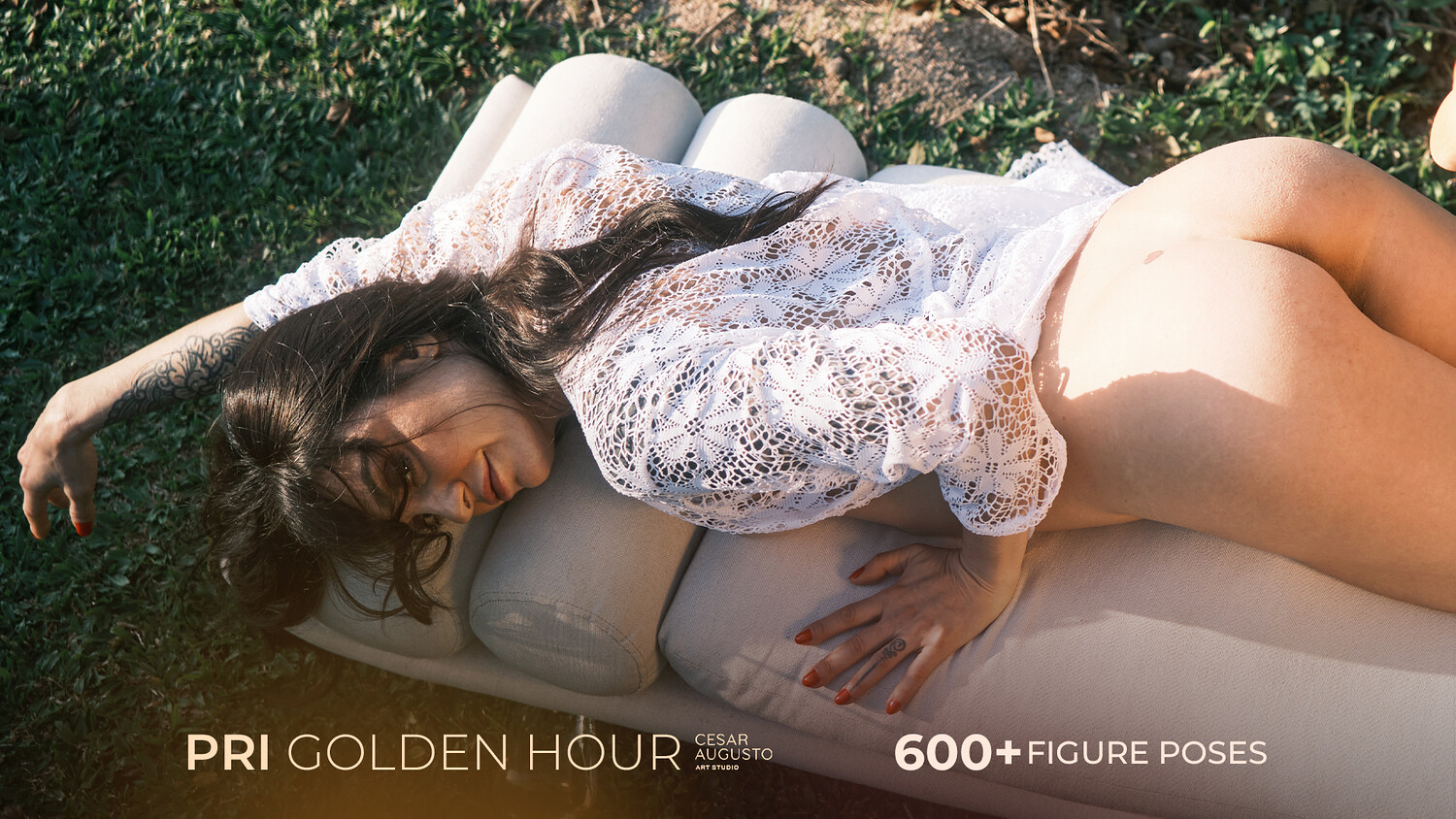 Pri starts this set posing inside the house with beautiful split lighting that shapes her figure. Then she steps outside and poses on a futon sofa under the bright, hard sunlight, adding strong contrast and energy to the images. The mix of dramatic indoor light and sharp outdoor sun makes this set a striking reference for studying form and light.