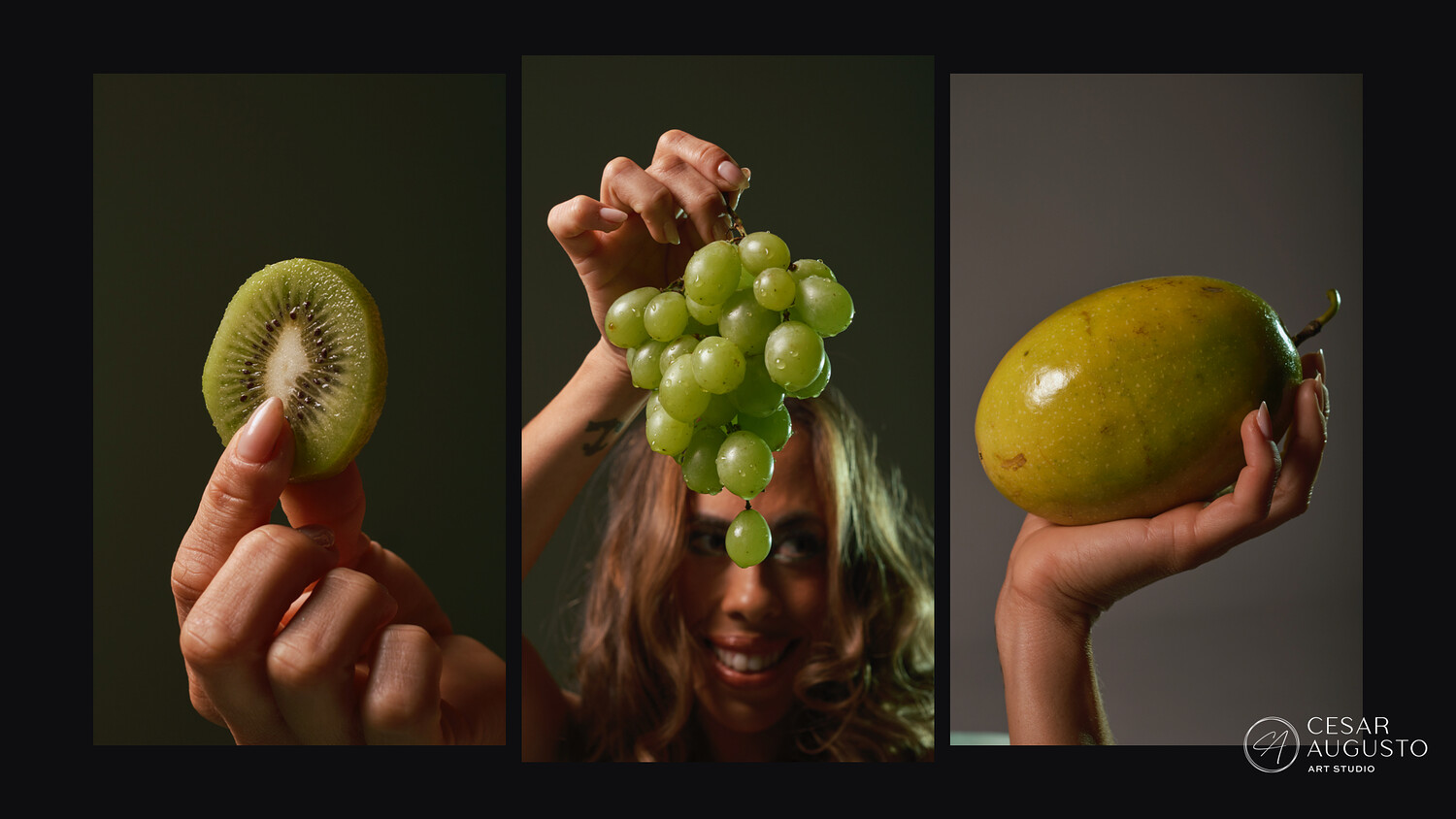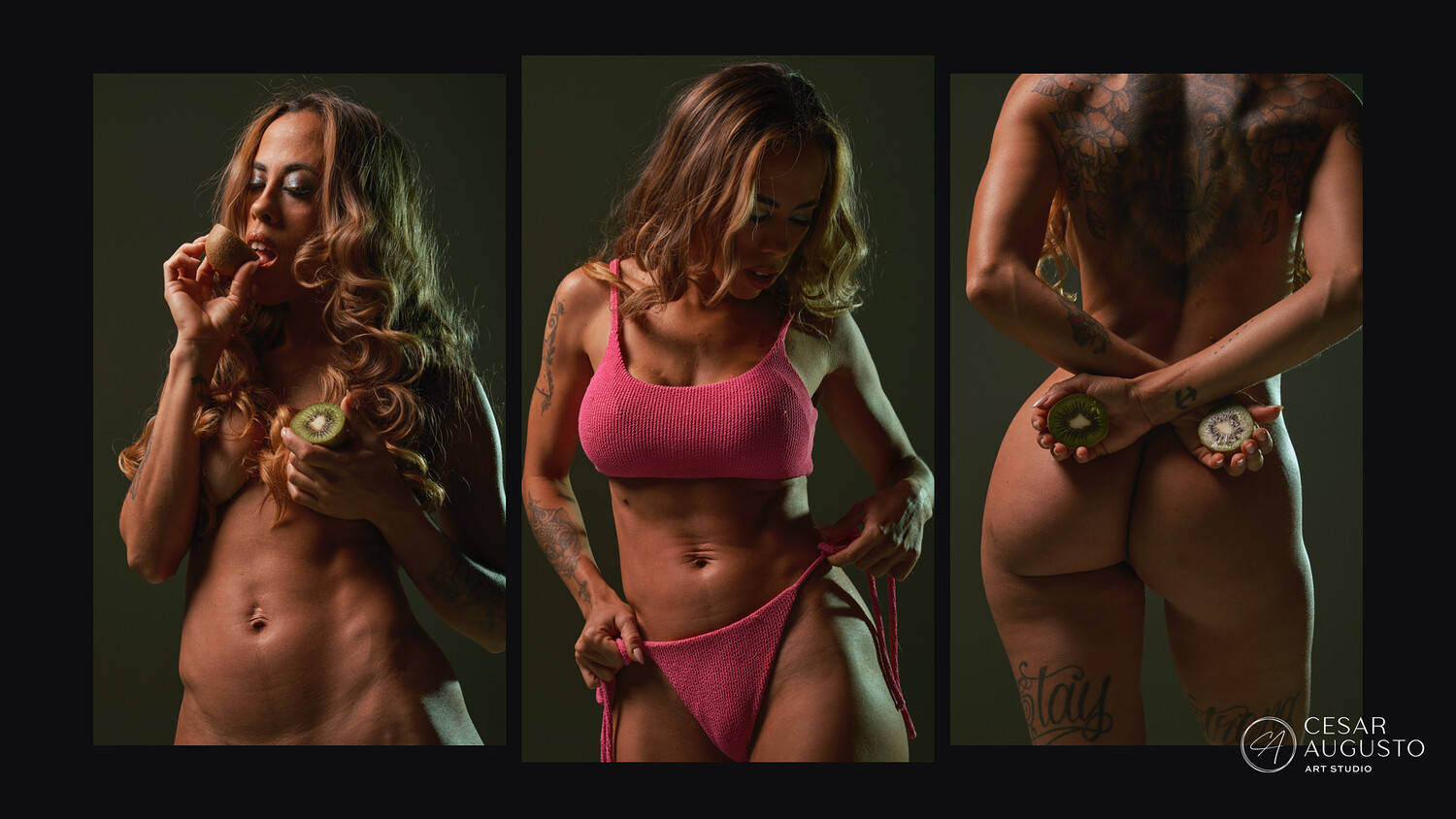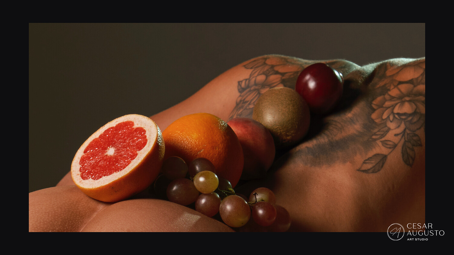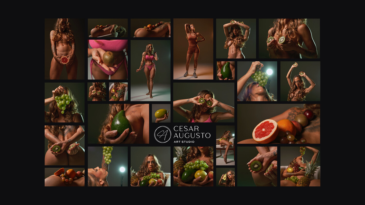 The session unfolds through a calm and deliberate pace, moving between seated and standing poses. Lighting is kept directional and restrained, allowing strong separation between skin, texture, and color. Fruit rests on the body as part of the composition itself, reinforcing form and structure rather than acting as decoration.