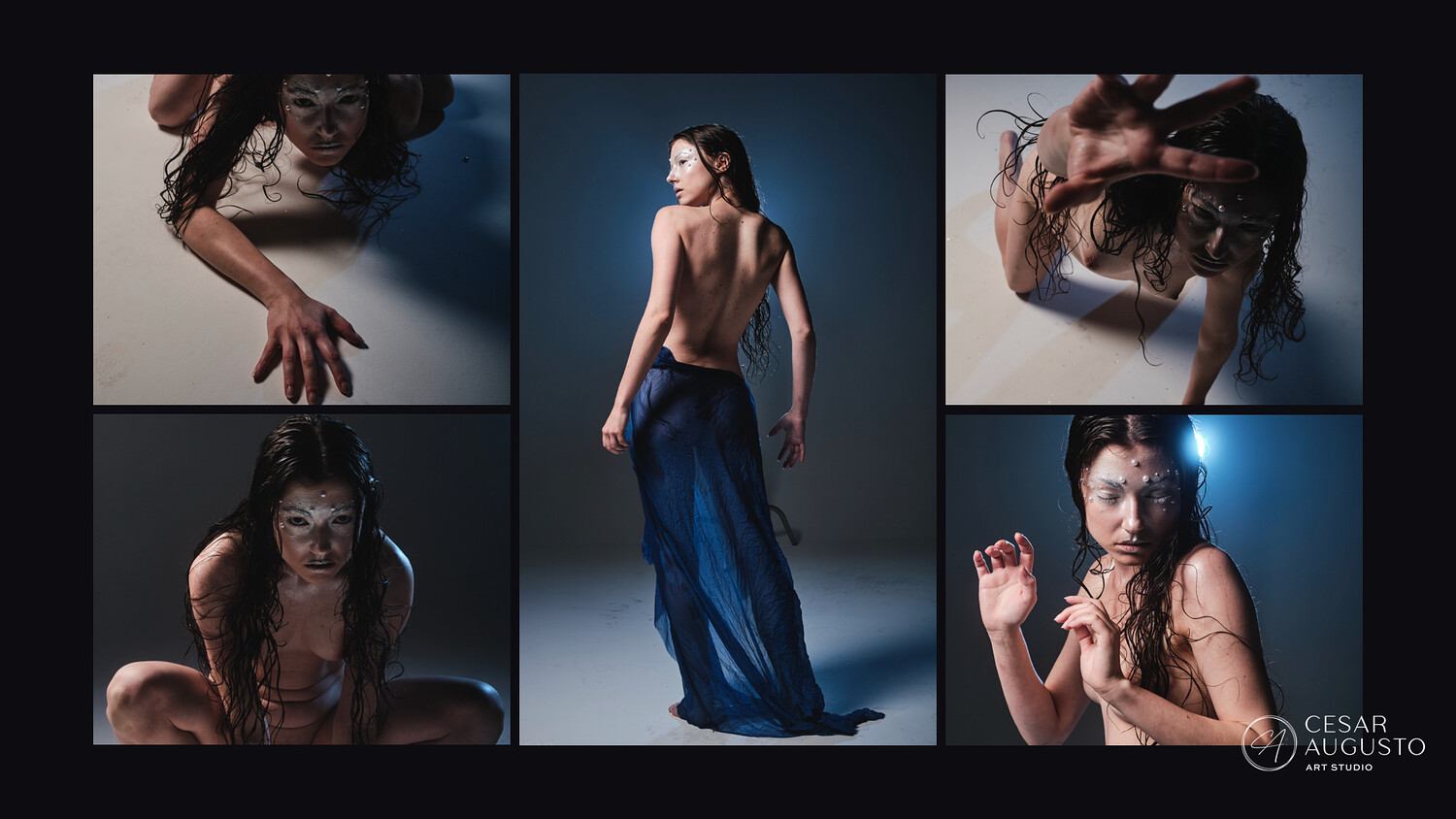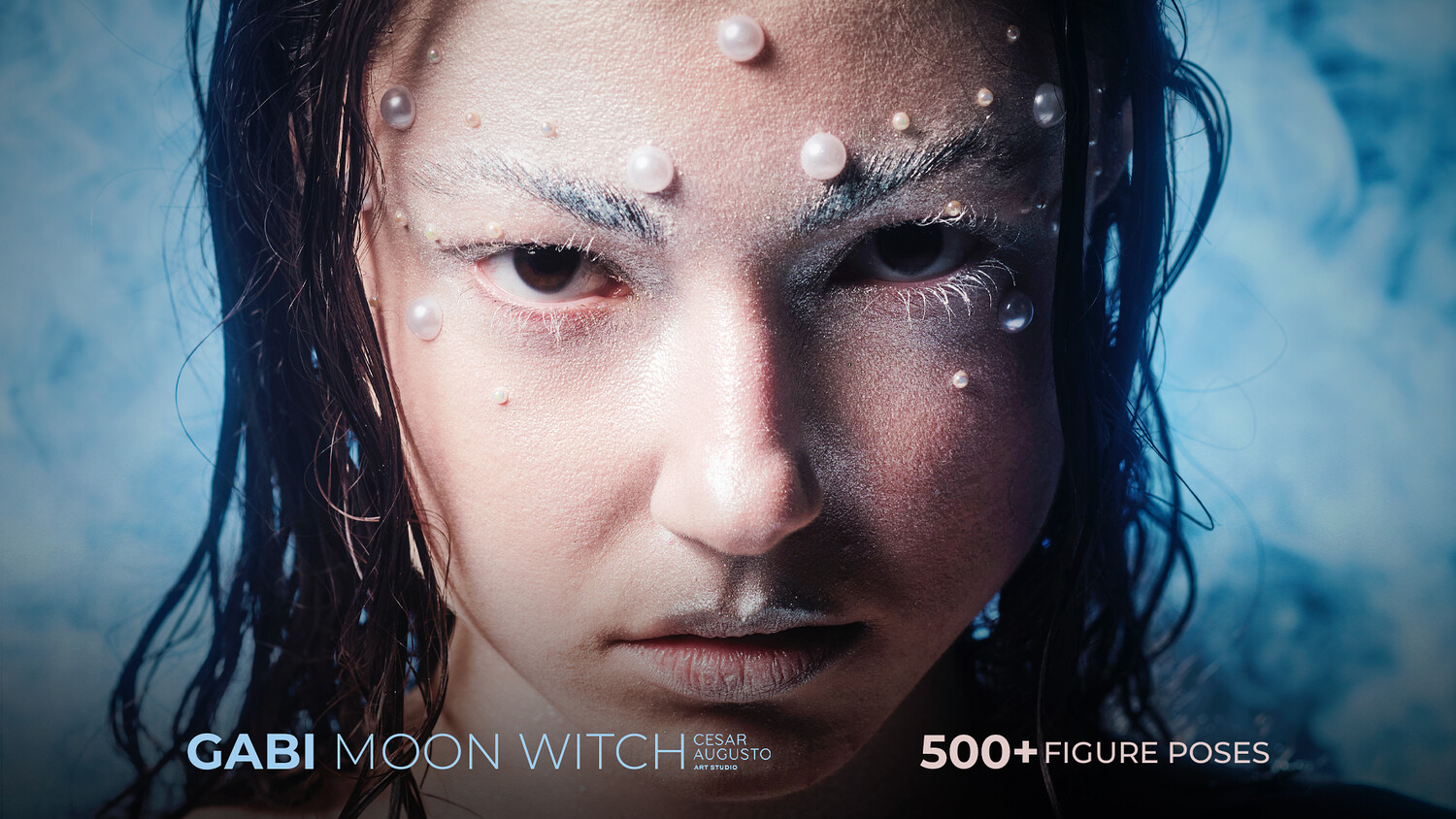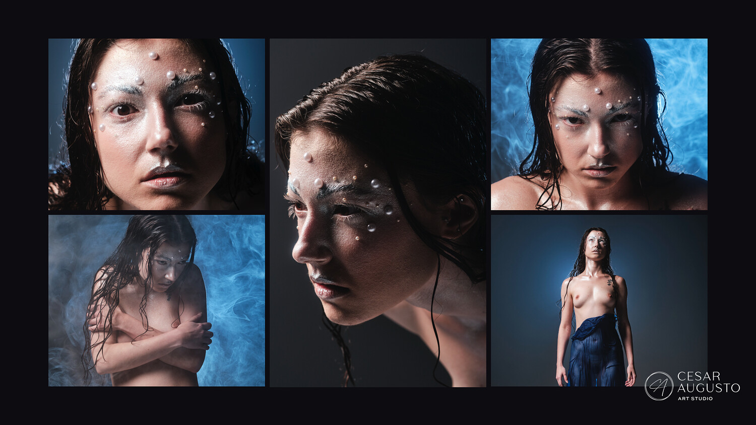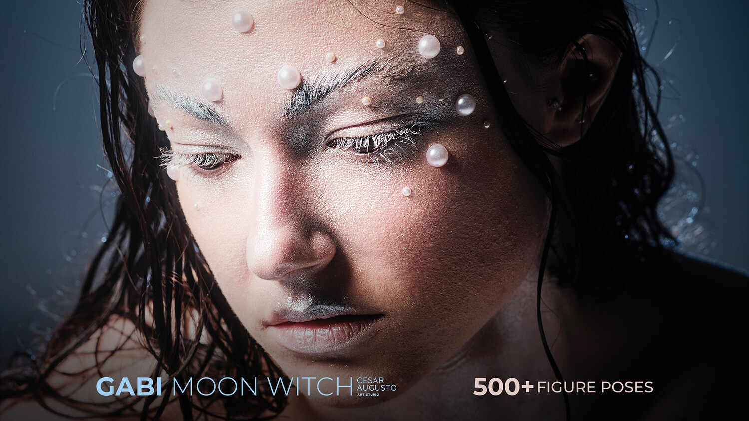 This new Gabi set brings a mysterious, ethereal mood from start to finish. Her heavy makeup and full silver body give her an alien-like presence, almost like a Moon witch stepping out of a dream. The blue rim light wraps around her figure while the Rembrandt light keeps the shadows deep and elegant. She moves through portraits and full-body standing poses as the smoke drifts around her, adding a soft, surreal texture to the frames.