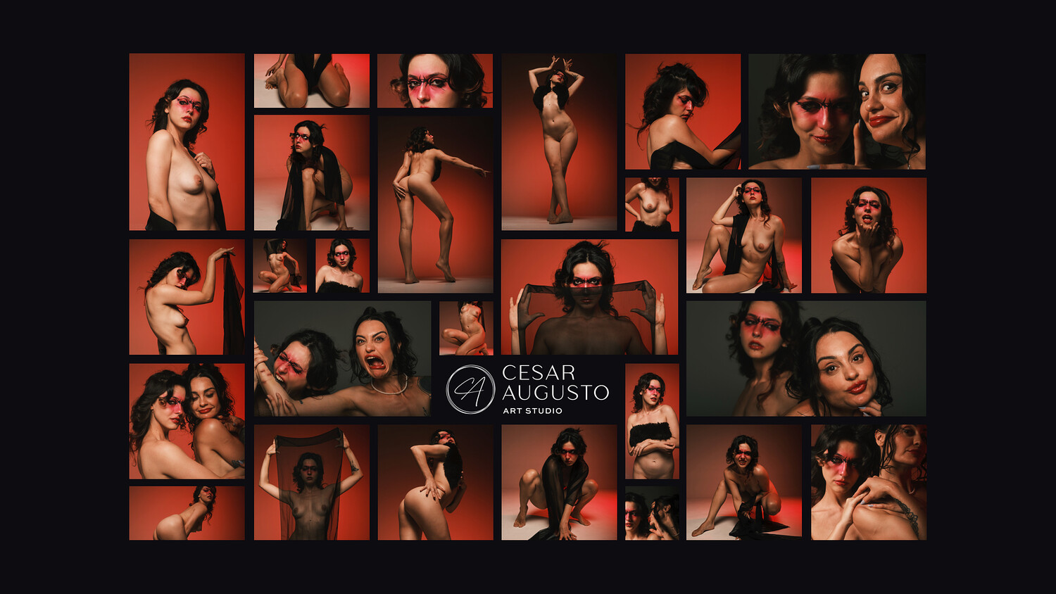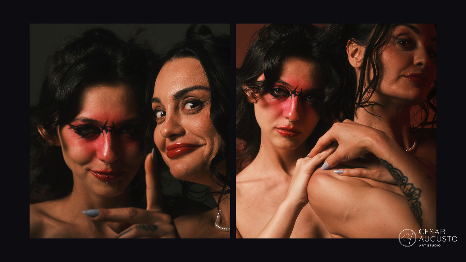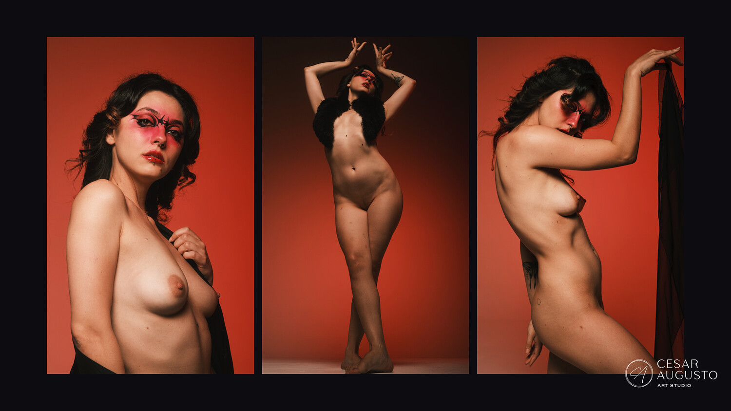 Lighting follows my usual setup, using Rembrandt light to shape the form and create depth, paired with a rim light to define the silhouette. A warm red background ties the set together, enhancing skin tones and complementing the red makeup for a cohesive, graphic look throughout.