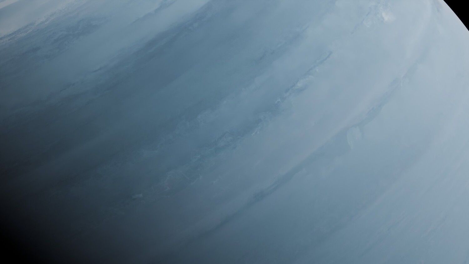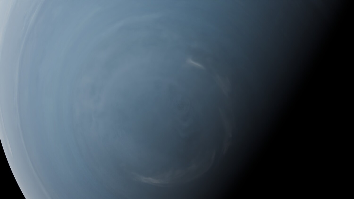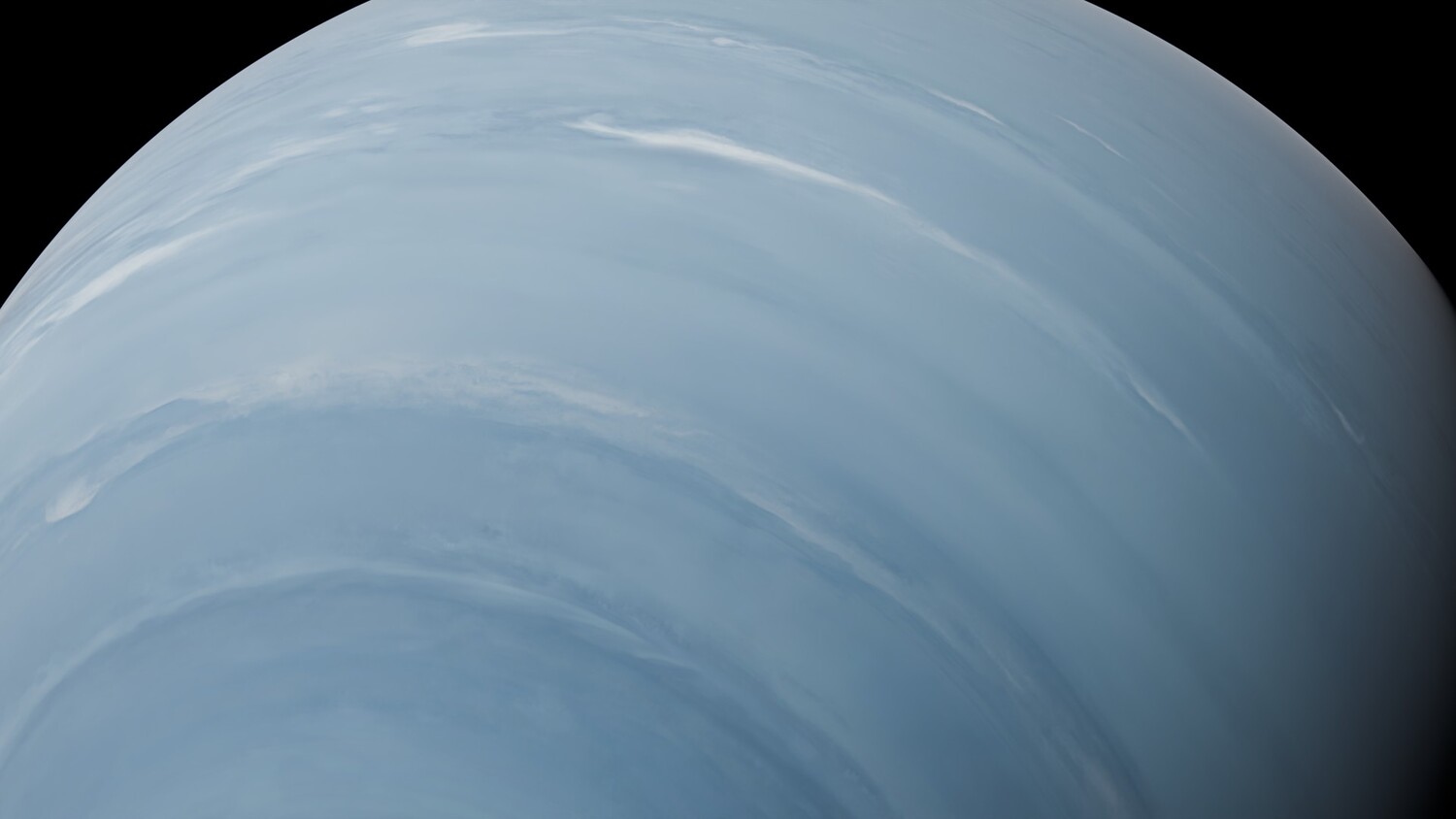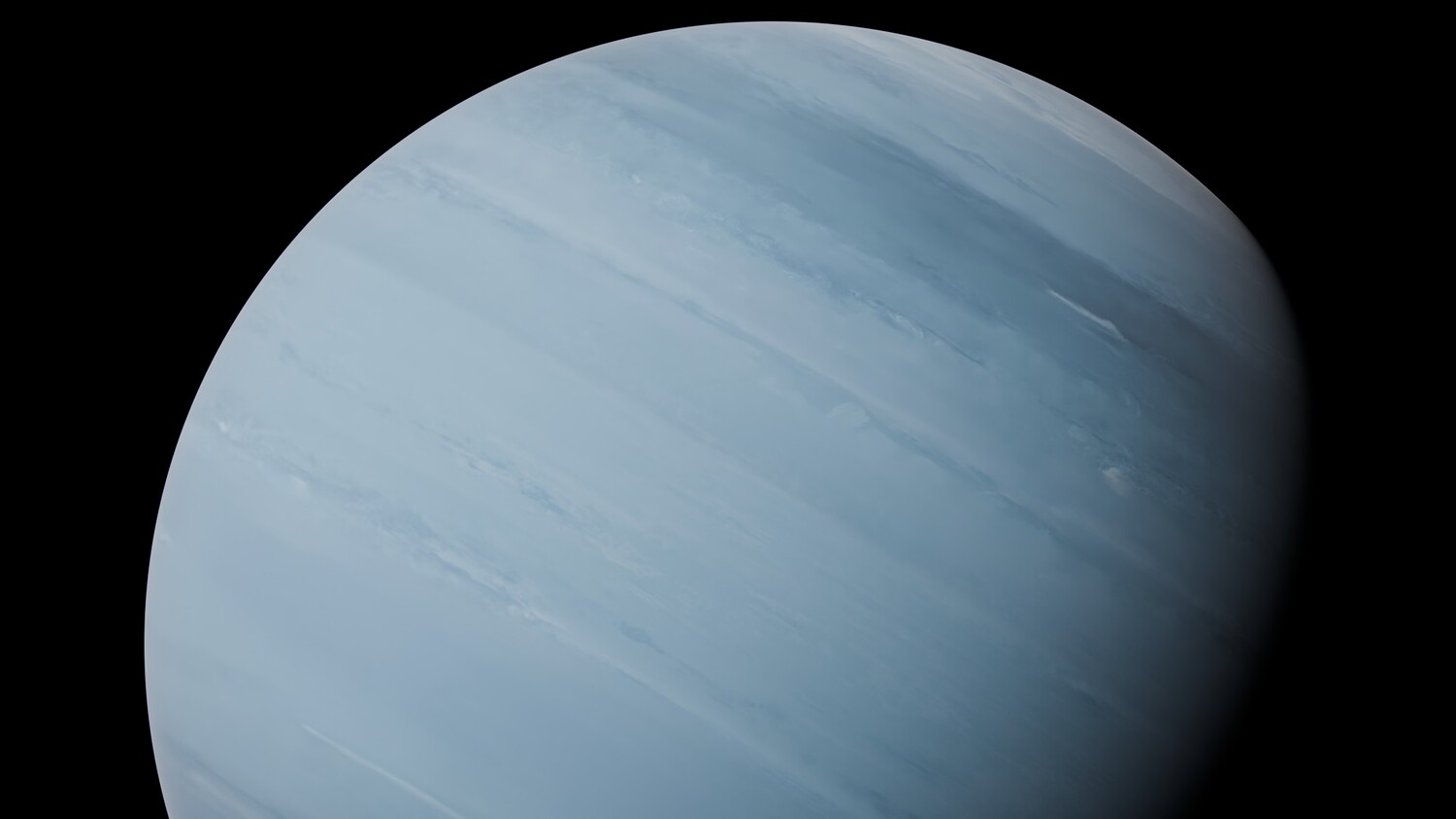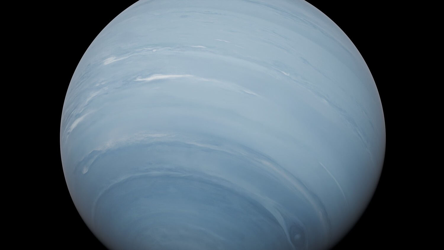 This 3D representation of Neptune is based on scientific data regarding its chemical composition and atmospheric dynamics. The physically based textures incorporate visual features of high-altitude methane ice crystal clouds, derived from real images taken by Voyager 2 and the Hubble Space Telescope.