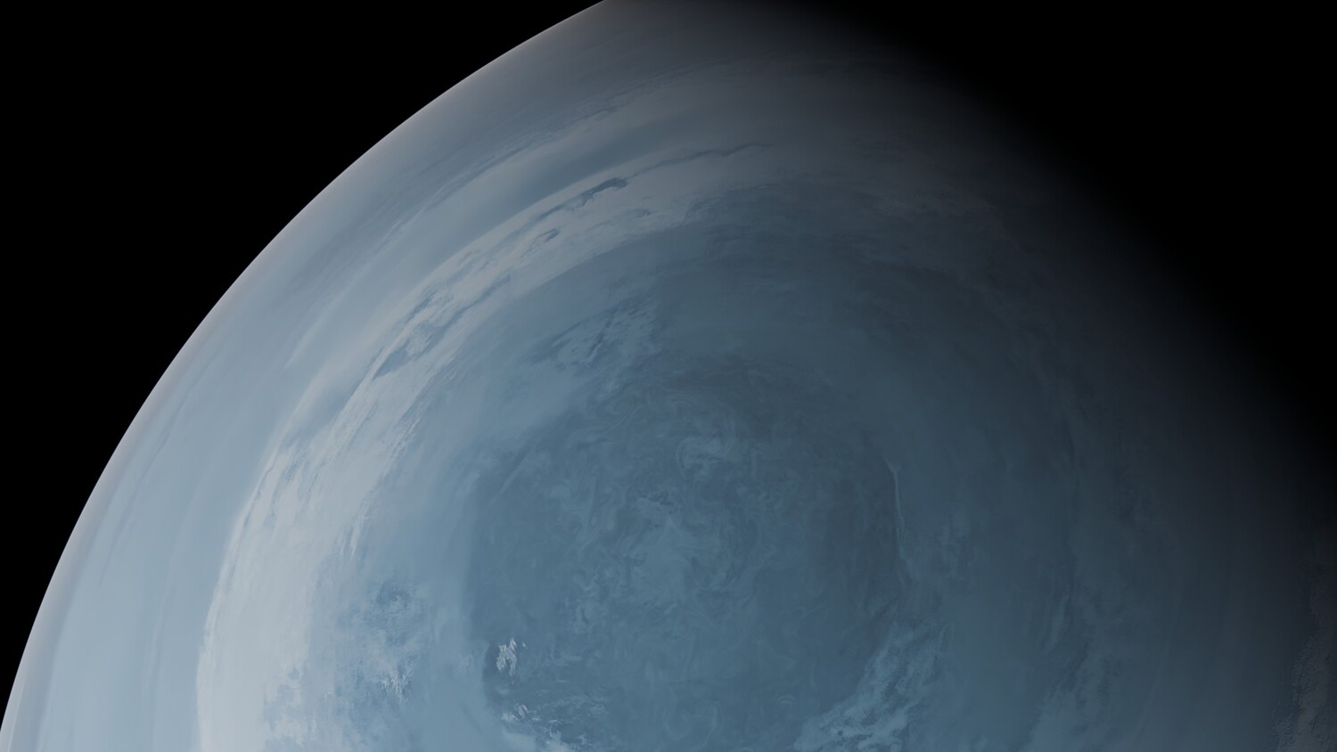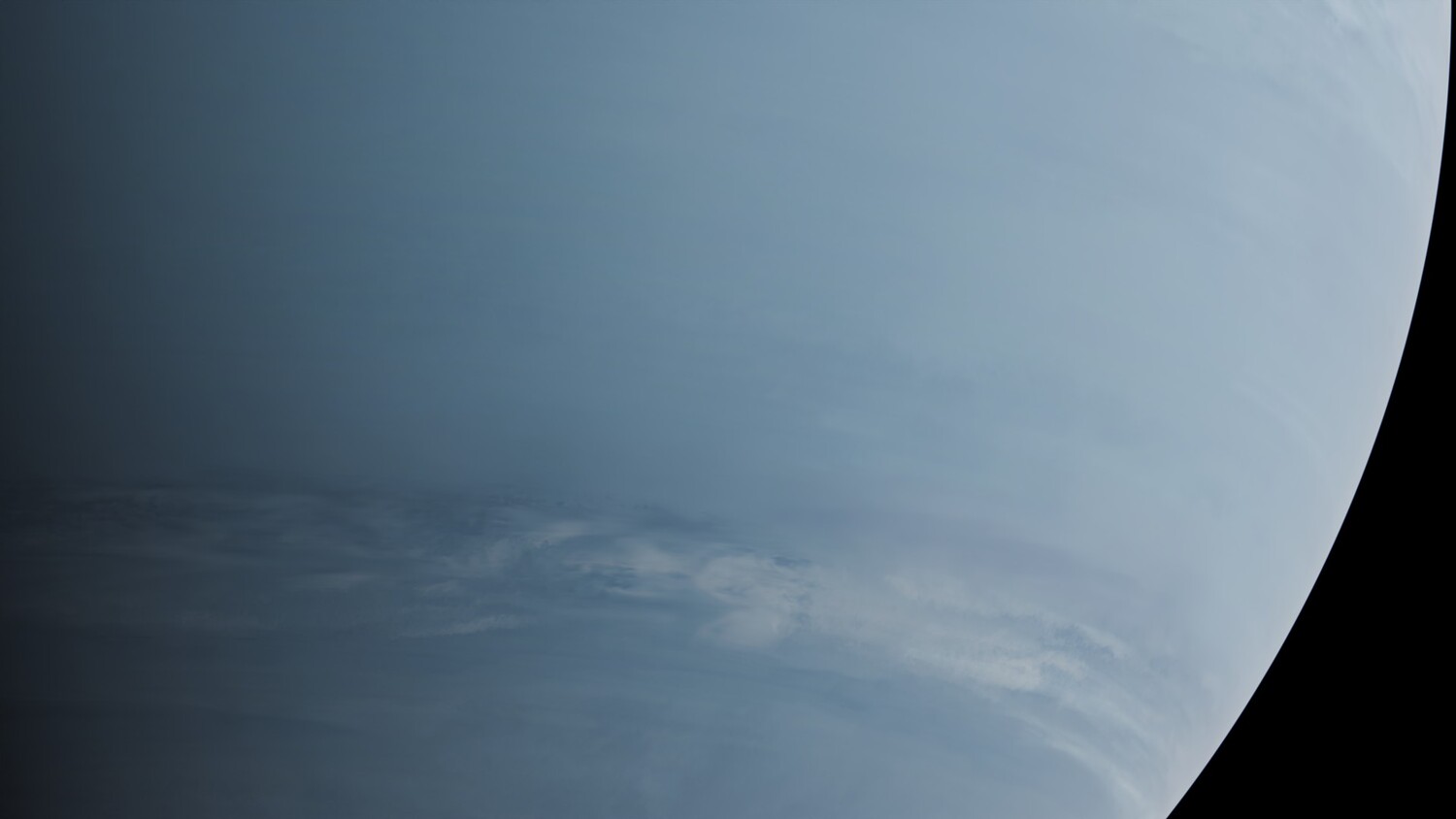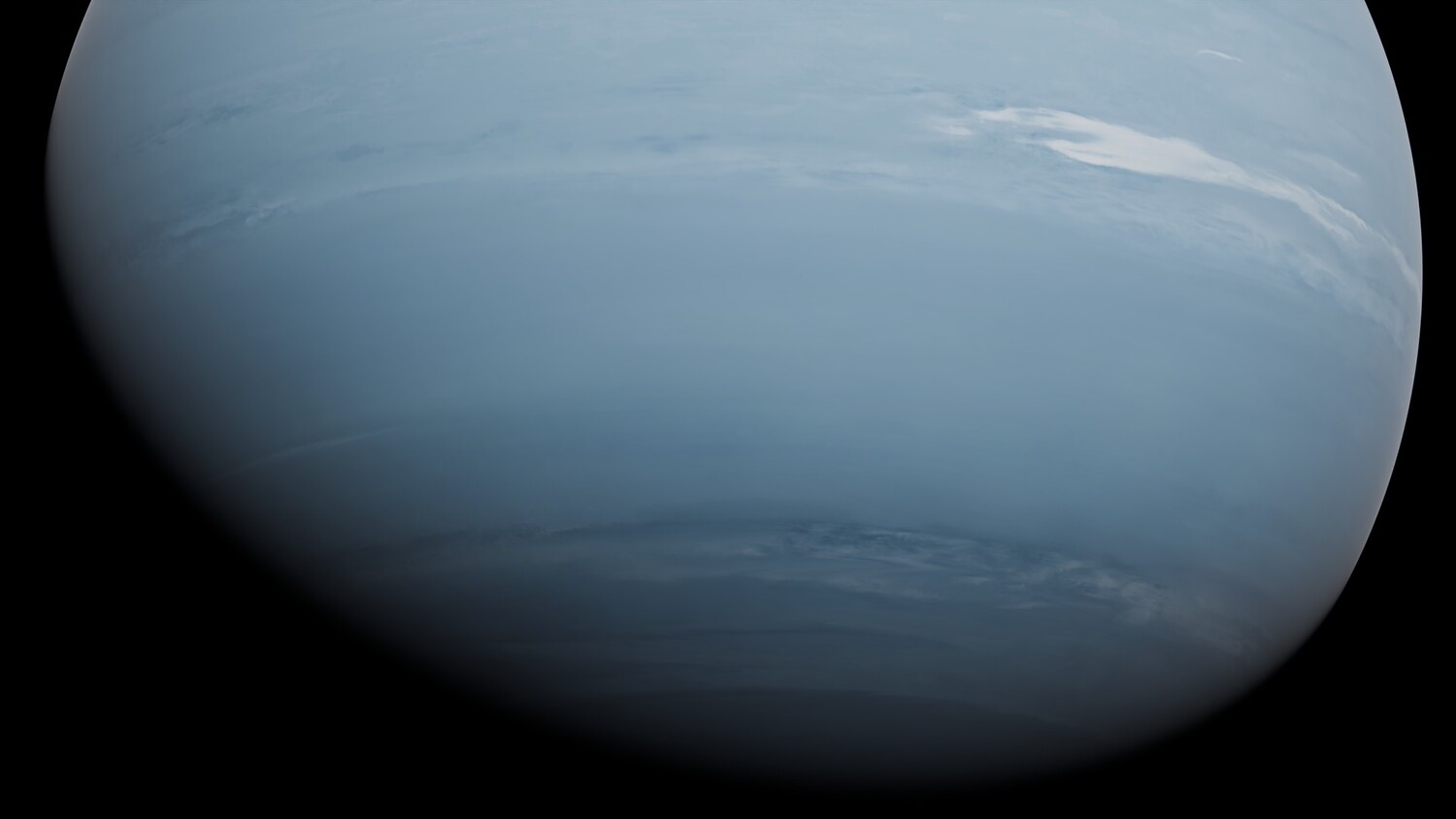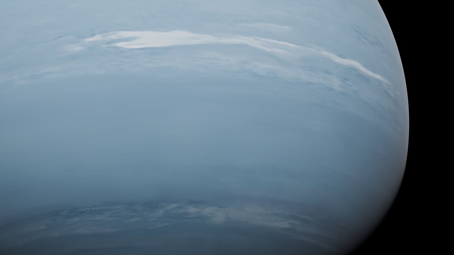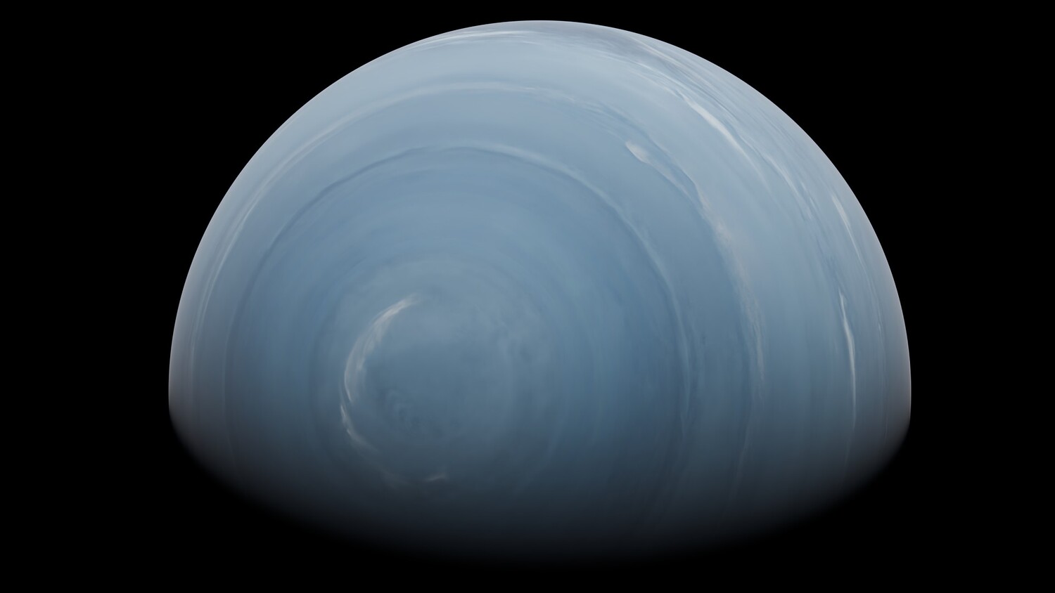 This 3D representation of Neptune is based on scientific data regarding its chemical composition and atmospheric dynamics. The physically based textures incorporate visual features of high-altitude methane ice crystal clouds, derived from real images taken by Voyager 2 and the Hubble Space Telescope.