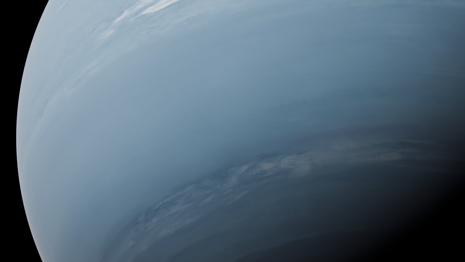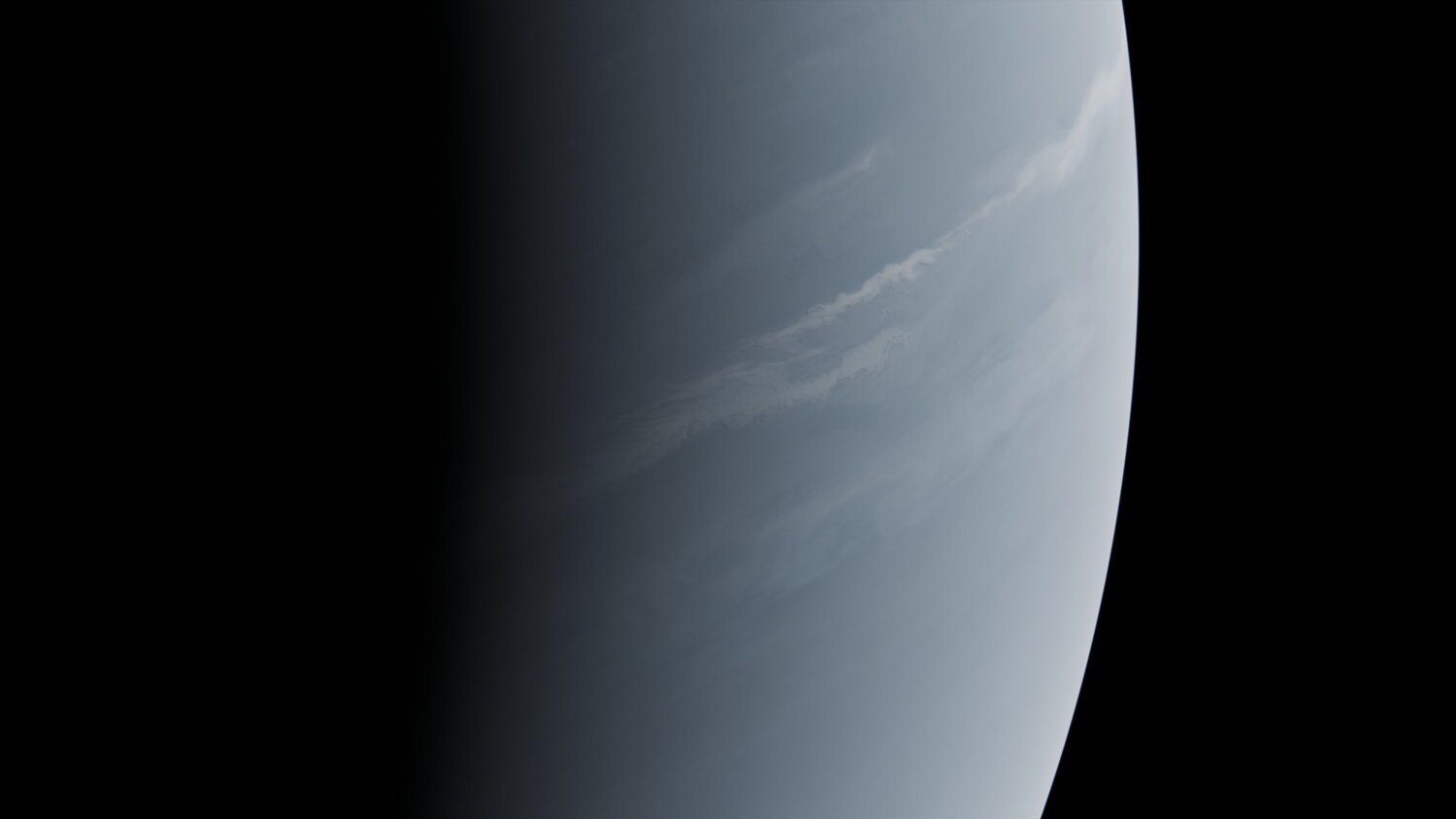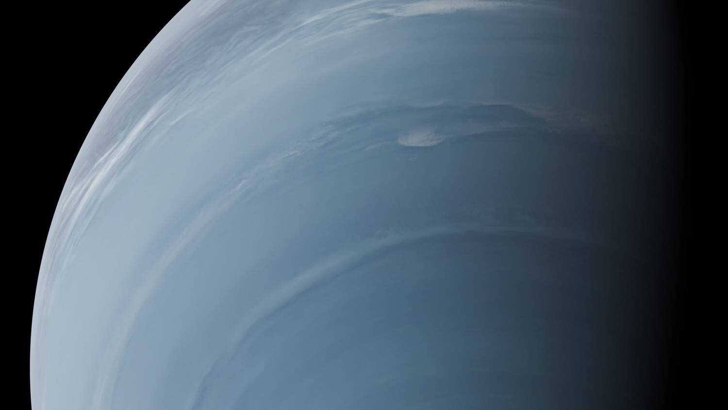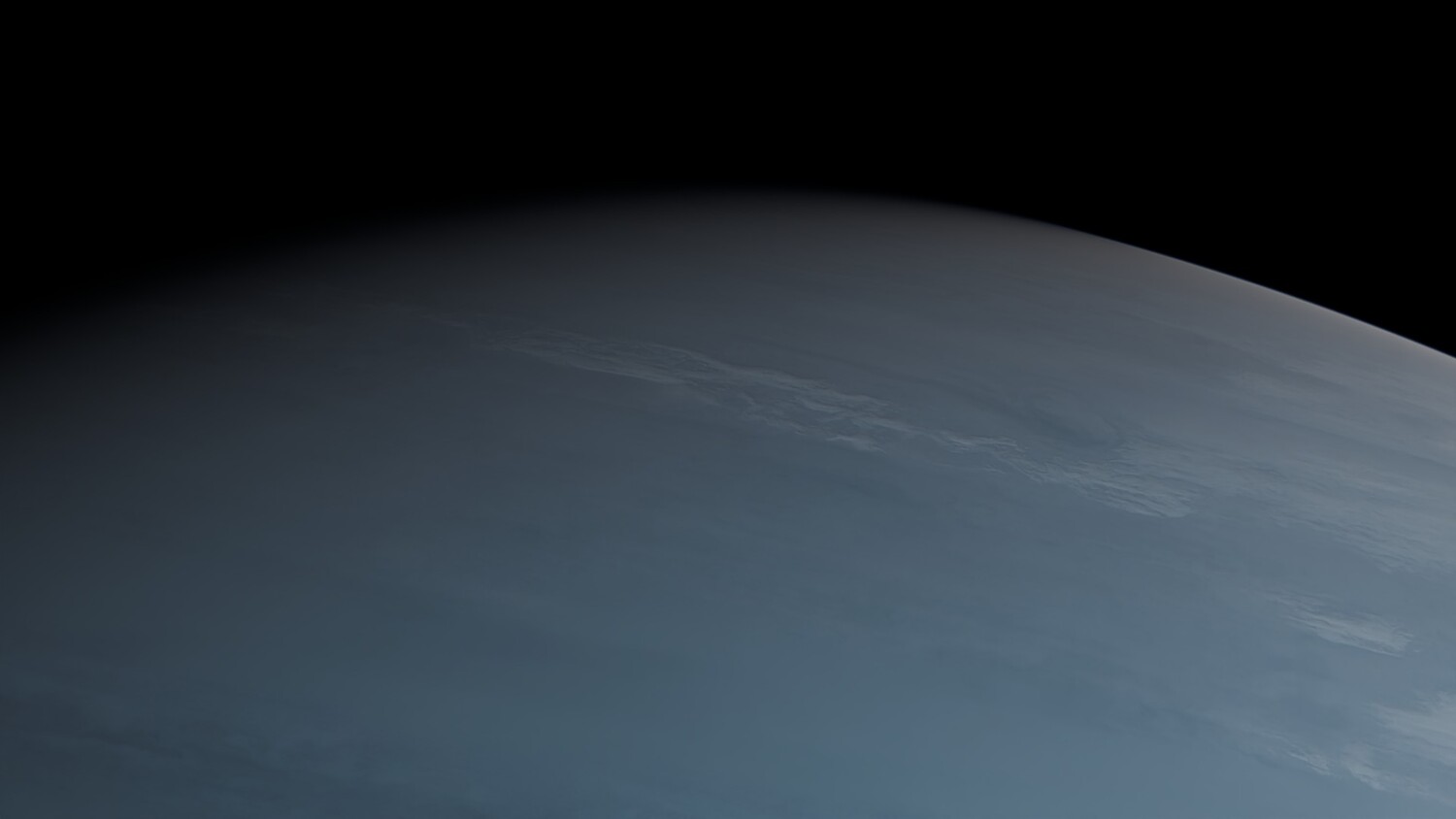 This 3D representation of Neptune is based on scientific data regarding its chemical composition and atmospheric dynamics. The physically based textures incorporate visual features of high-altitude methane ice crystal clouds, derived from real images taken by Voyager 2 and the Hubble Space Telescope.