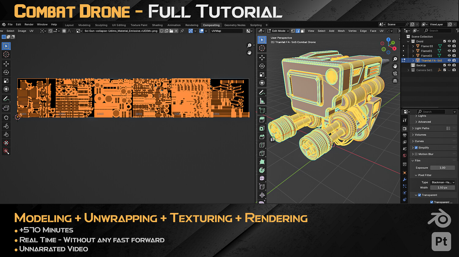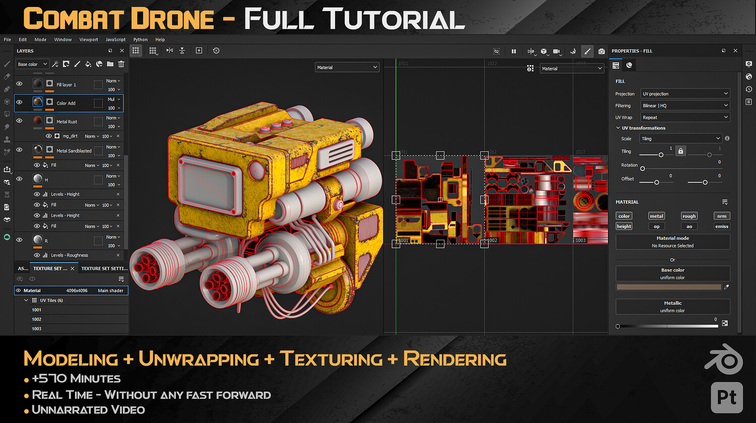 Texturing and Rendering +2.5 hours of Texturing and Rendering: for the texturing part in the Substance Painter we start the texturing process with UDIMS or UV tile Option. After creating texture for this Drone we are going to render it in the Blender and finalize the project!