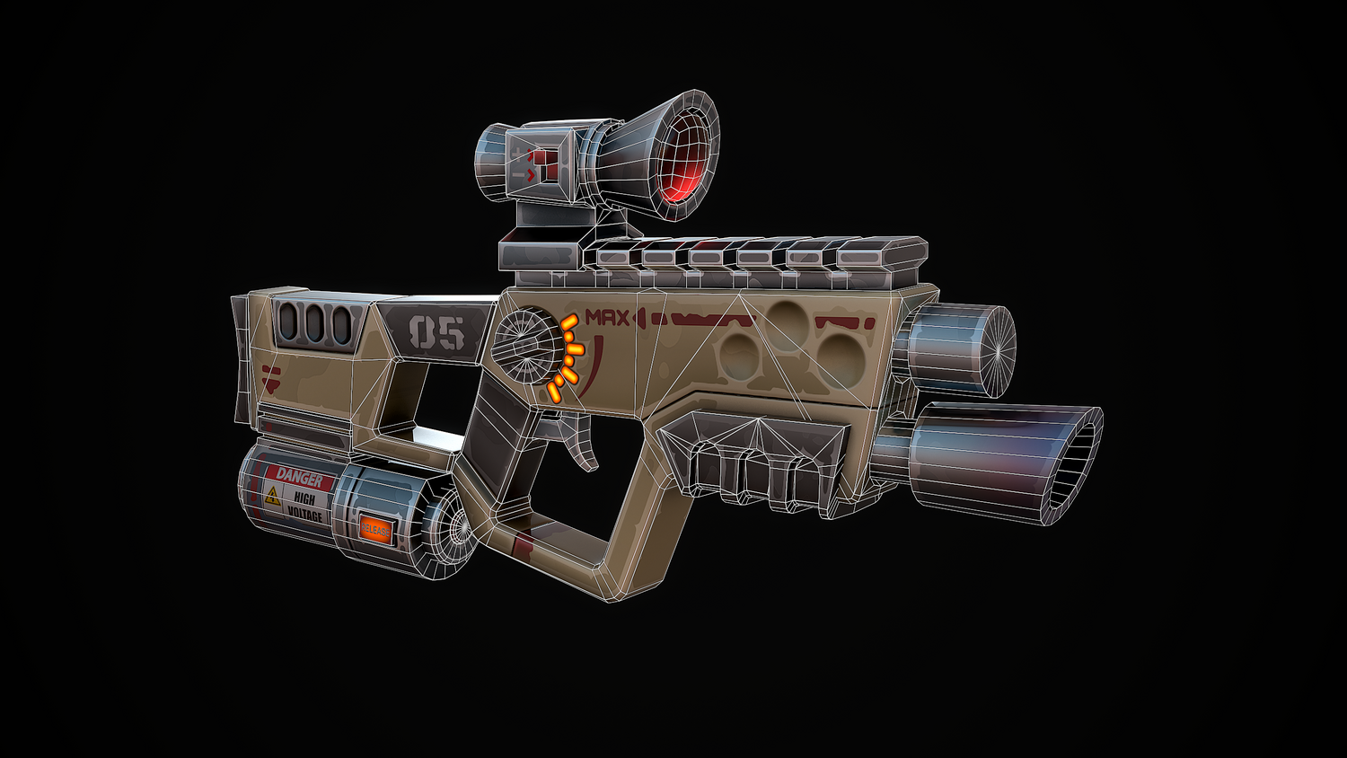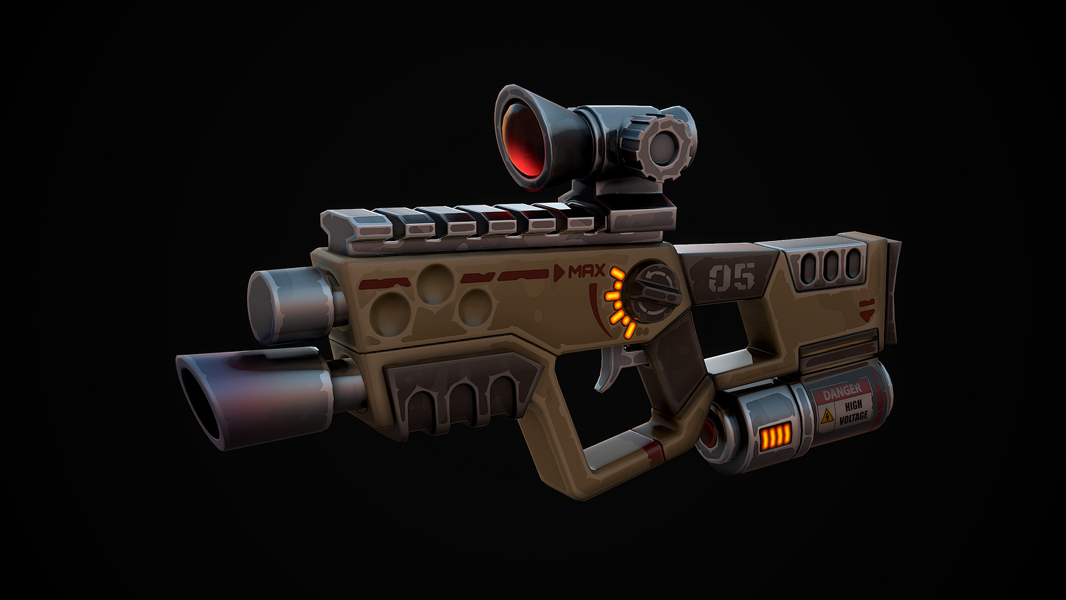 A low-poly 3D model of a Stylized Laser SMG doesn't contain n-gons and has optimal topology. The archive includes such 2K textures: base color map, metalness map, normal map (OpenGL), roughness map, and Emissive map. Images were rendered in Marmoset.