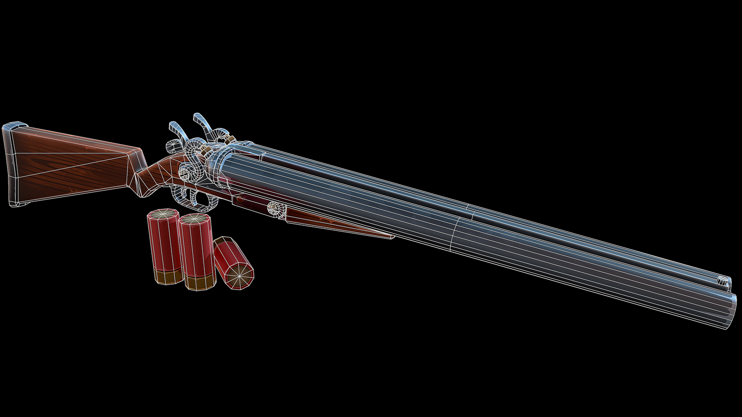 Low-poly 3D models of Stylized double-barreled Shotgun (2142 polys) and Shotgun Shell (30 polys) don't contain any n-gons and have optimal topology. The archive with textures contains such two folders: