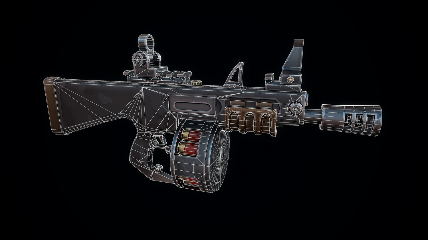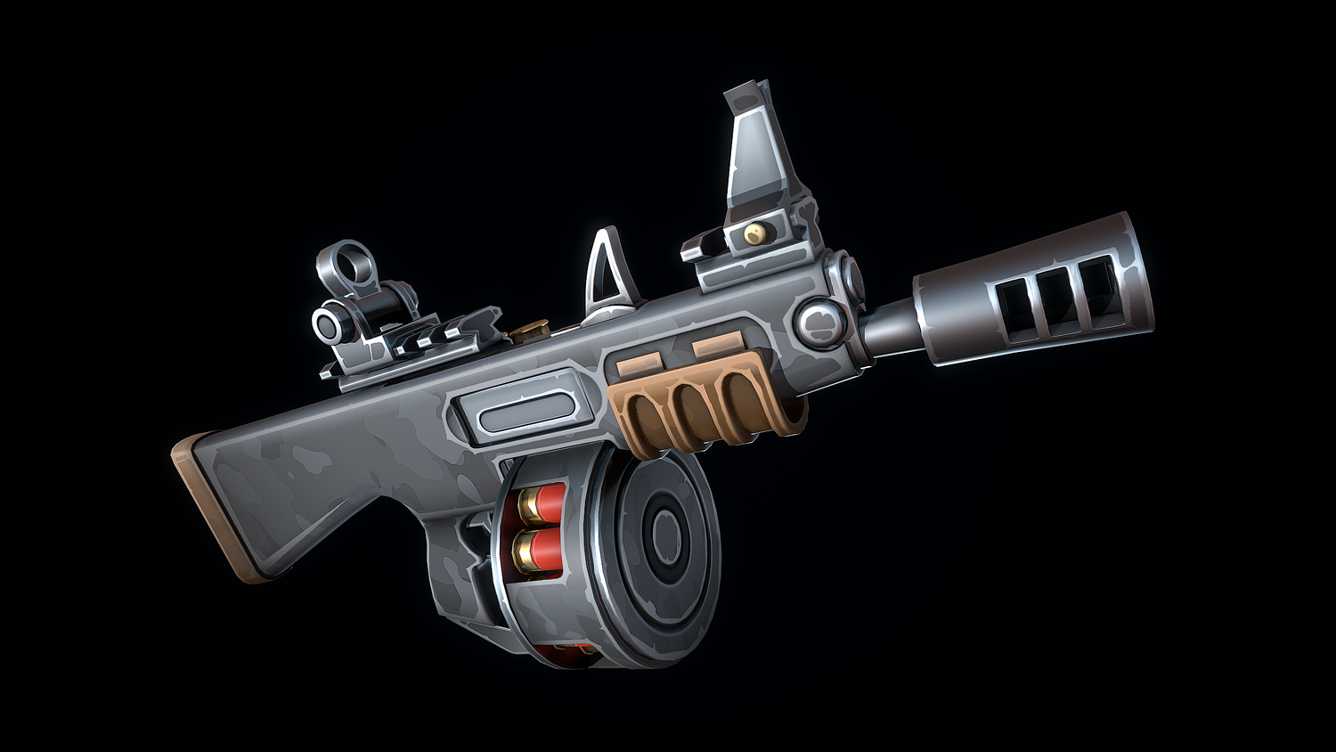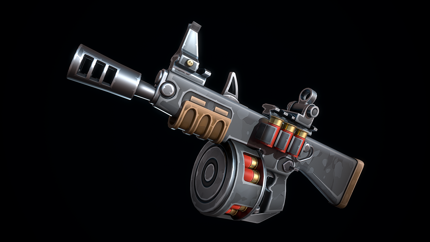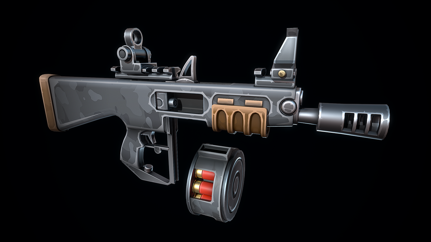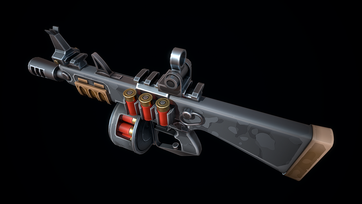 The low-poly 3D model of a Stylized Automatic Shotgun doesn't contain any n-gons and has an optimal topology. The archive includes such 2K textures: base color map, metalness map, normal map (OpenGL), and roughness map. Images were rendered in Marmoset.
