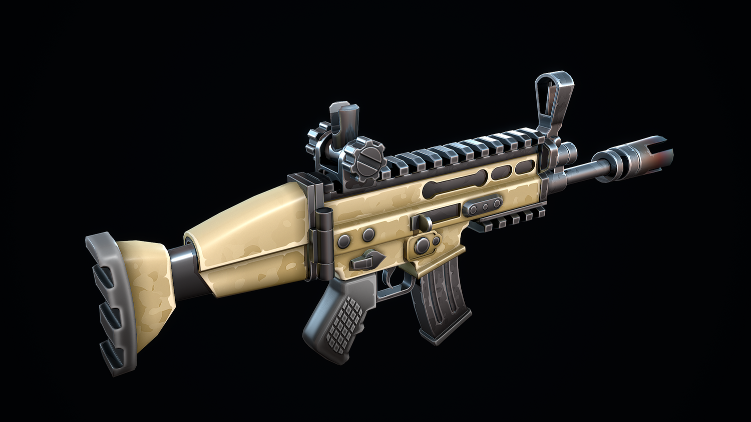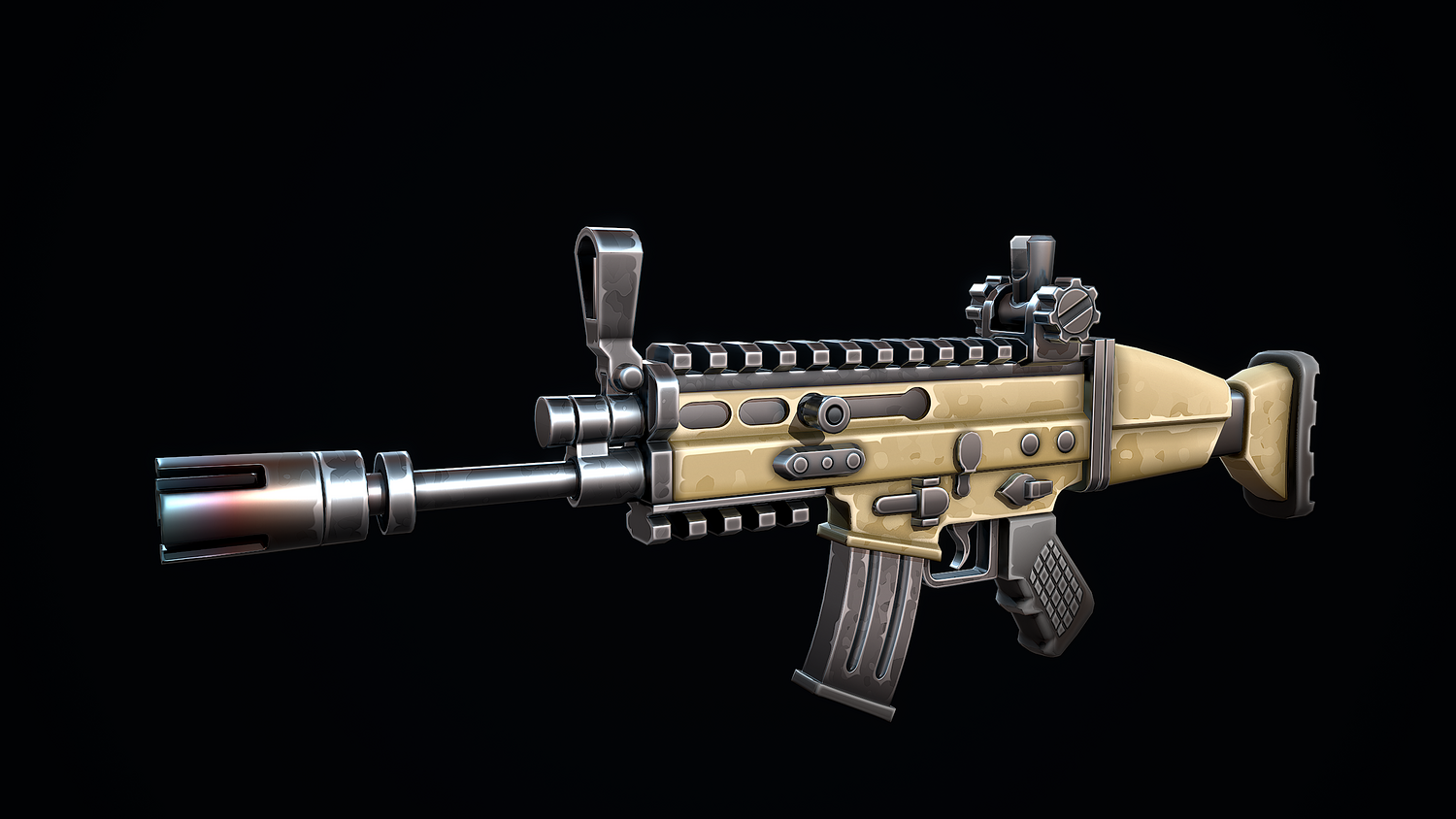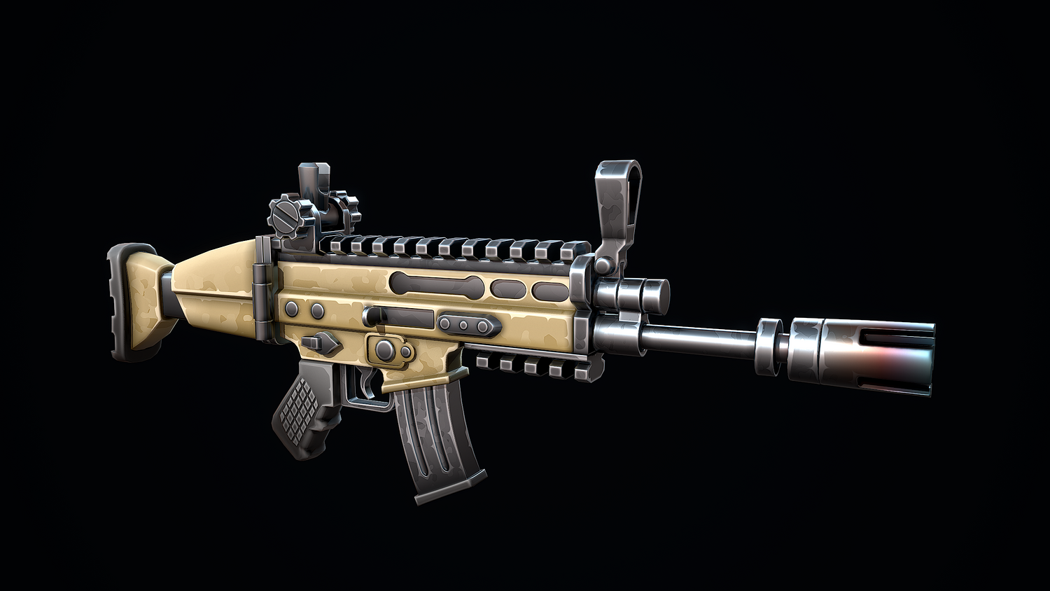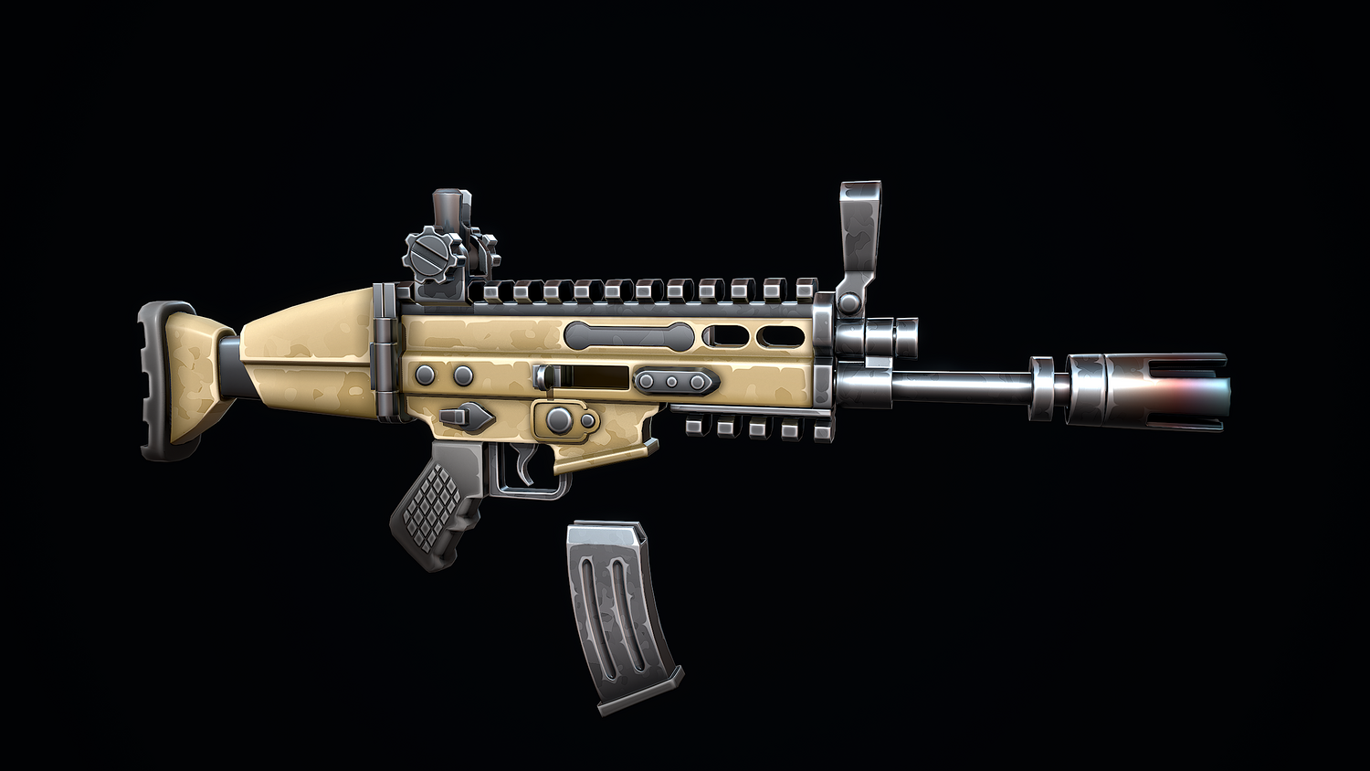 A low-poly 3D model of a Stylized Modern Assault Rifle doesn't contain n-gons and has optimal topology. The archive includes such 2K textures: base color map, metalness map, normal map (OpenGL), and roughness map. Images of the model were rendered in Marmoset.
