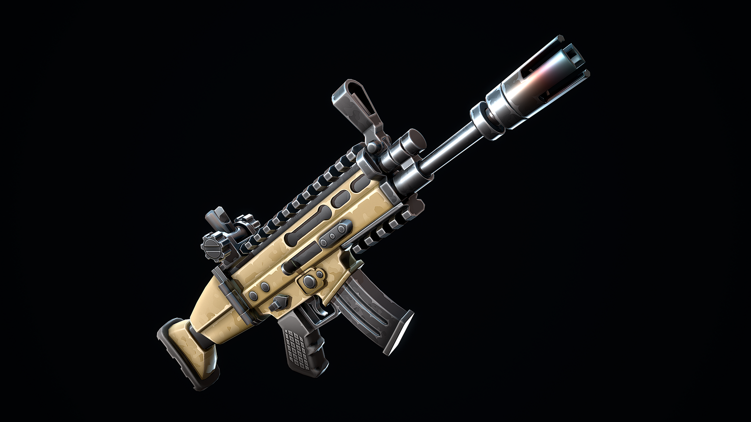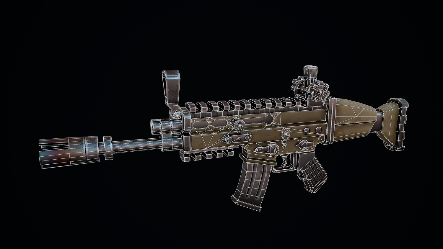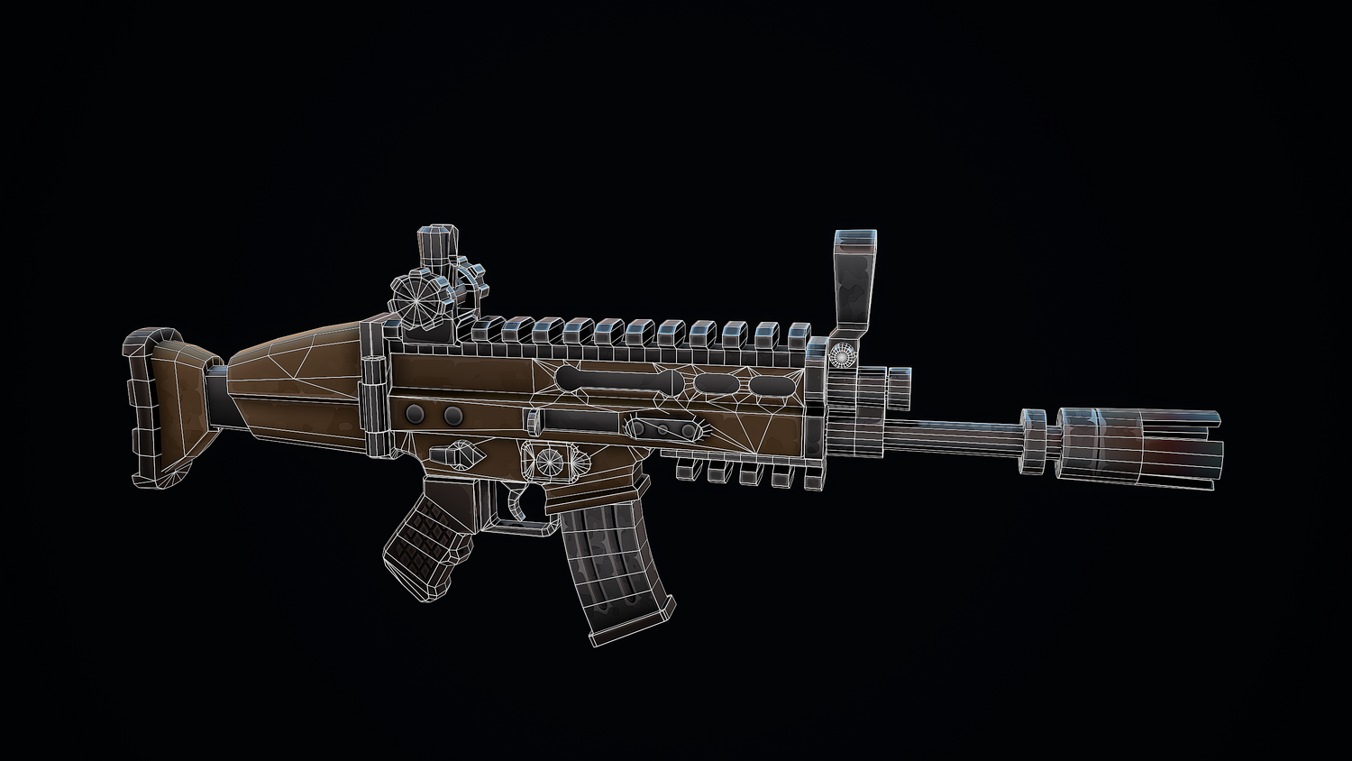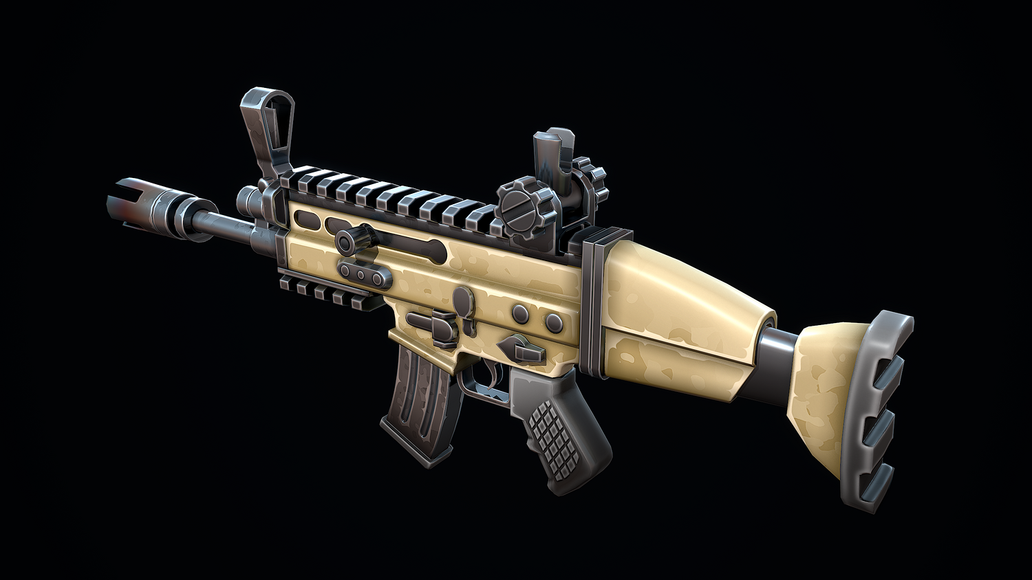 A low-poly 3D model of a Stylized Modern Assault Rifle doesn't contain n-gons and has optimal topology. The archive includes such 2K textures: base color map, metalness map, normal map (OpenGL), and roughness map. Images of the model were rendered in Marmoset.