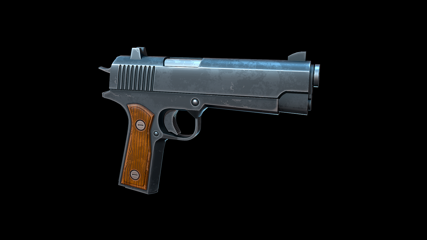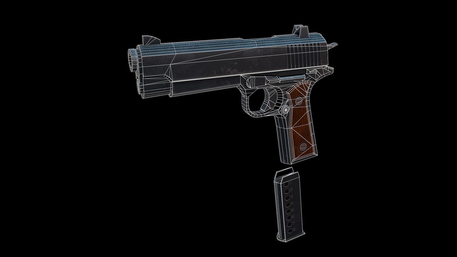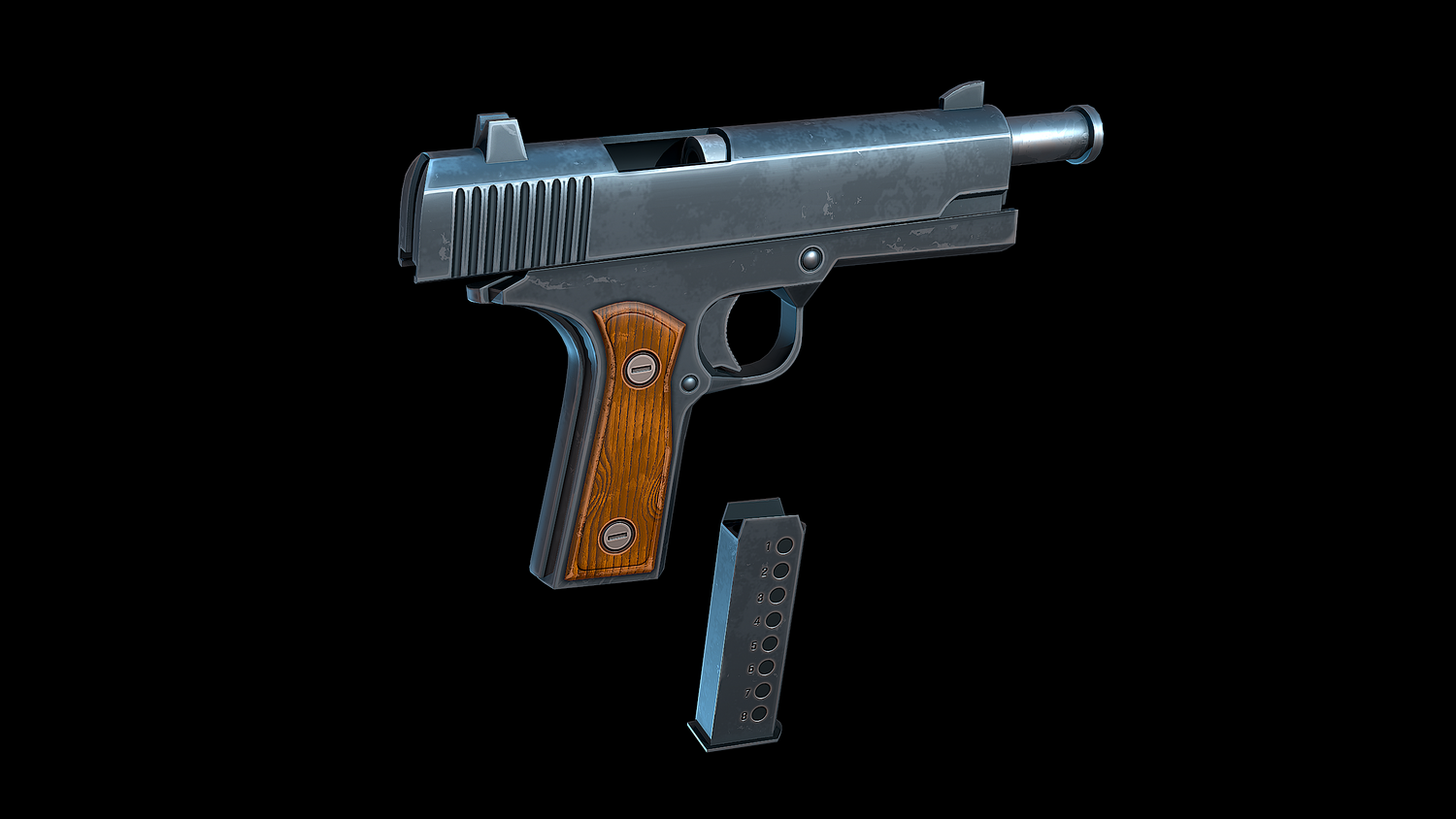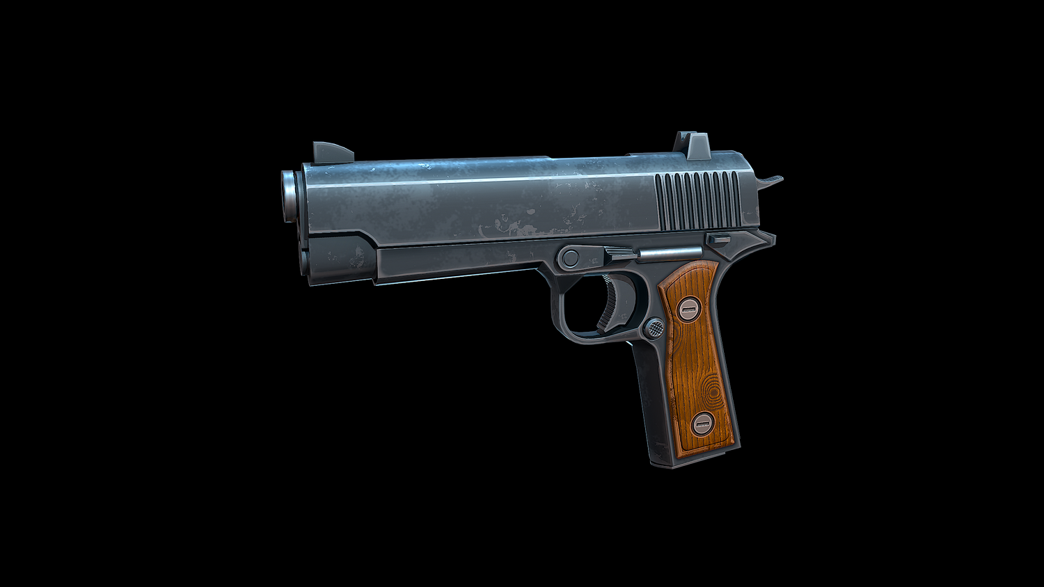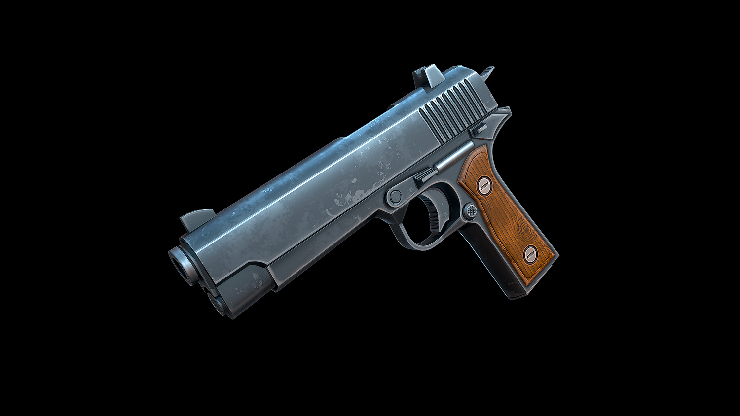 A low-poly model of the Stylized Classic Handgun doesn't contain any n-gons and has optimal topology. The archive includes such 2K textures: base color map, metalness map, normal map (OpenGL), and roughness map. Images were rendered in Marmoset.