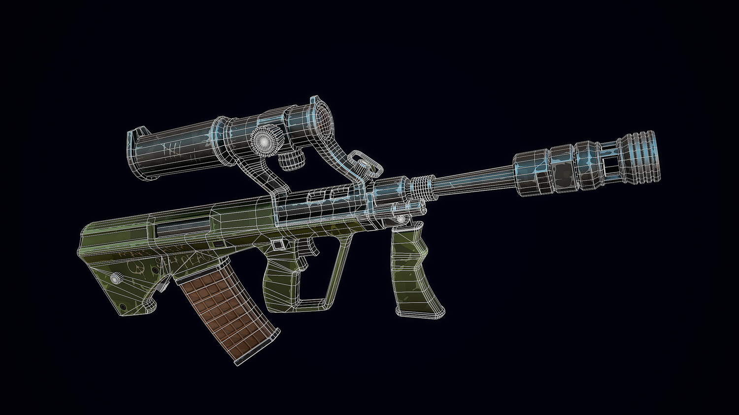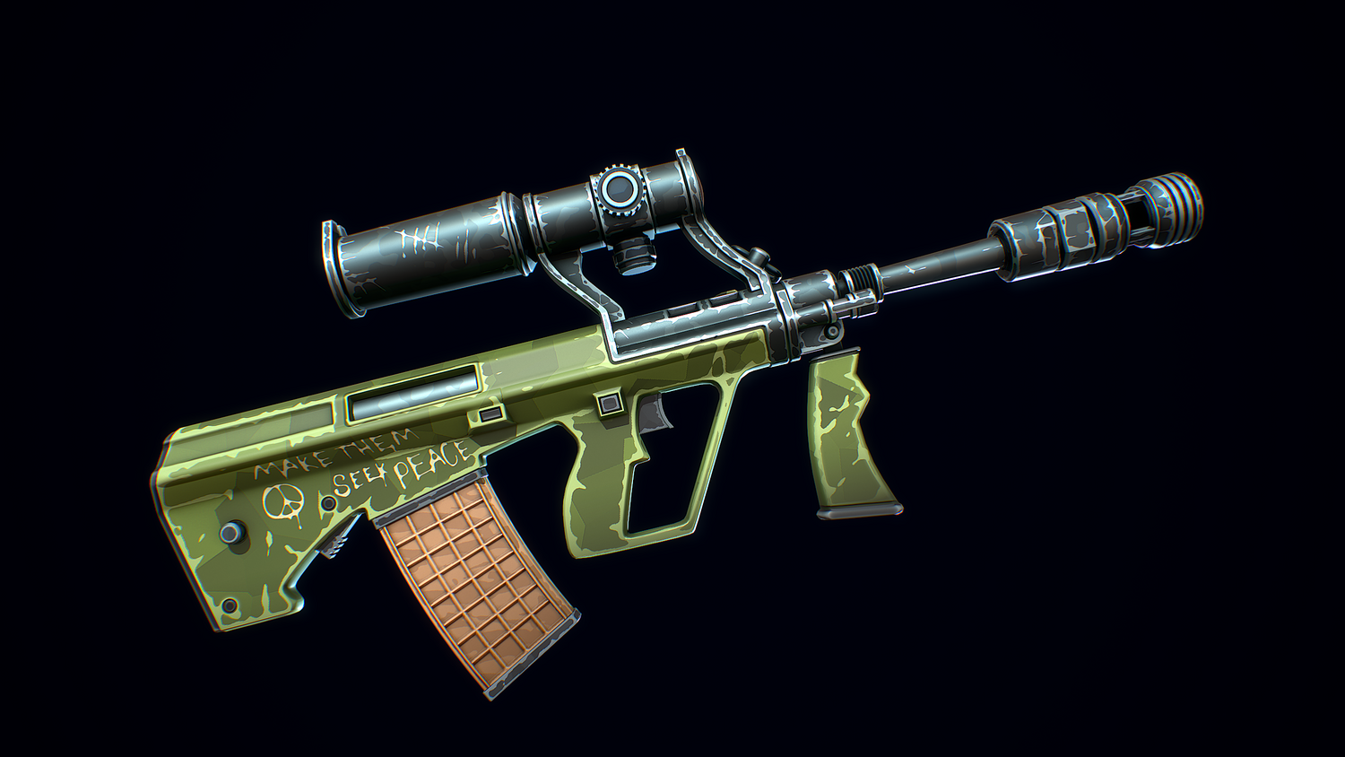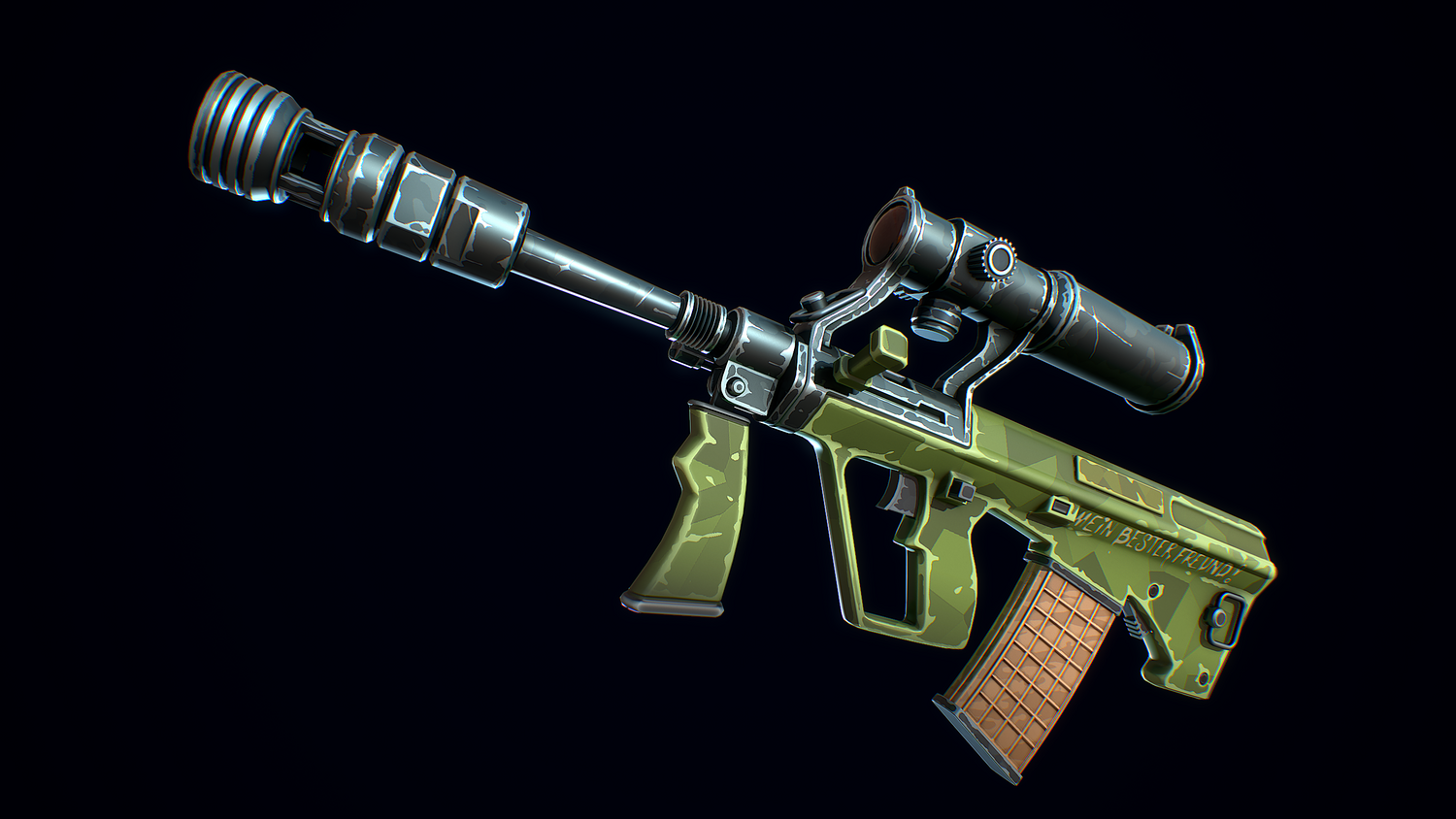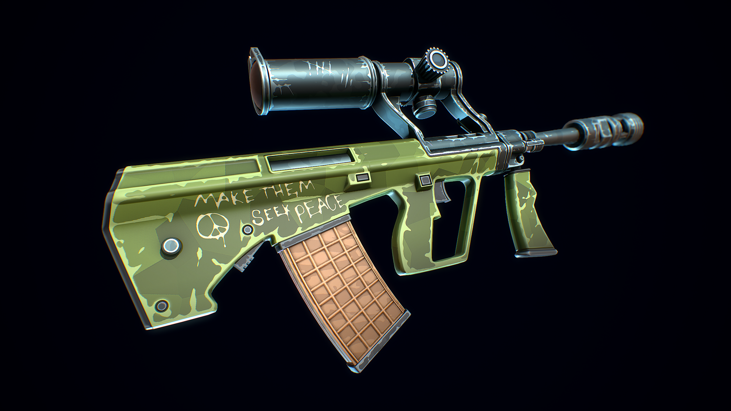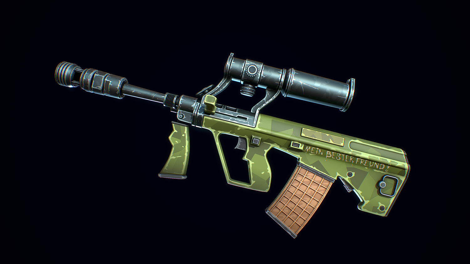 A low-poly 3D model of a Stylized Steyr AUG doesn't contain any n-gons and has optimal topology. The archive includes such 2K textures: base color map, metalness map, normal map (OpenGL), and roughness map. Images were rendered in Marmoset.