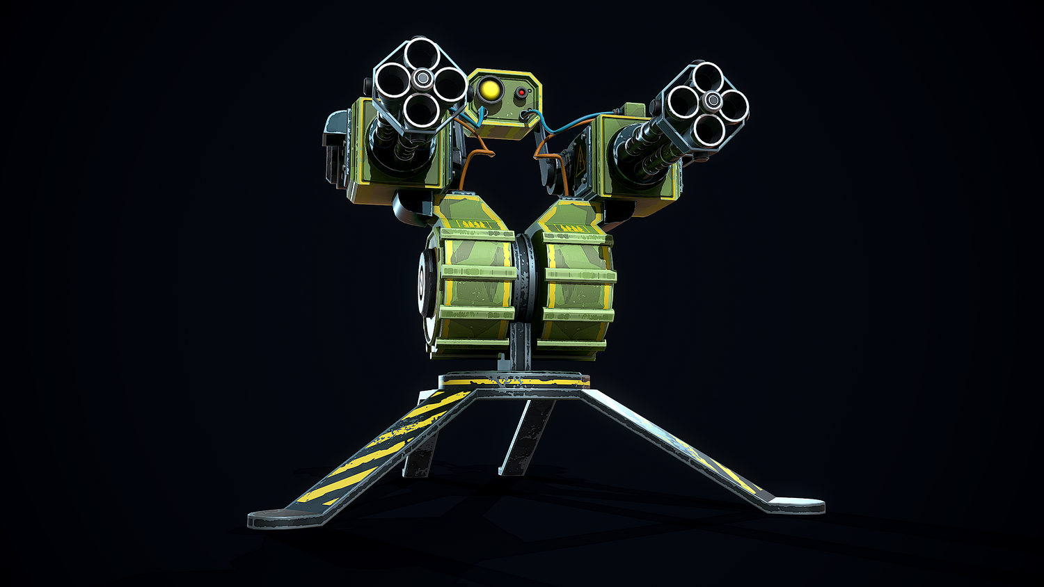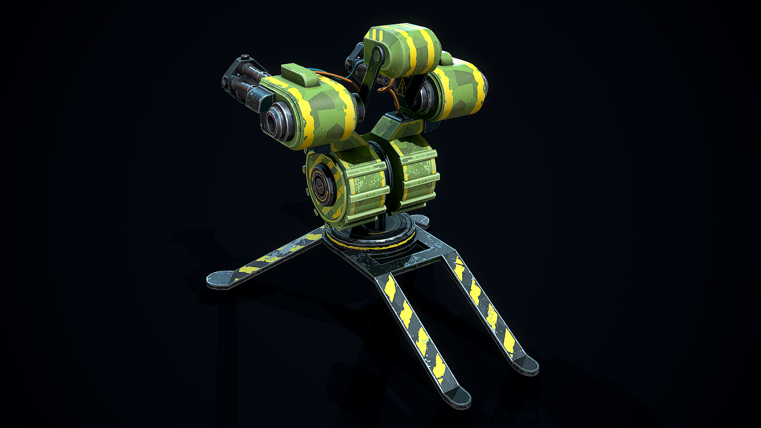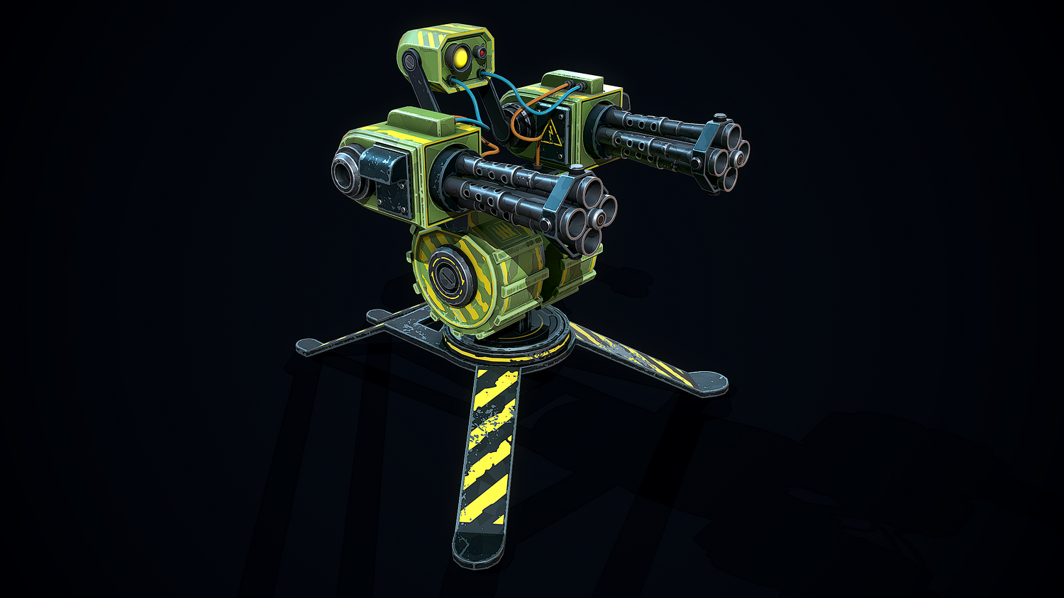 The low-poly 3D model of the Stylized Automated Turret doesn't contain any n-gons and features optimal topology. The archive includes such 2K textures: base color map, metalness map, normal map (OpenGL), roughness map, and emissive map. Images were rendered in Marmoset.