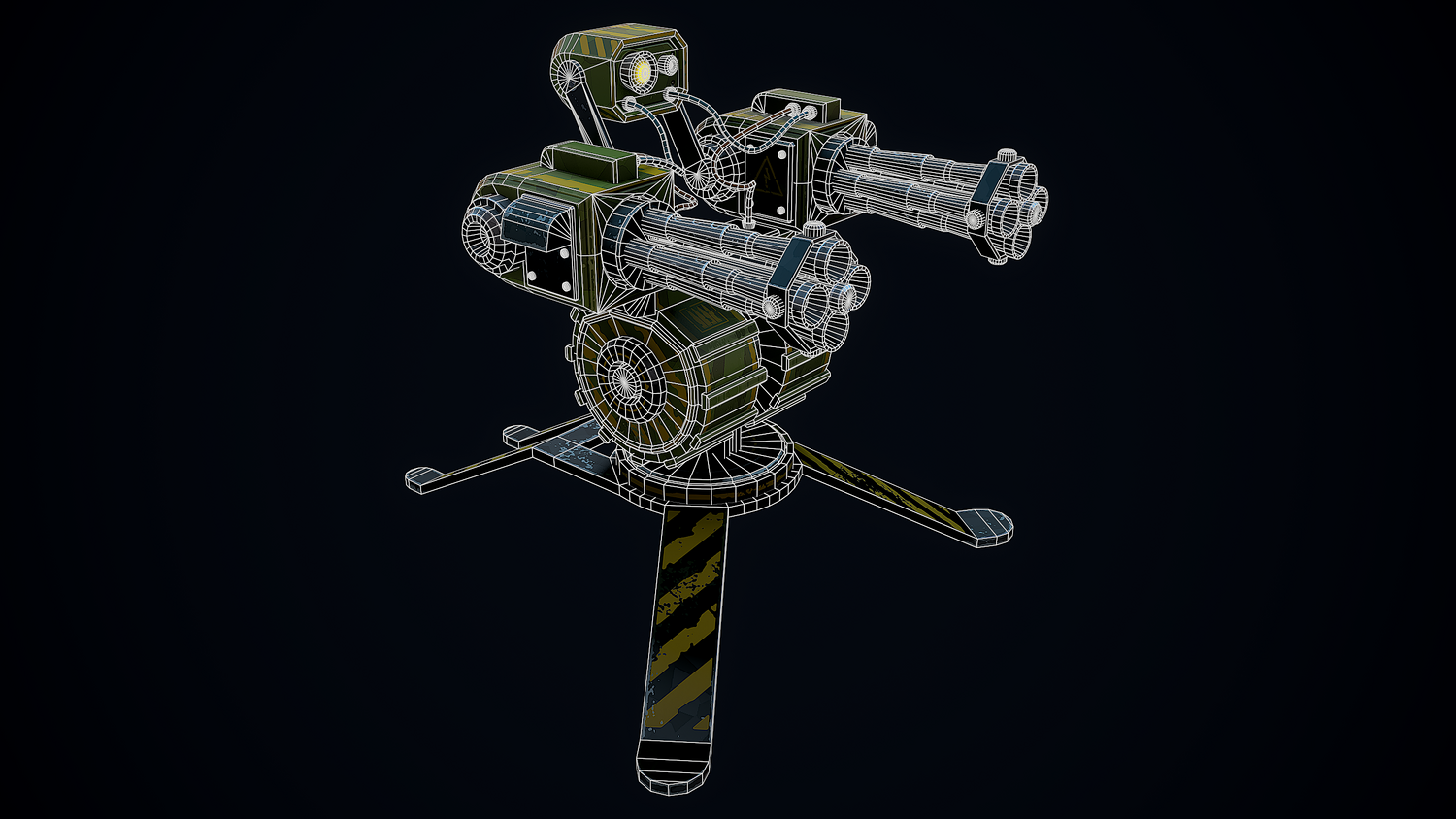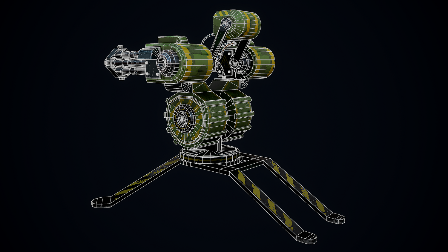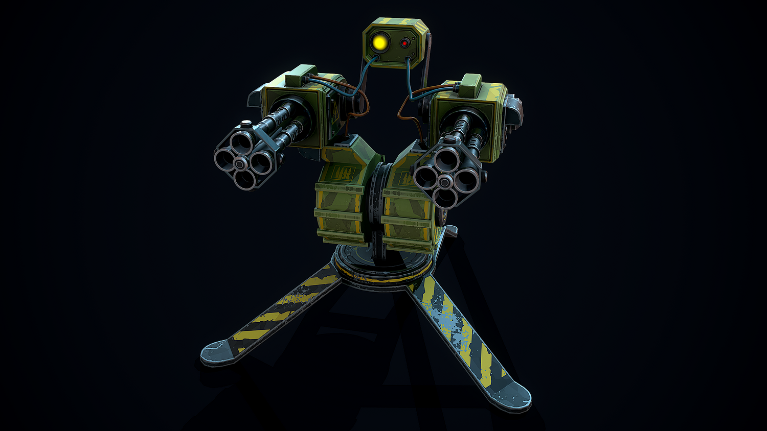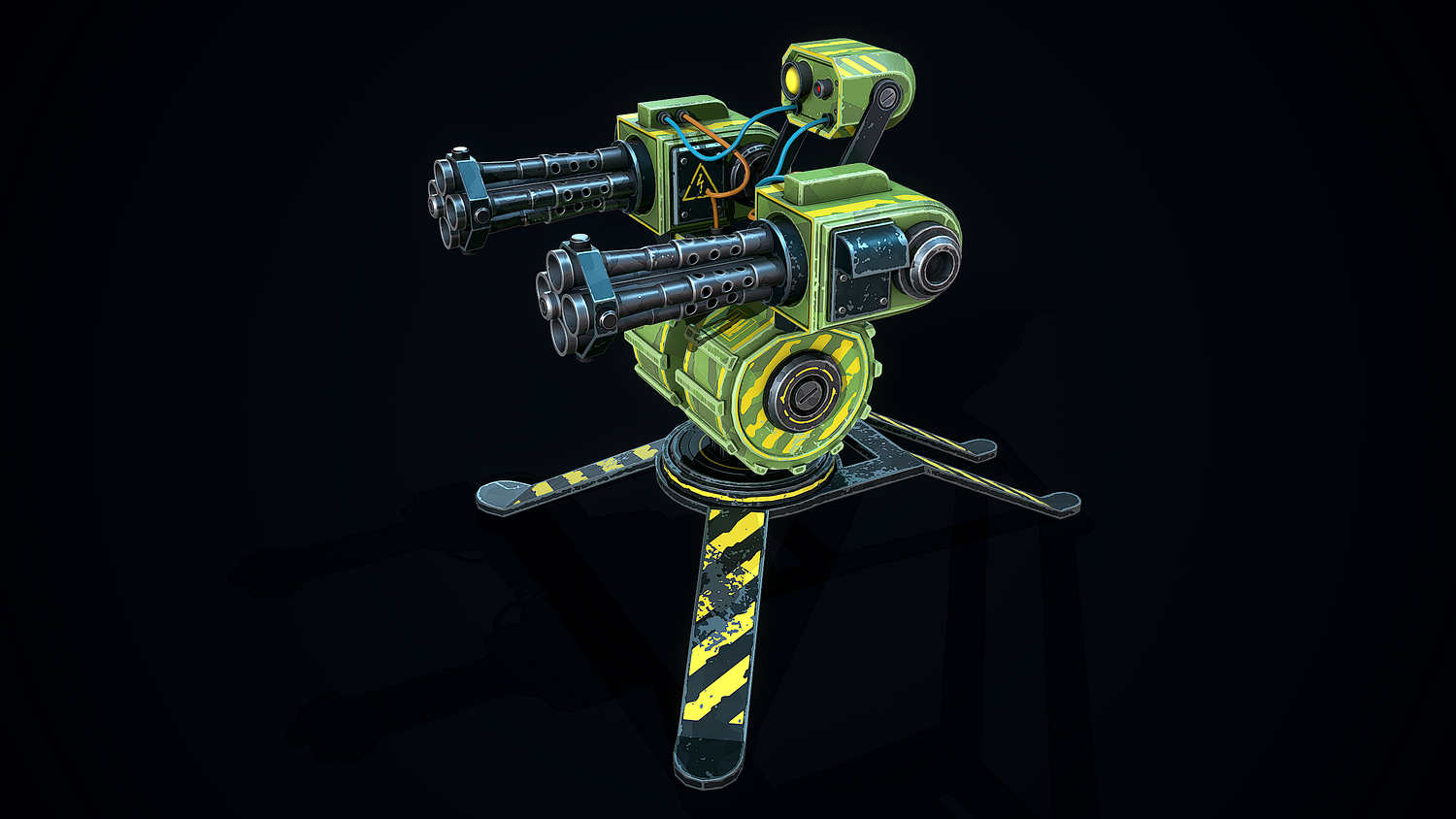 The low-poly 3D model of the Stylized Automated Turret doesn't contain any n-gons and features optimal topology. The archive includes such 2K textures: base color map, metalness map, normal map (OpenGL), roughness map, and emissive map. Images were rendered in Marmoset.