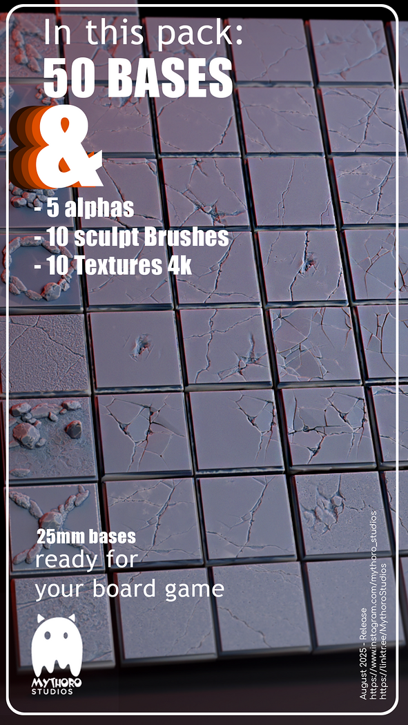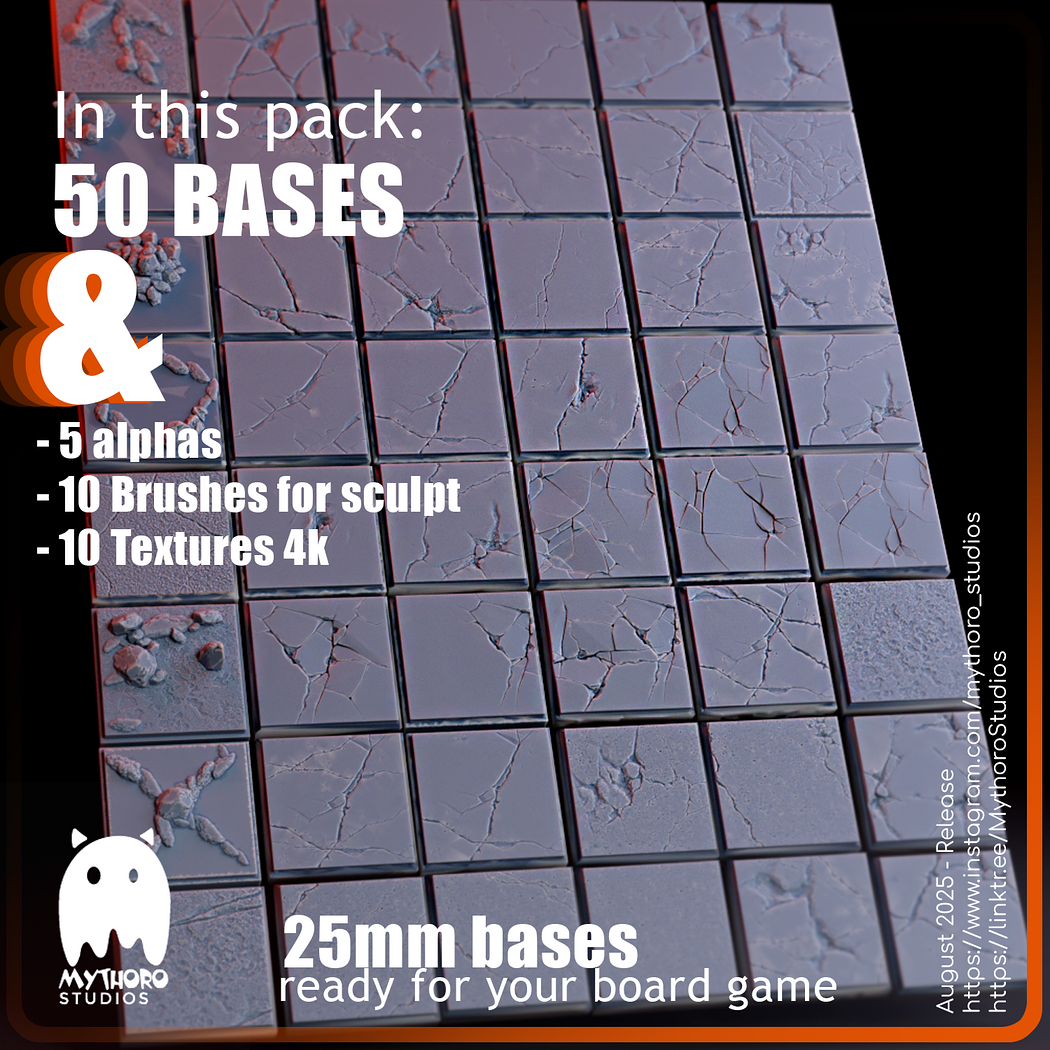 Inside this pack you’ll get: ⚔️ 50 Bases (25mm) for board games & RPGs 🗿 5 Alphas to enhance your models 🌌 10 High-Res 4K Textures 🖌️ 10 Brushes for digital sculptors