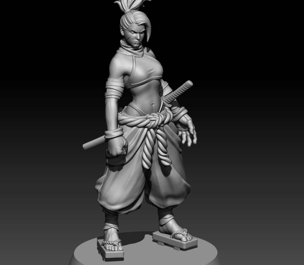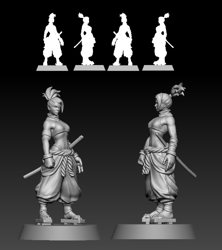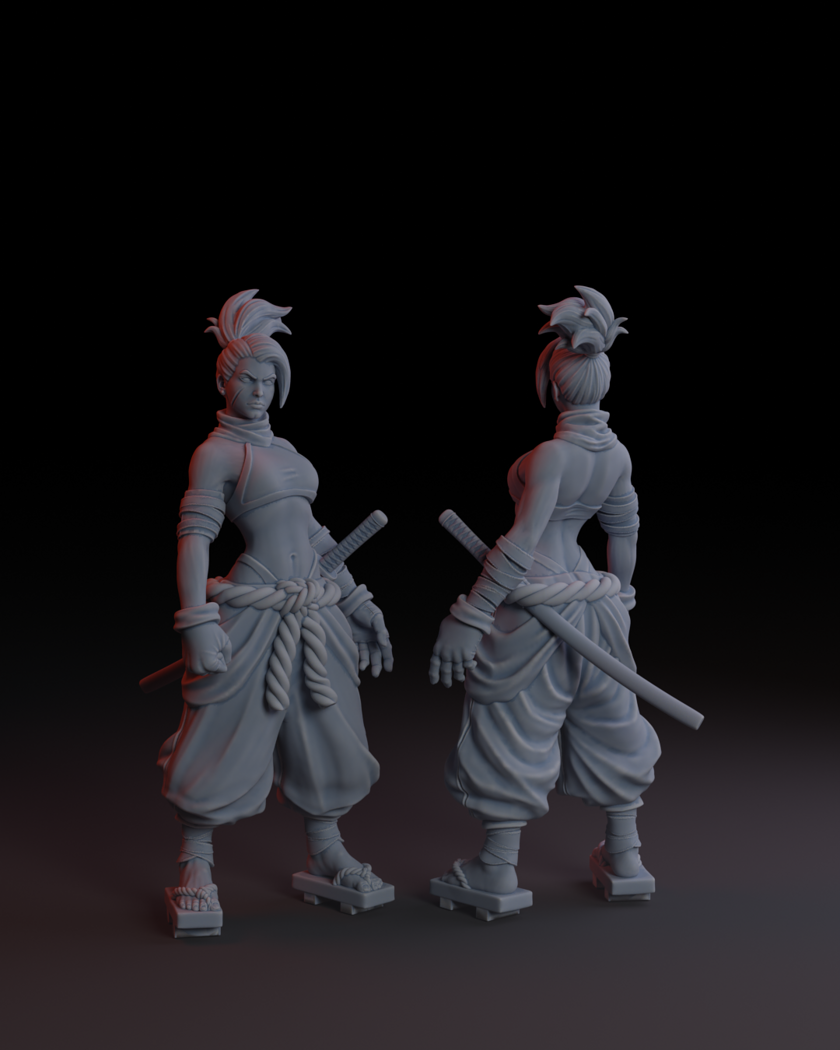 Her wooden sandals balance tradition and practicality, while the swords on her back suggest that no foe is beyond her reach. 🌟 Highlights: Confident pose, meticulous detail in her clothing and textures, perfect for stealth missions in RPGs or board games!