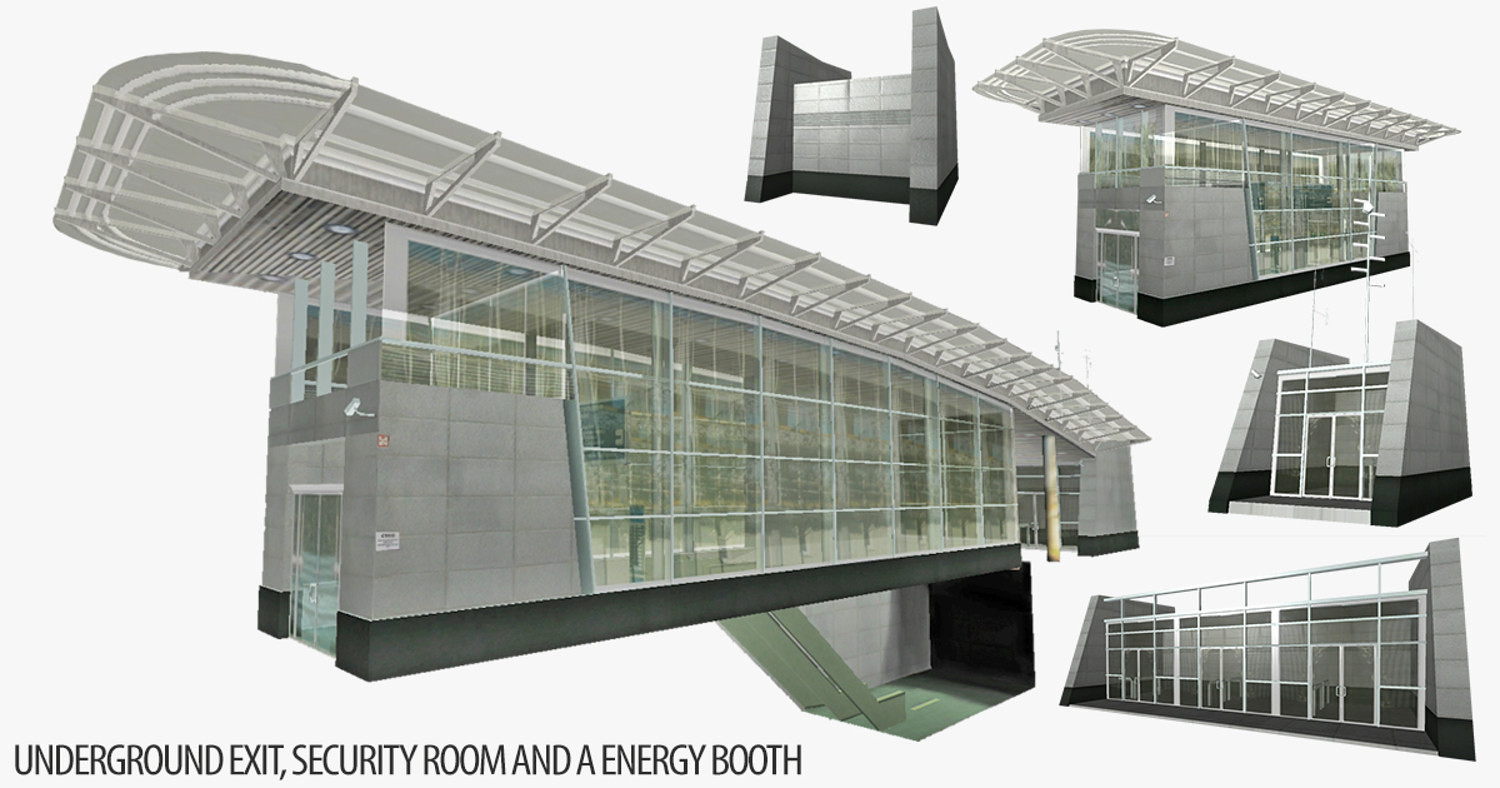 Underground Exit, Security Room and a Energy Booth are variations of the same model. They have same elements and use same materials and textures. There are six models in different sizes – from small energy booth and security room to big underground station exit.