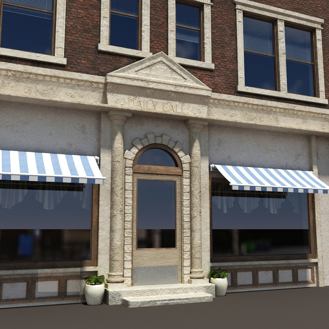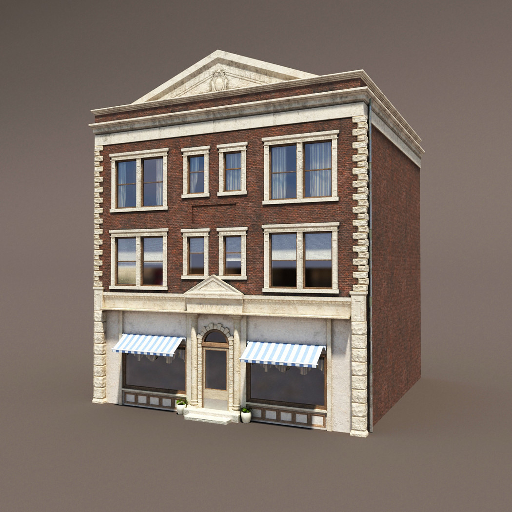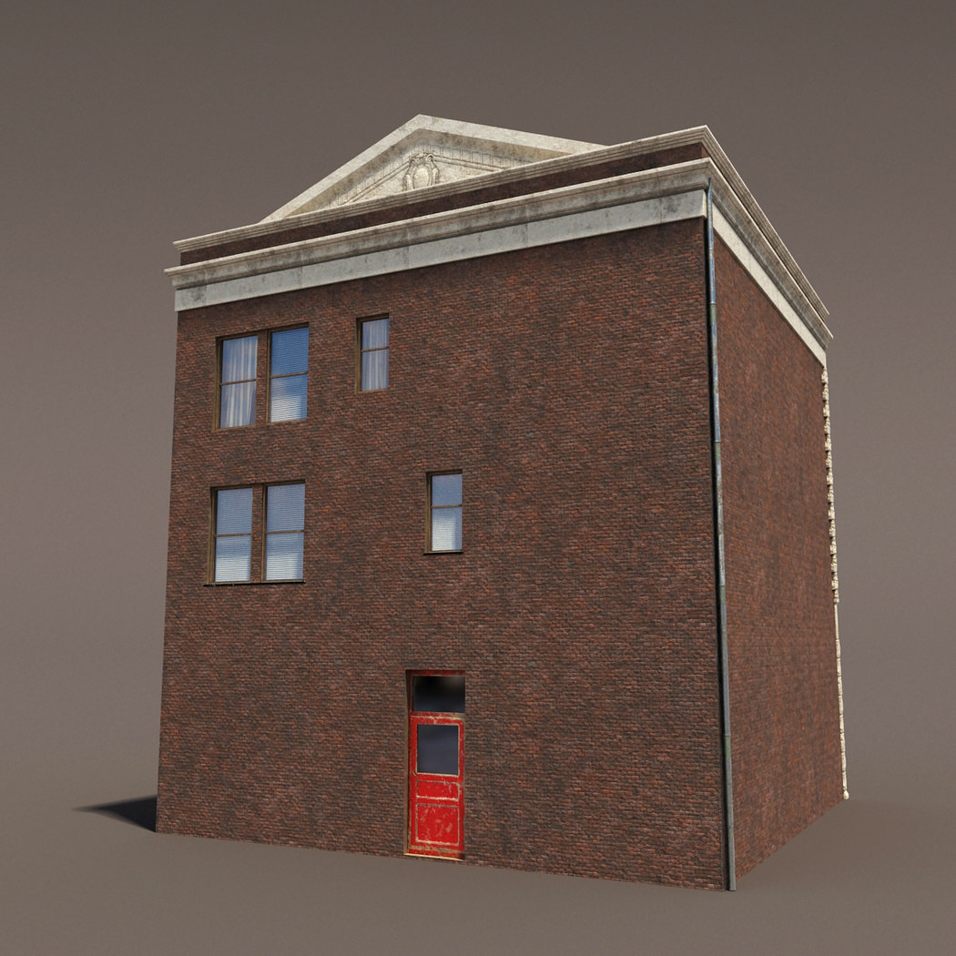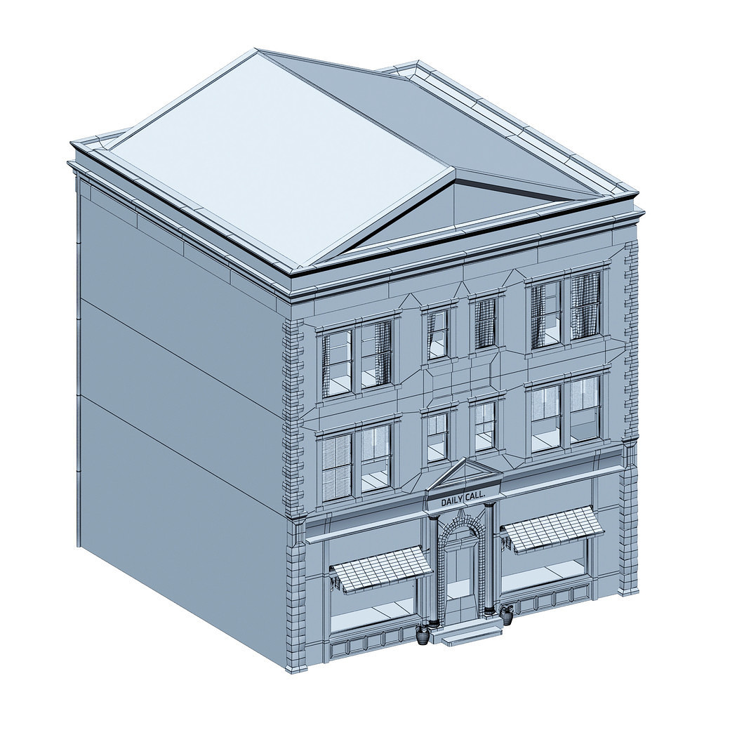 A 3D model of a low poly neoclassical building. Exterior with interior walls and window shades.