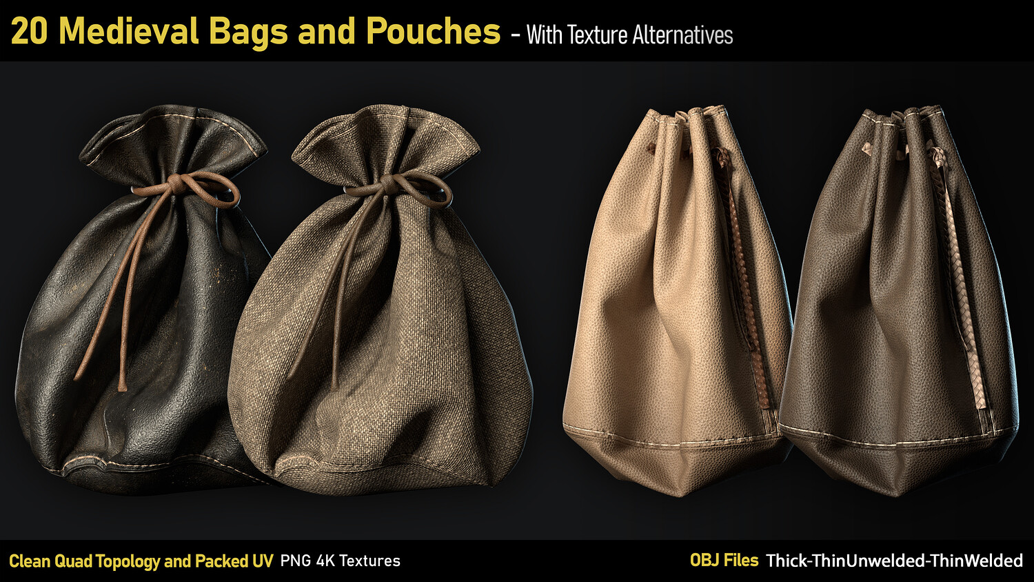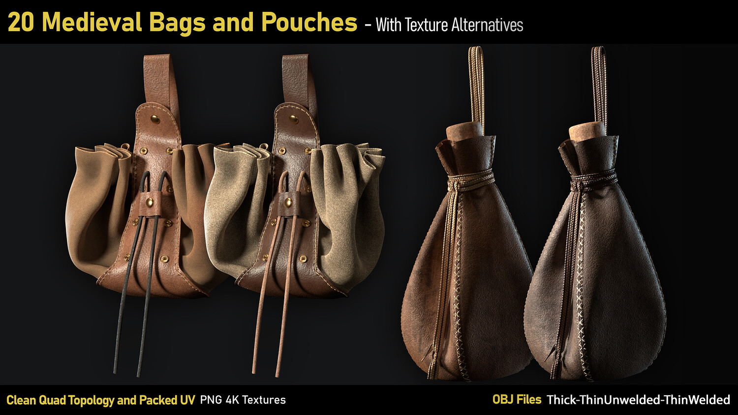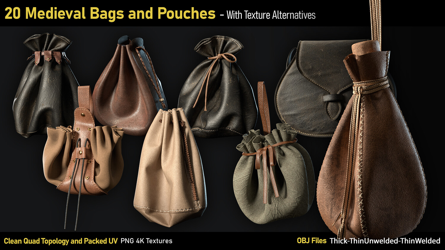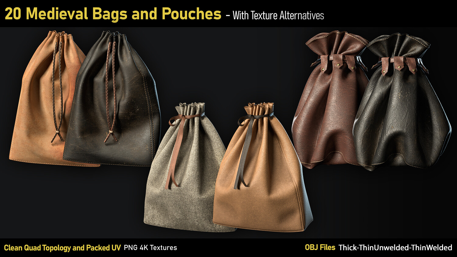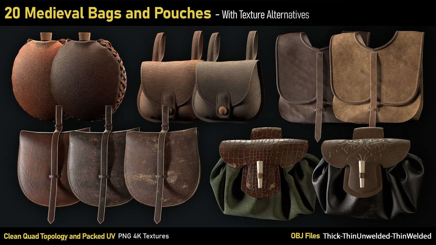 20 Medieval Bags & Pouches-OBJ-4K Textures