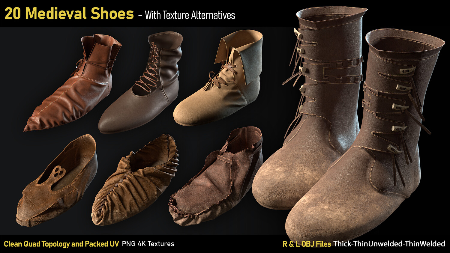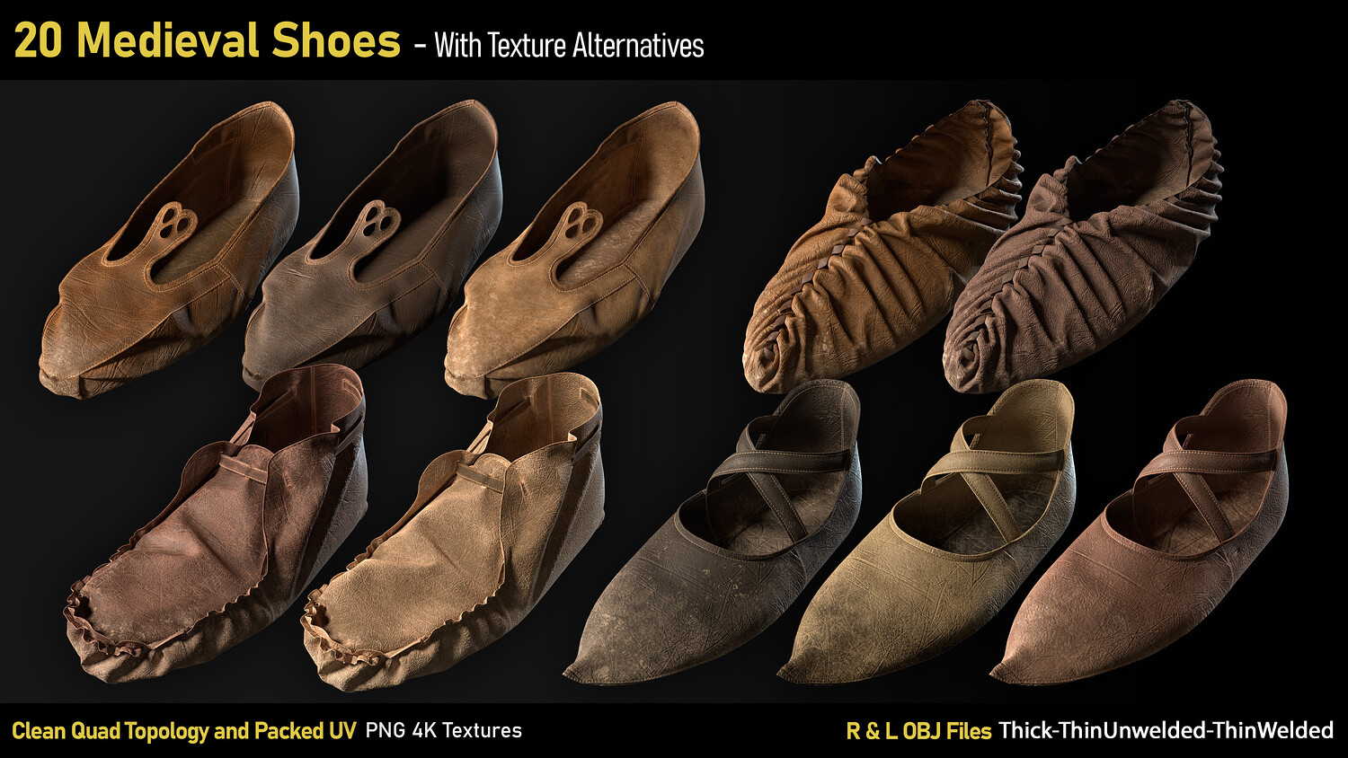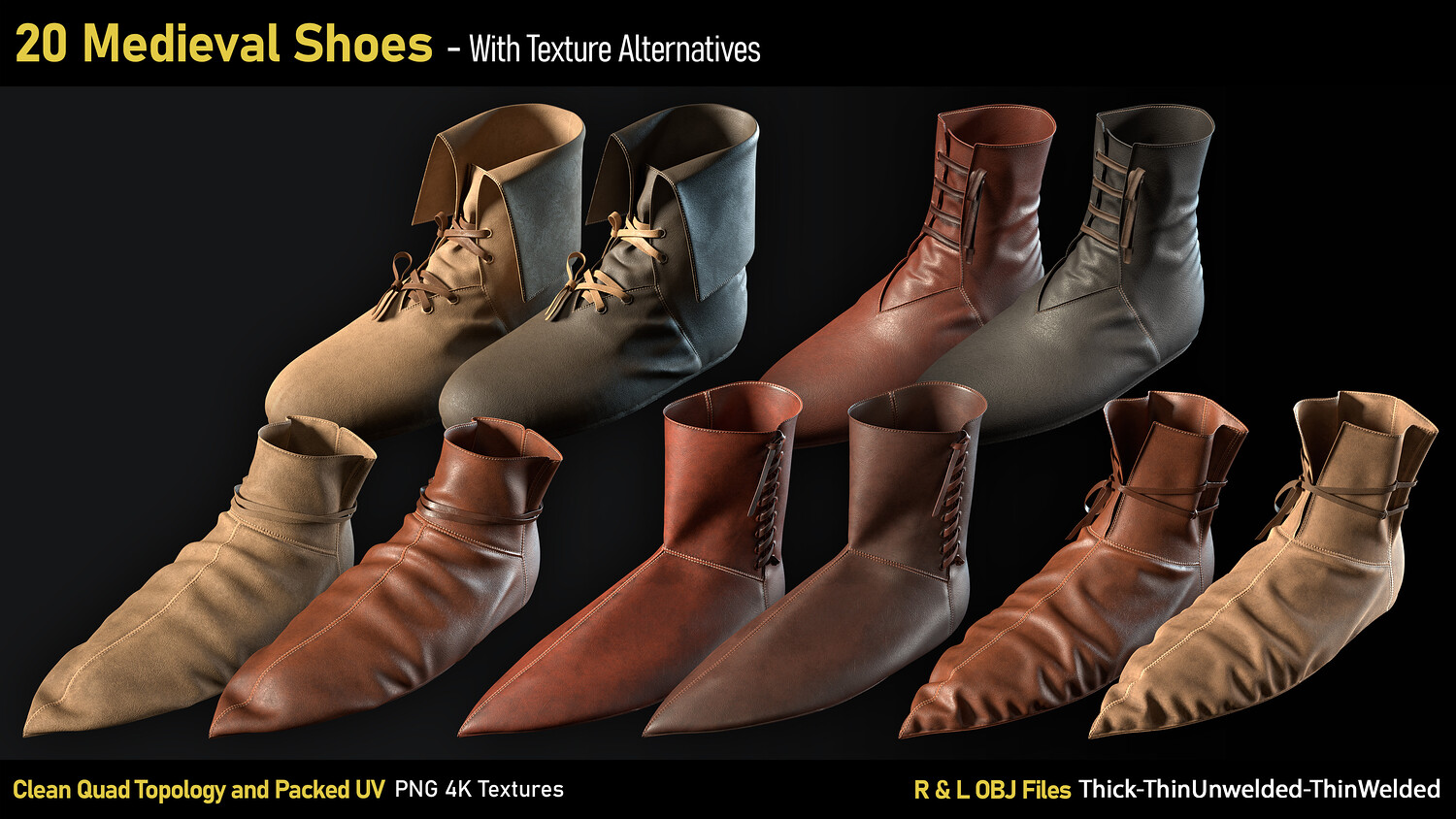 This is a package that contains 20 different models of medieval themed shoes and boots. You can speed up your workflow by using these models.