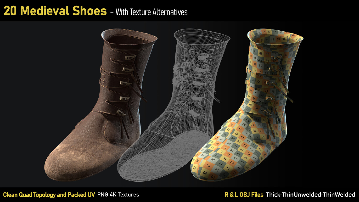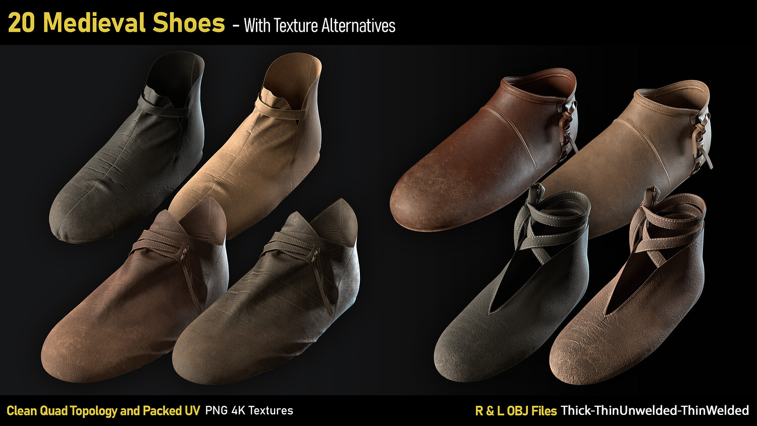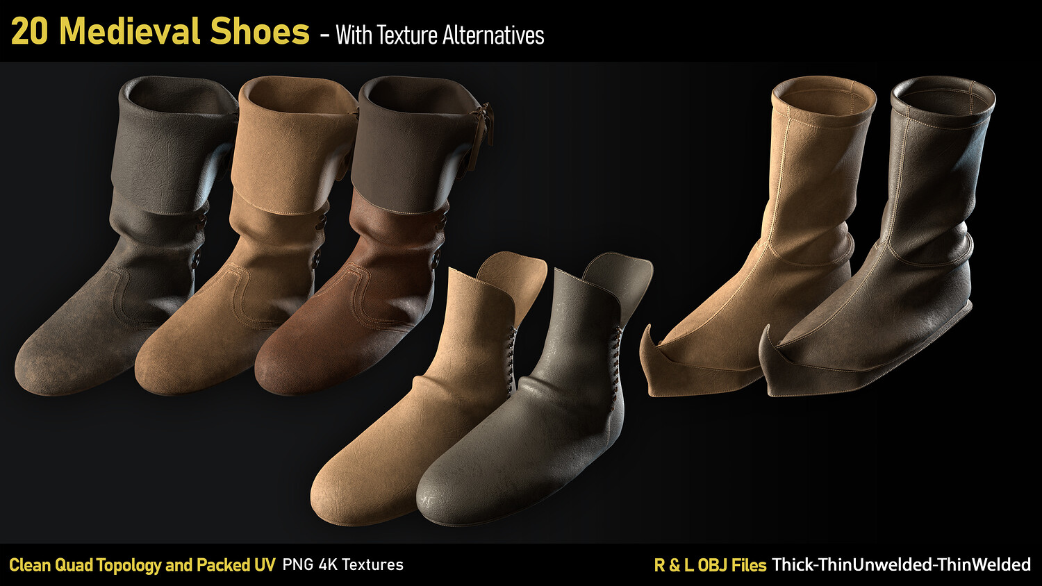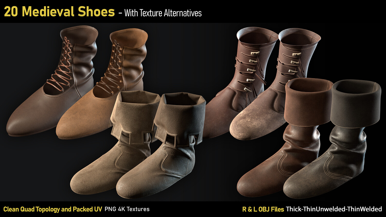 This is a package that contains 20 different models of medieval themed shoes and boots. You can speed up your workflow by using these models.