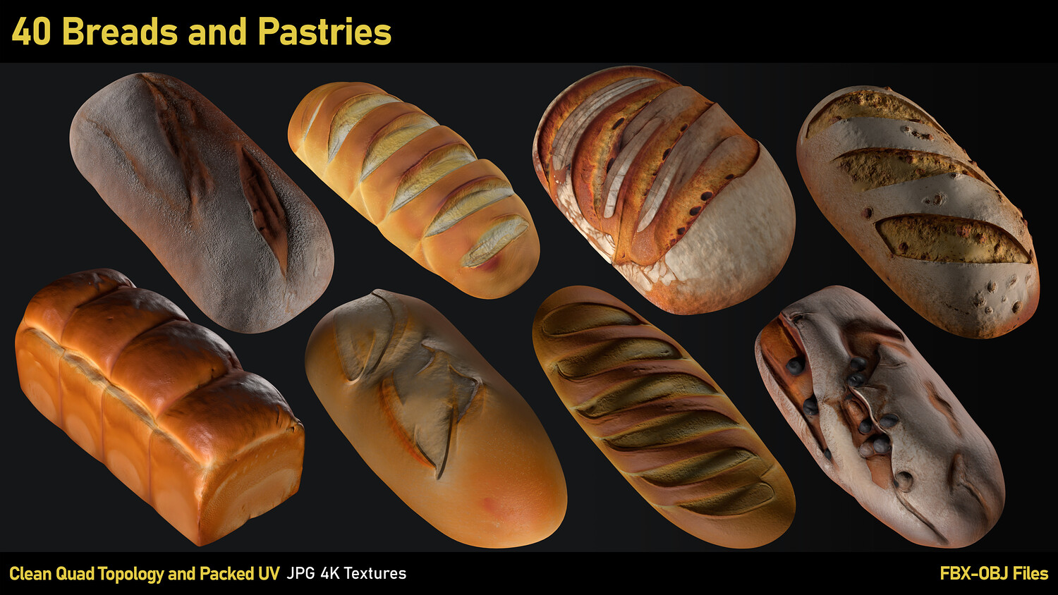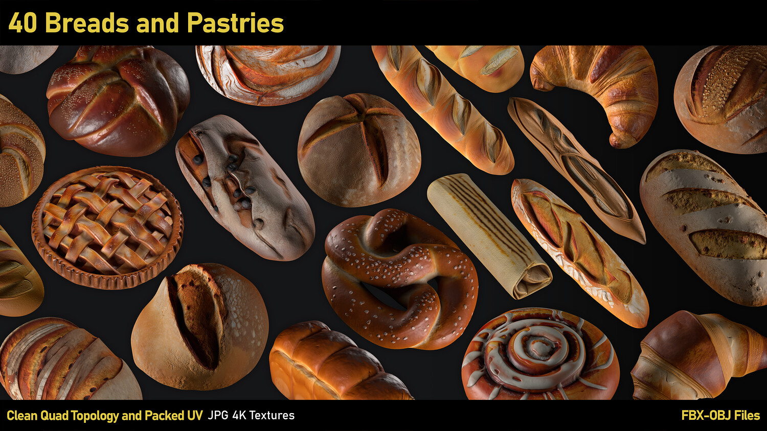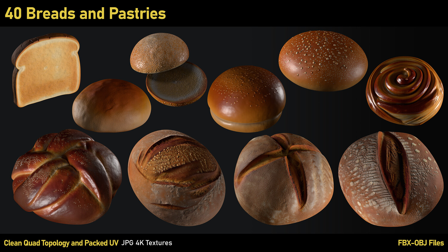 40 sets of Bread and Pastry models in OBJ and FBX 40 sets of 4K Textures-Height-Normal-Roughness-BaseColor HQ rendered Previews The avarage Polycount of the models is around 3K The UVs are packed and non overlapping.