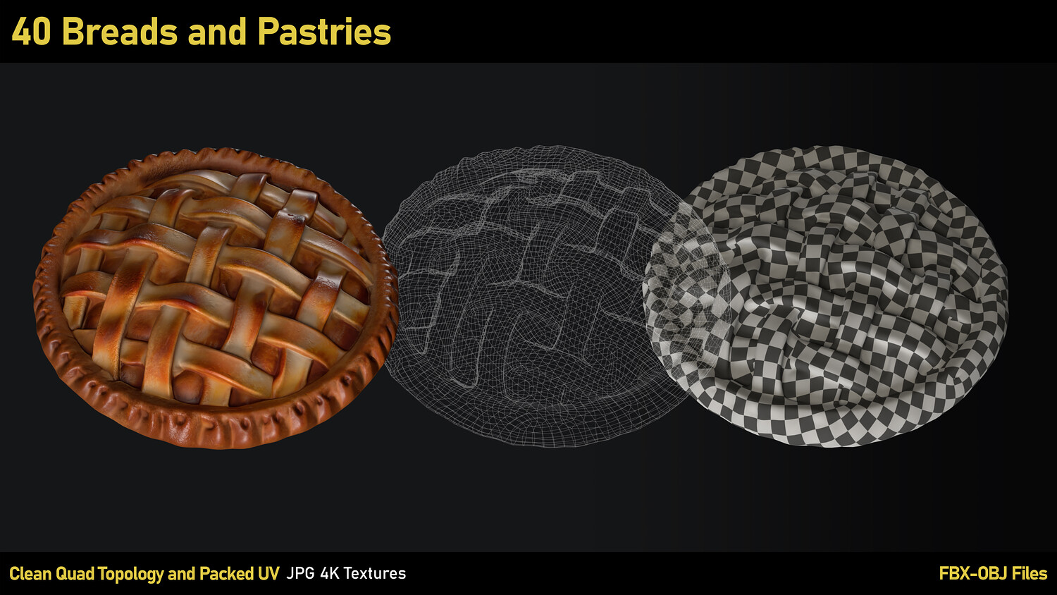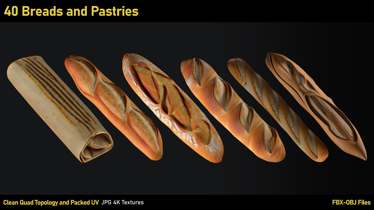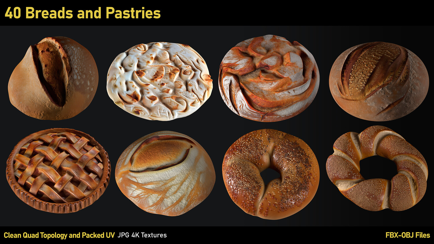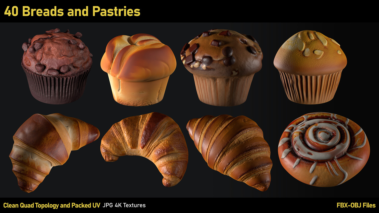 40 sets of Bread and Pastry models in OBJ and FBX 40 sets of 4K Textures-Height-Normal-Roughness-BaseColor HQ rendered Previews The avarage Polycount of the models is around 3K The UVs are packed and non overlapping.