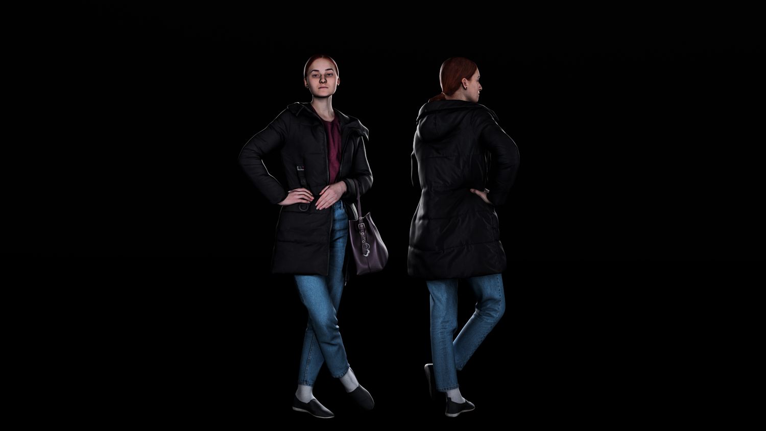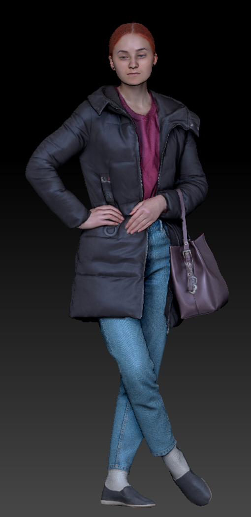 This is a true human size and detailed model of a sporty beautiful young woman of Caucasian appearance dressed in casual style with a bag. The model is captured in casual pose to be perfectly matching for variety of architectural visualizations, e.g. urban installations, city designs, outdoor design presentations etc.