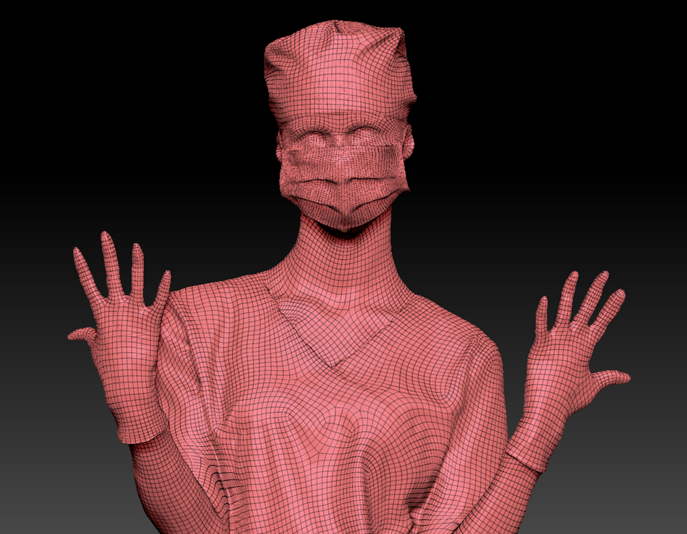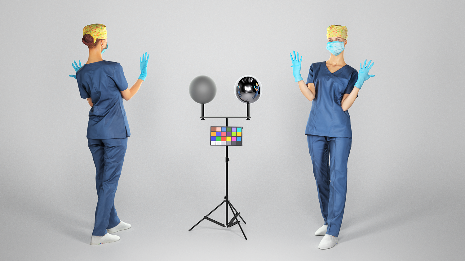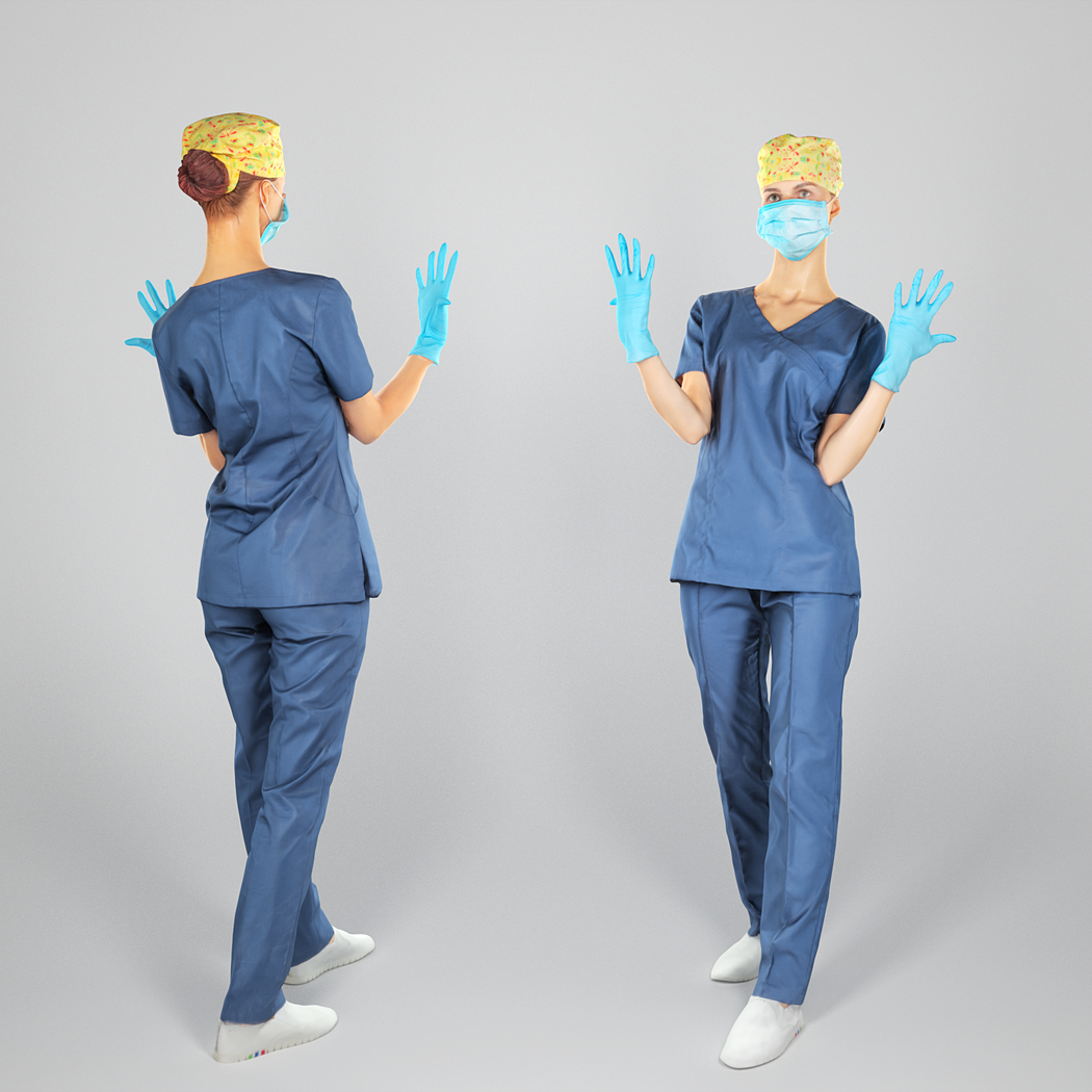 This is a true human size and detailed model of a beautiful young woman of Caucasian appearance dressed in a uniform of a surgical nurse. The model is captured in casual pose to be perfectly matching to variety of architectural visualization, background character, product visualization, e.g. advert banners, professional products/devices presentations, etc.
