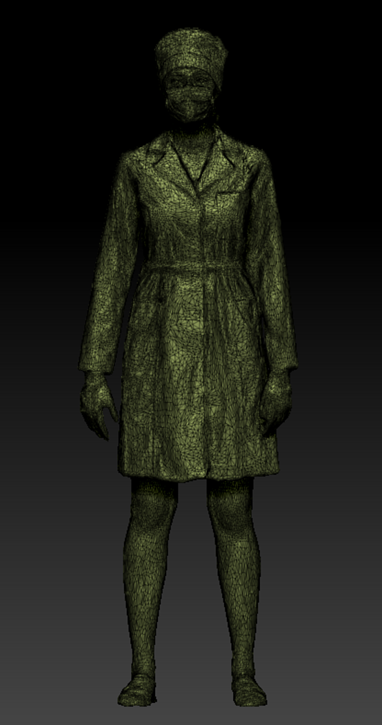This is a true human size and detailed model of a beautiful young woman of Caucasian appearance dressed in a uniform of a surgical nurse. The model is captured in casual pose to be perfectly matching to variety of architectural visualization, background character, product visualization, e.g. advert banners, professional products/devices presentations, etc.