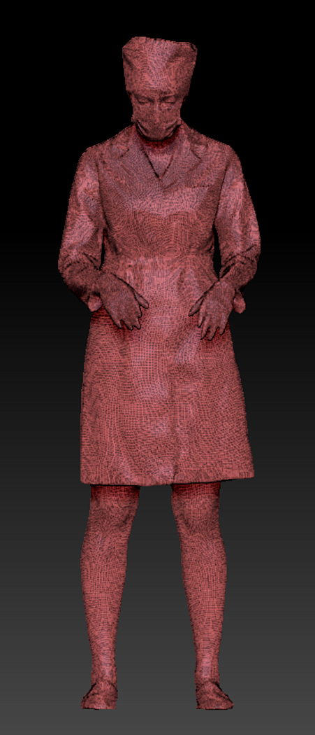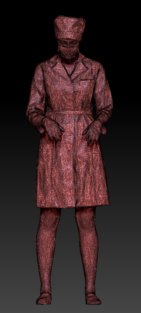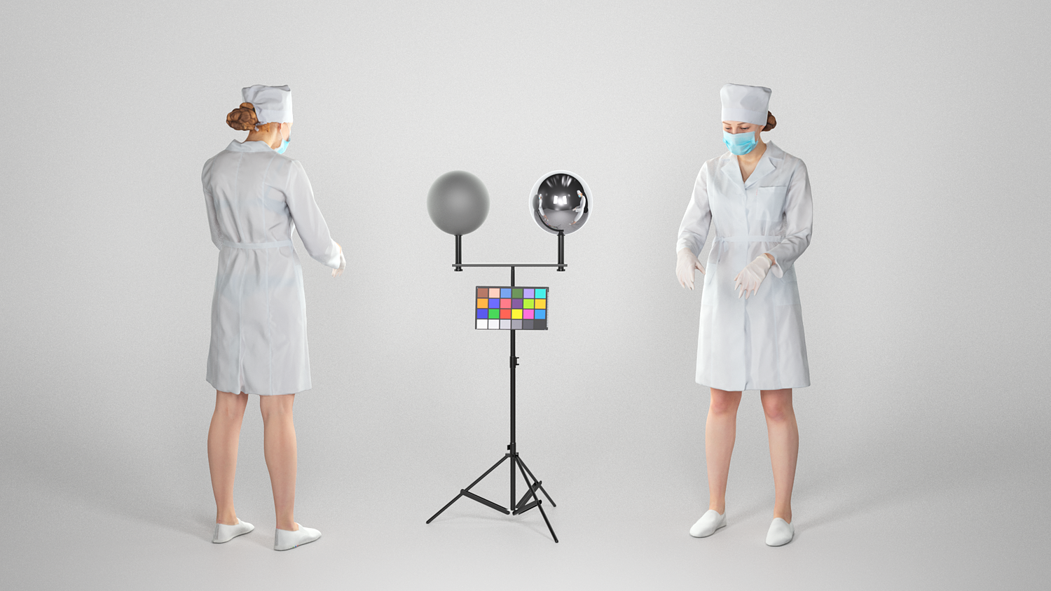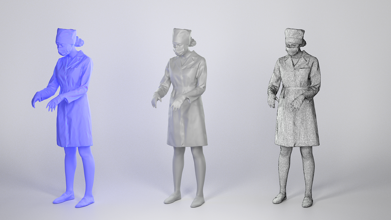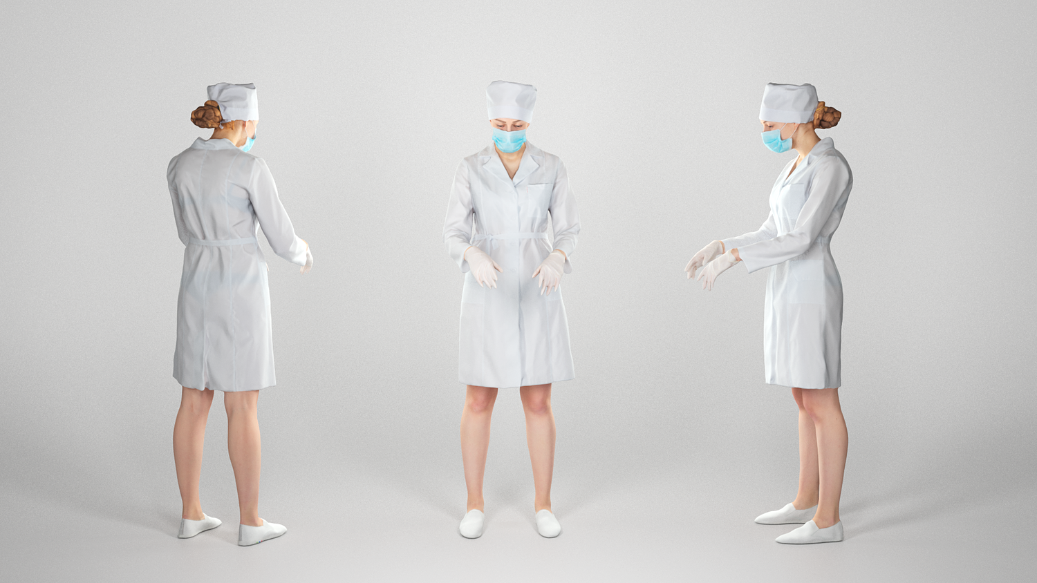 This is a true human size and detailed model of a beautiful young woman of Caucasian appearance dressed in a uniform of a surgical nurse. The model is captured in casual pose to be perfectly matching to variety of architectural visualization, background character, product visualization, e.g. advert banners, professional products/devices presentations, etc.