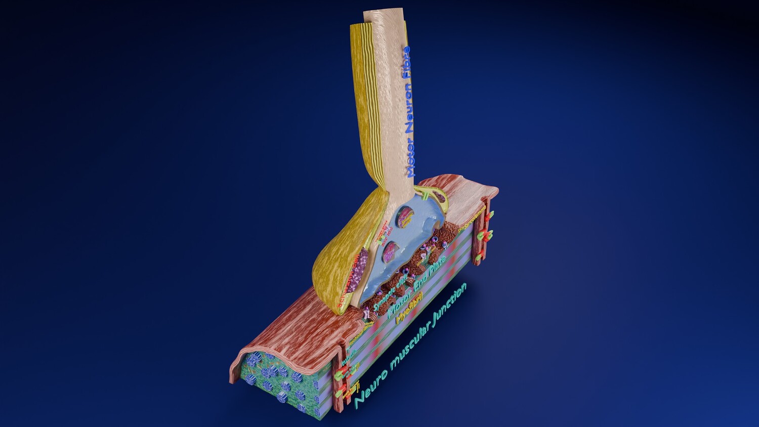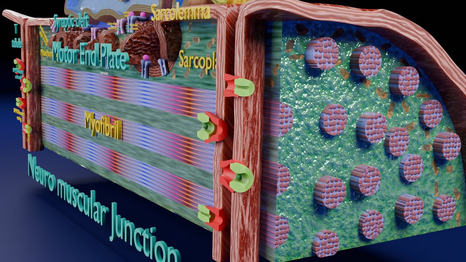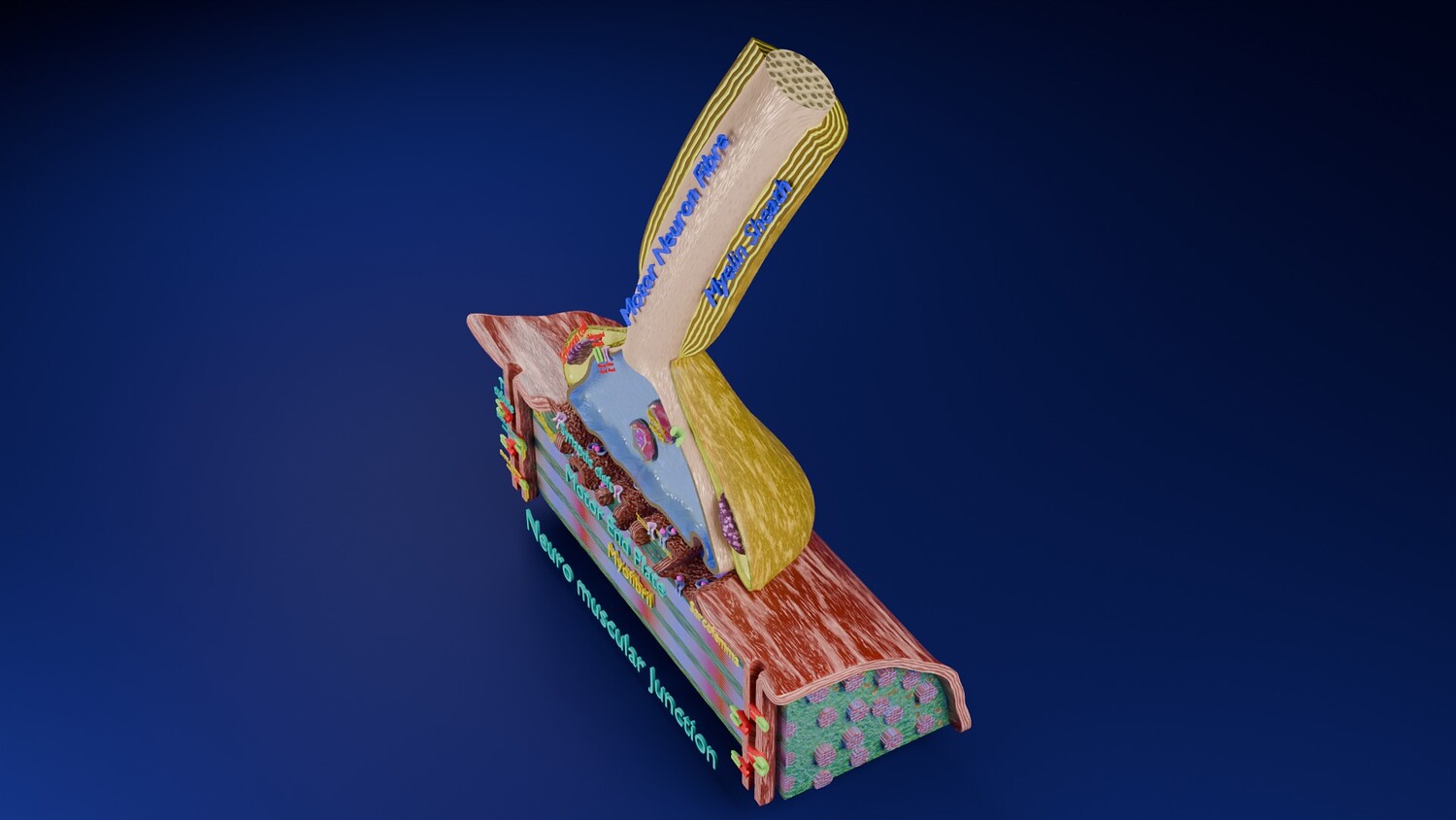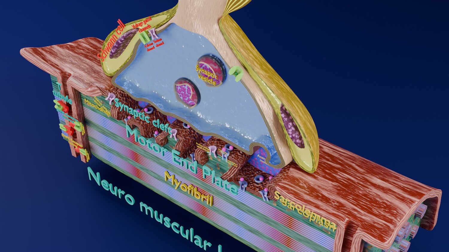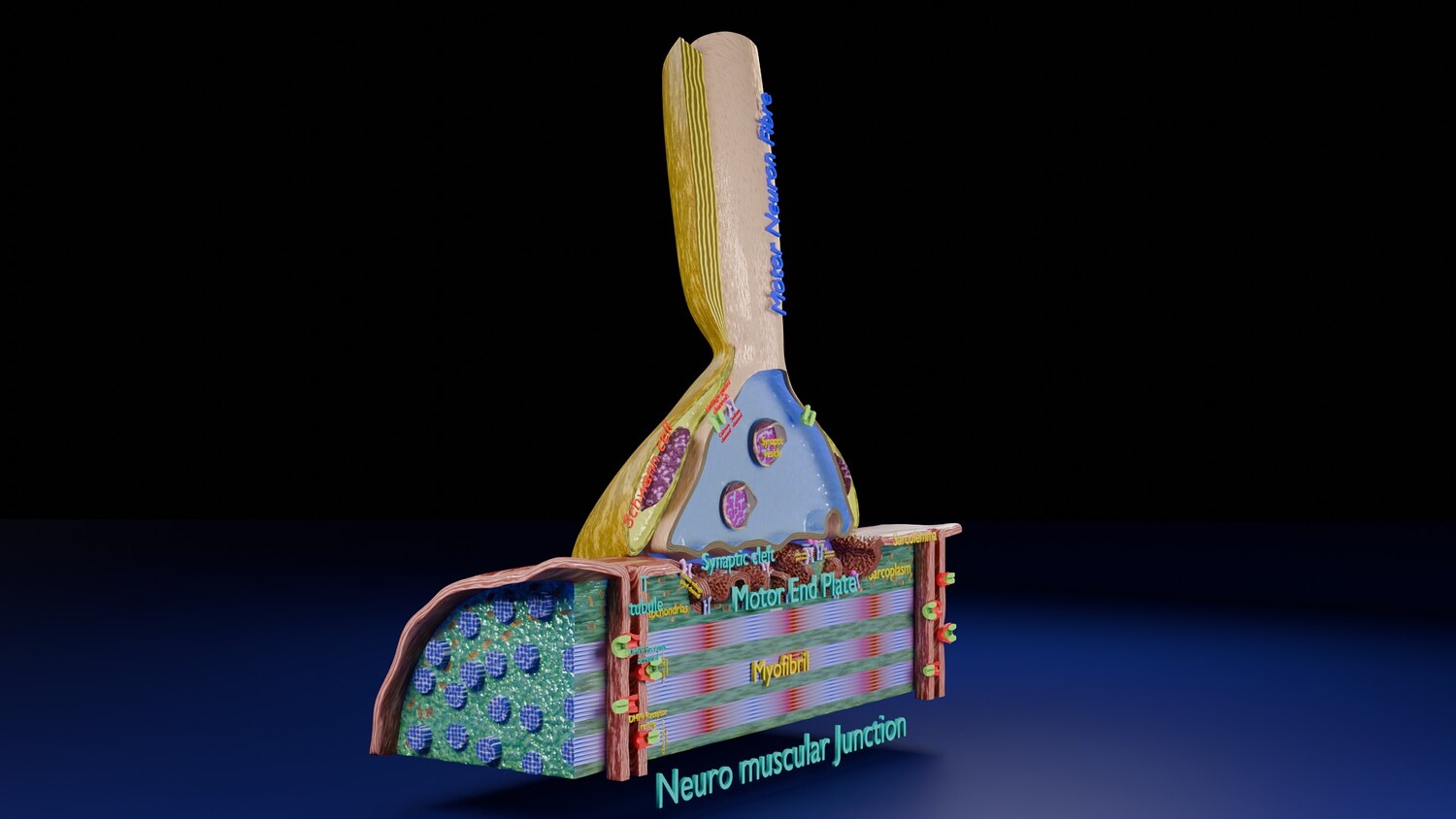 The model schematically depicts the neuromuscular junction structural and ultra structural details. The neuron ends have voltage gated sodium and calcium channels which releases acetylcholine molecules stored in synaptic vesicles into the synaptic cleft. The receptors present in motor end plate and T tubules of muscle fibre finally increase intacelluar calcium which leads to muscle contraction Excellent model for teaching, demonstration and knowledge of human body. The models include both procedural and image textures blend files separately. The texture file includes diffuse, roughness, and normal png and jpeg based on non-overlapping UV maps. The formats 3mf, ply, obj, fbx, USDZ, GLTZ & GLB with applied uv mapped textures have also been included in the downloads along with stl. I have included the various formats needed by various customer for the various 3d modelling software they may be using. The following formats are compressed in rar formats:- 1. blend 2. 3mf 3. stl 4. obj 5. fbx 6. glb 7. gltz