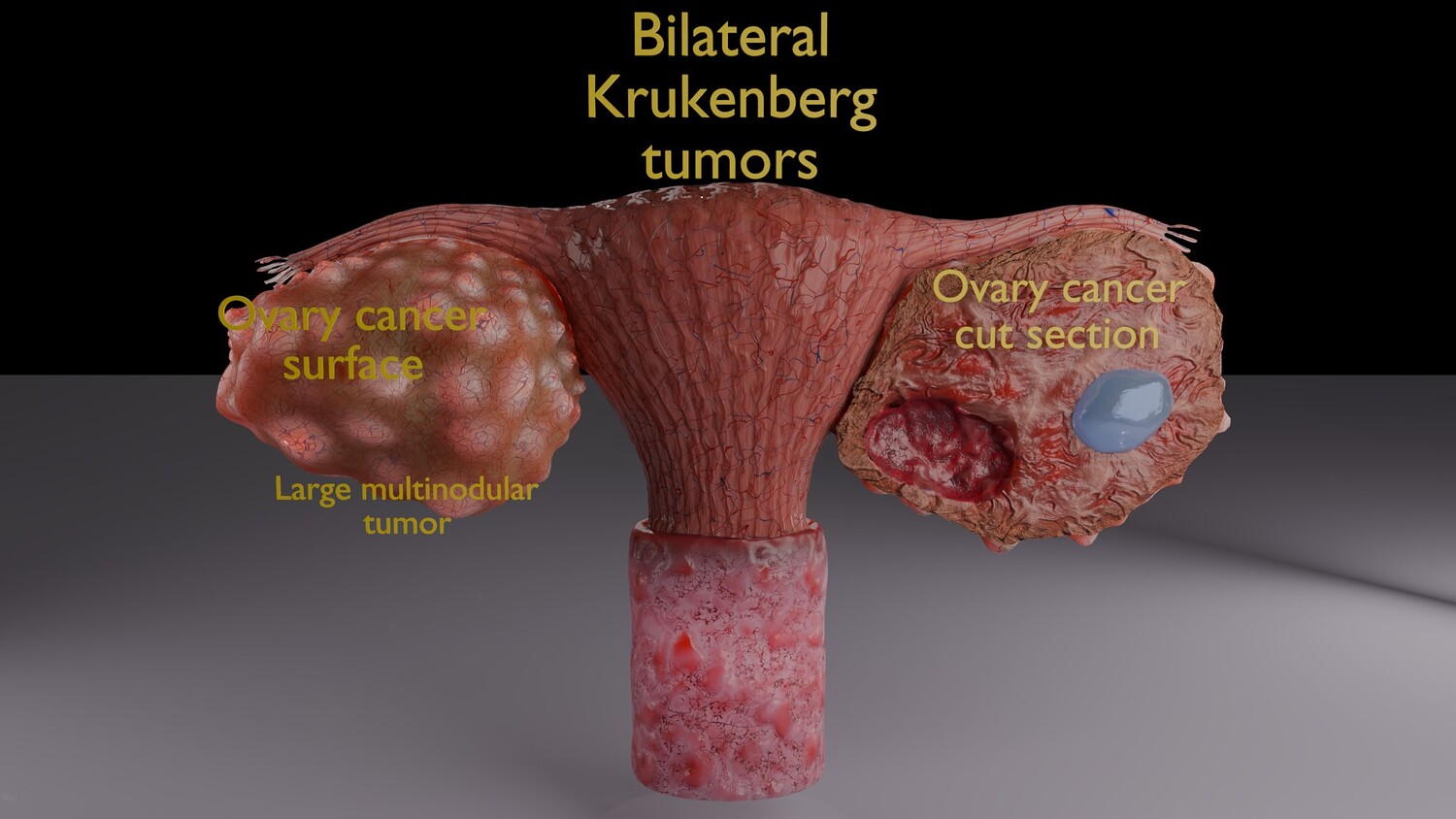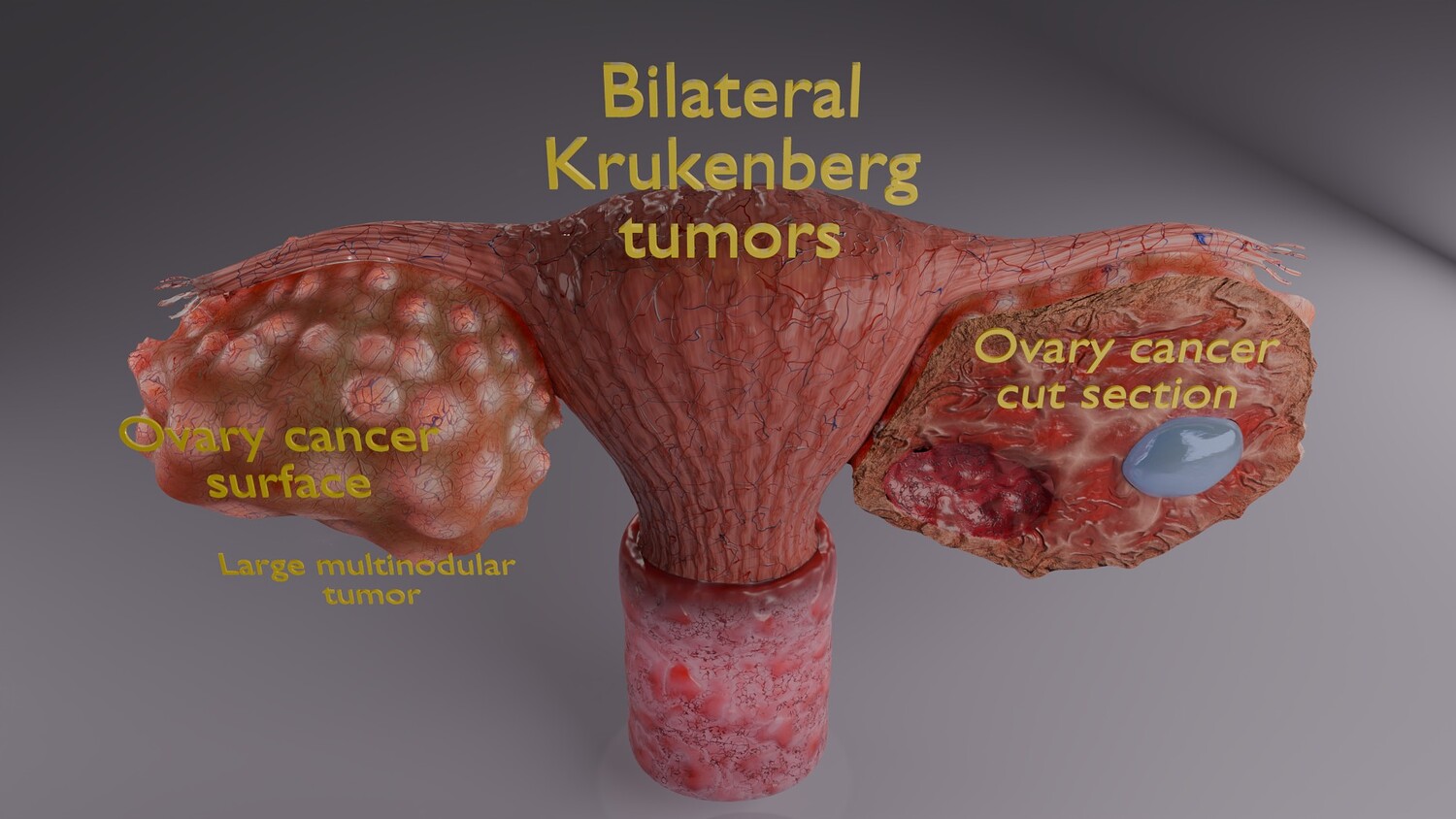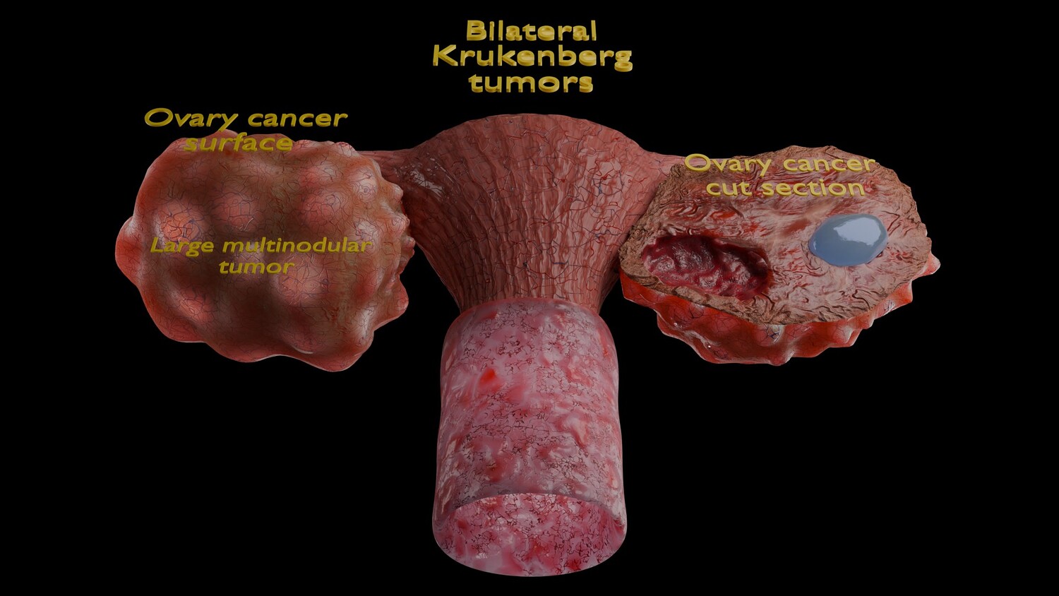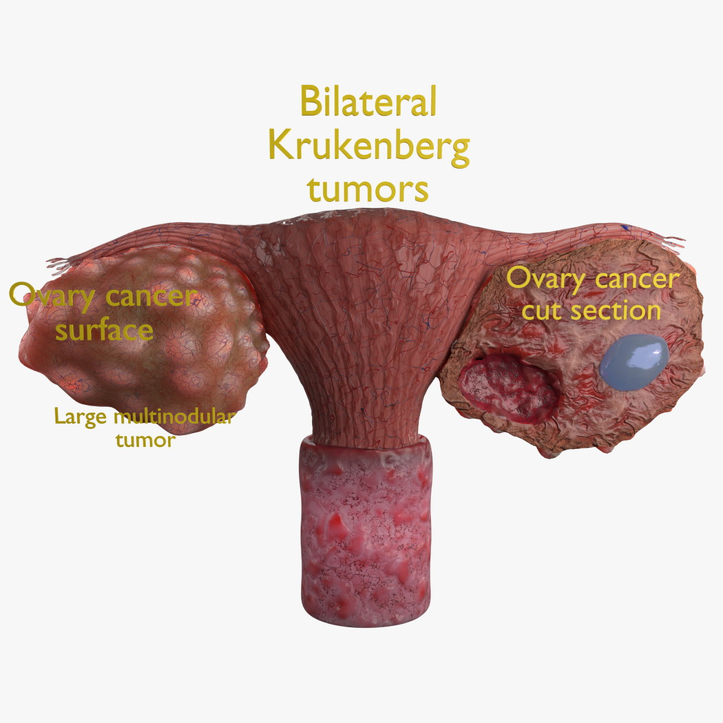 The model shows a Krukenberg tumor. It is a cancer in the ovary that metastasized from a primary cancer of other body site, classically the stomach pyloric cancer and the breast. Excellent model for teaching, demonstration and knowledge of biology. The models include both procedural and image textures blend files separately. The texture file includes diffuse, roughness, normal and metal jpeg based on non-overlapping UV maps. The formats 3mf, ply, obj, fbx,, GLTZ & GLB with applied uv mapped textures have also been included in the downloads along with stl. I have included the various formats needed by various customer for the various 3d modelling software they may be using. The following formats are compressed in rar formats:- 1. blend 2. 3mf 3. stl 4. obj 5. fbx 6. glb 7. gltz 8. textures